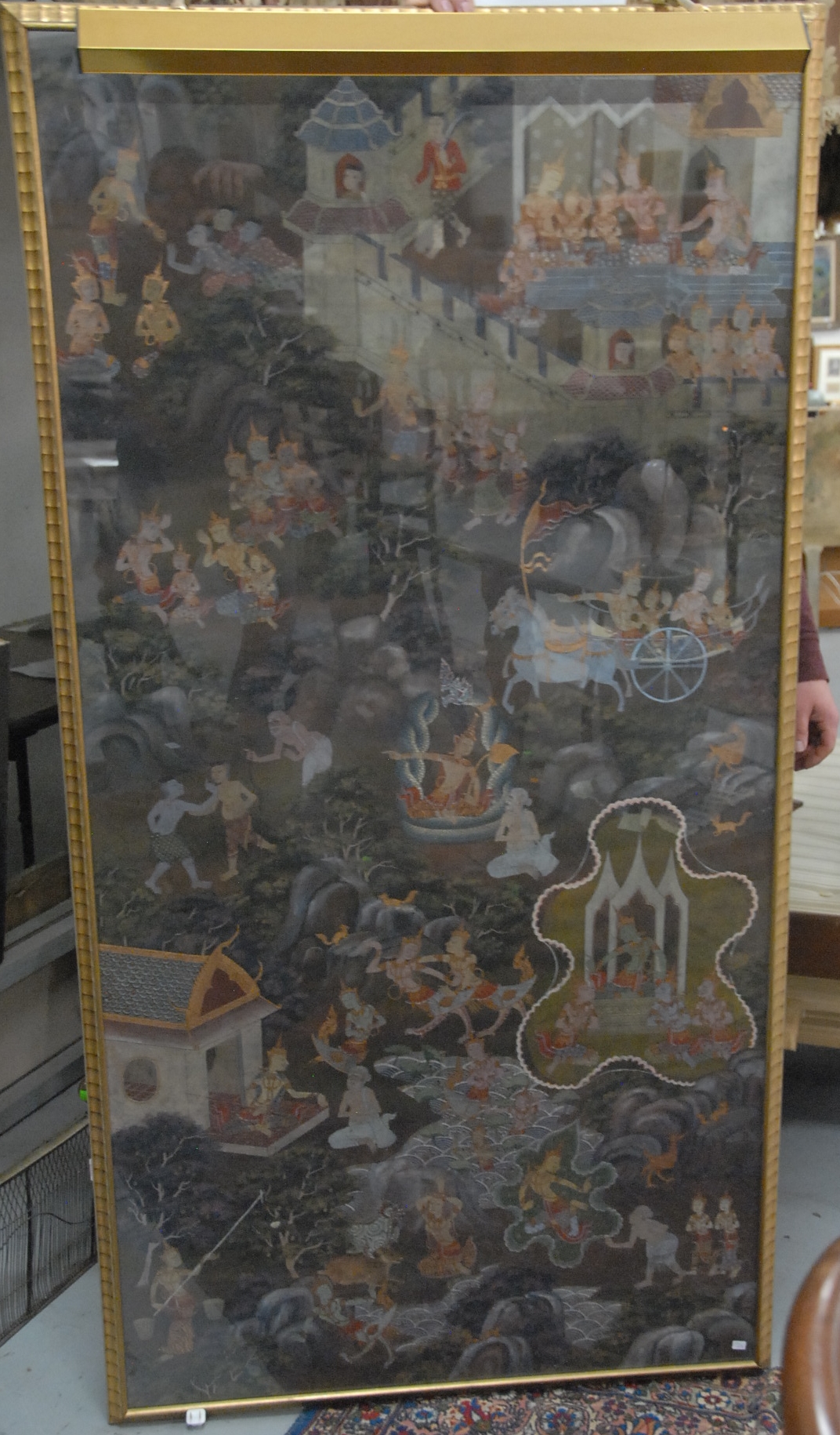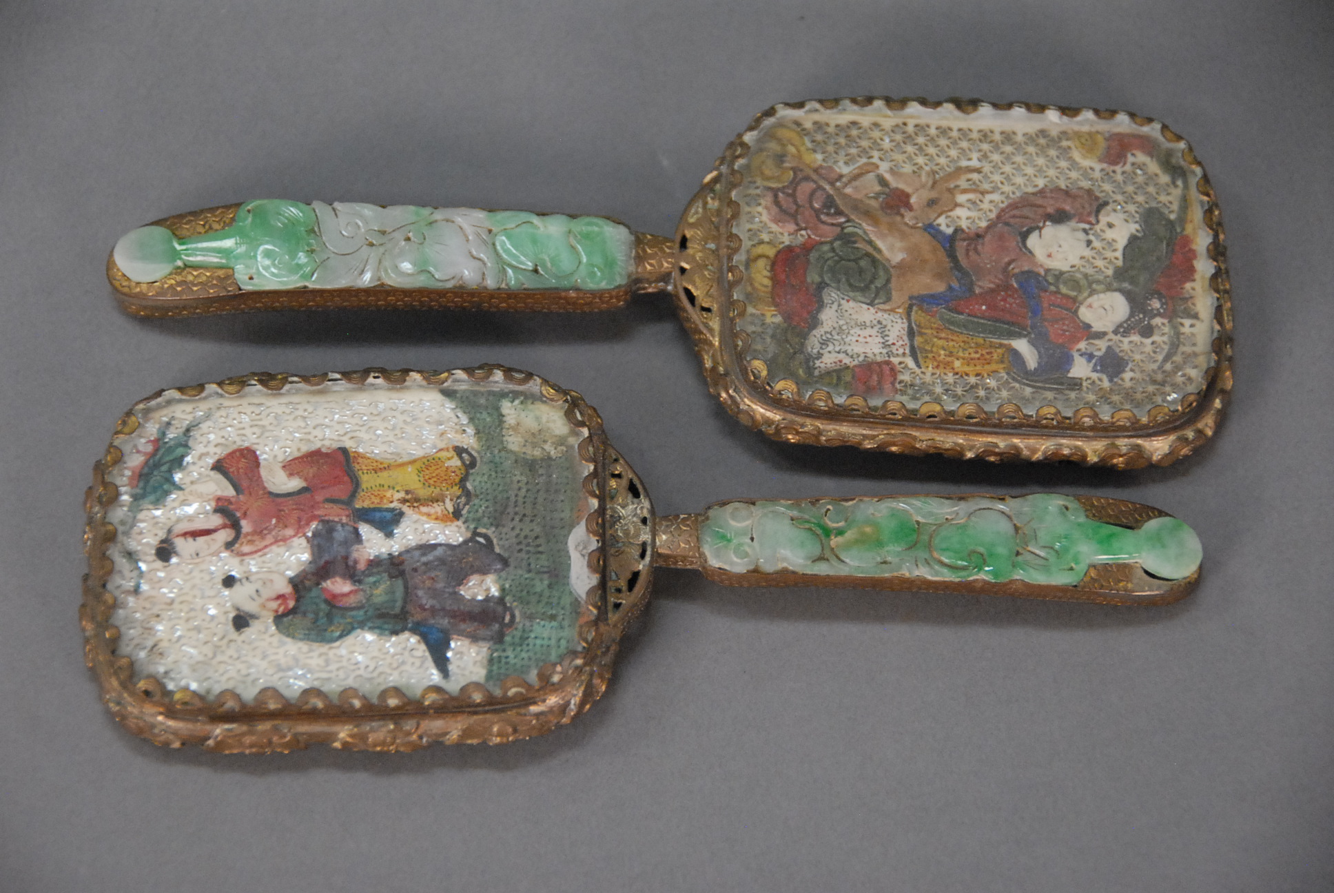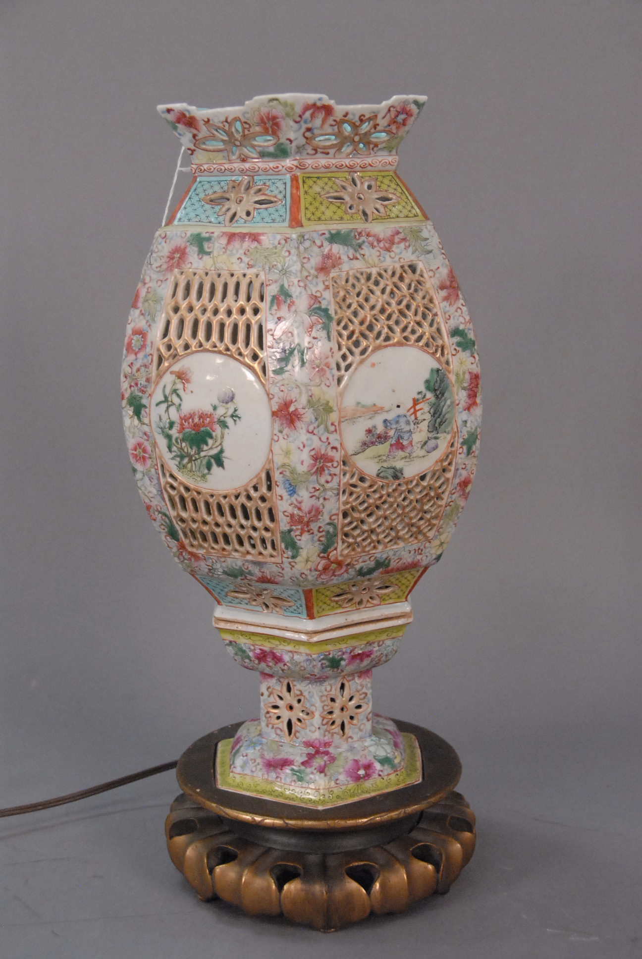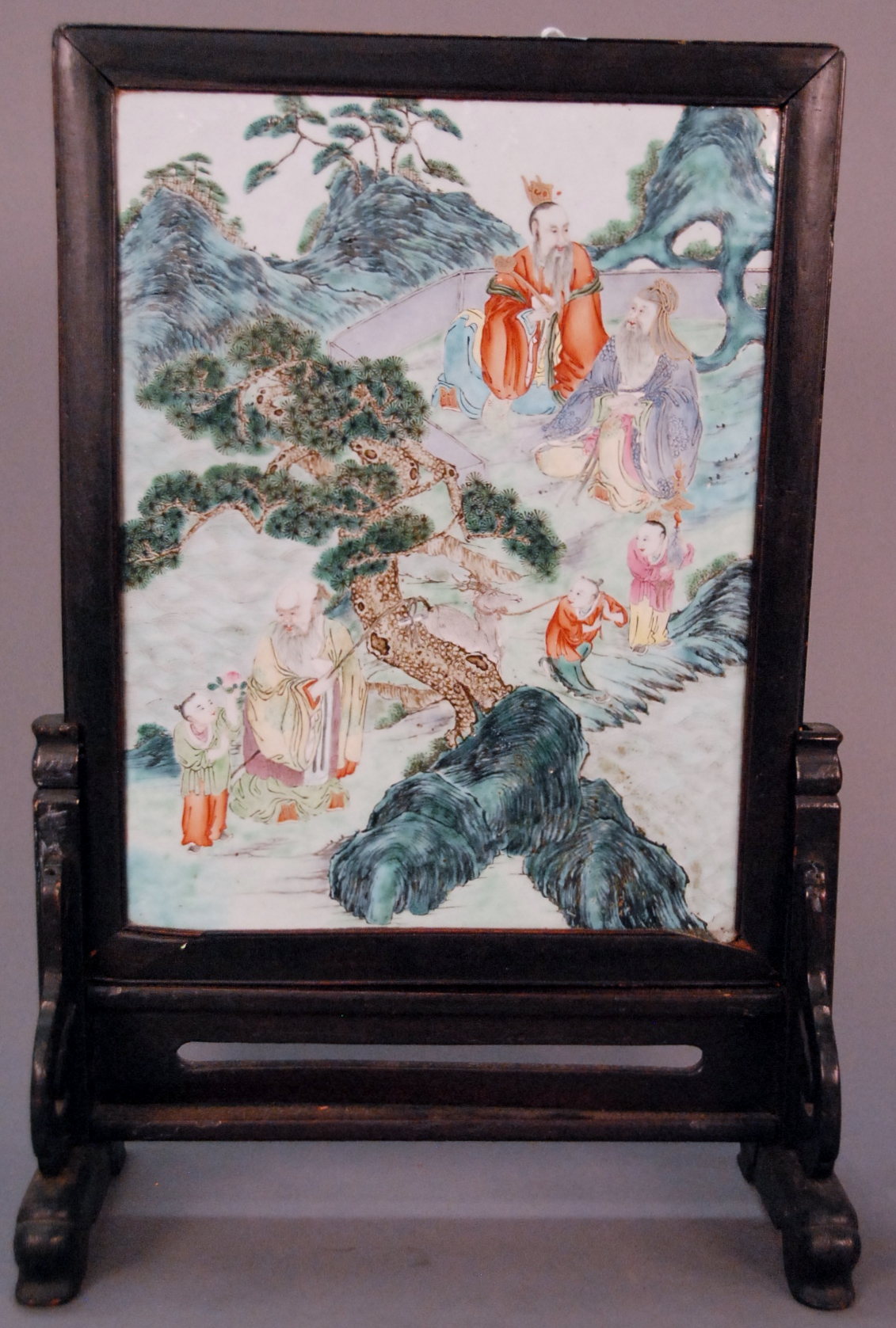 Famille rose framed porcelain plaque with stand, finely painted depicting Fu-sing, Wu-sing and Shou-lao with child attendants, China, 19th century. Plaque: 12 x 15