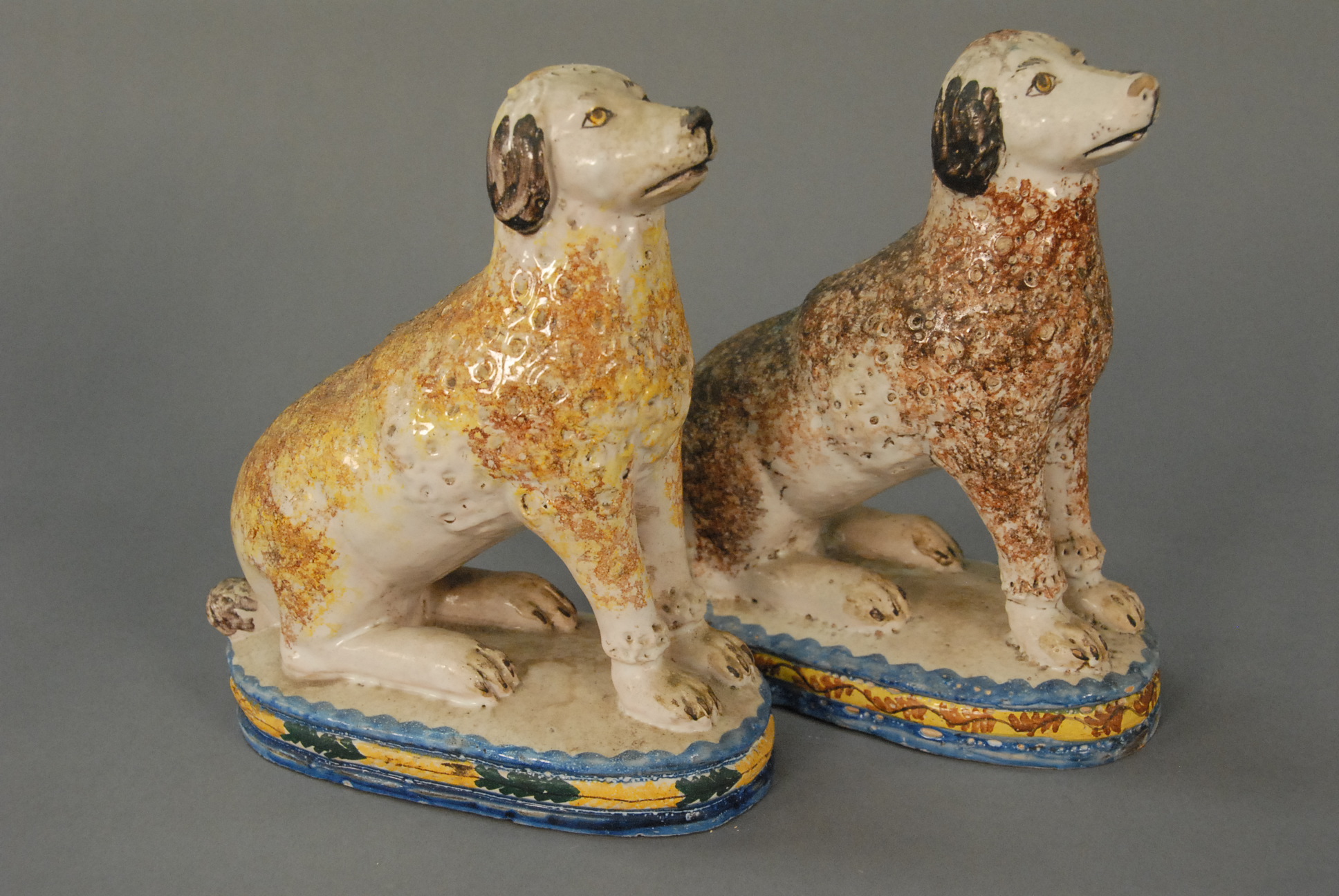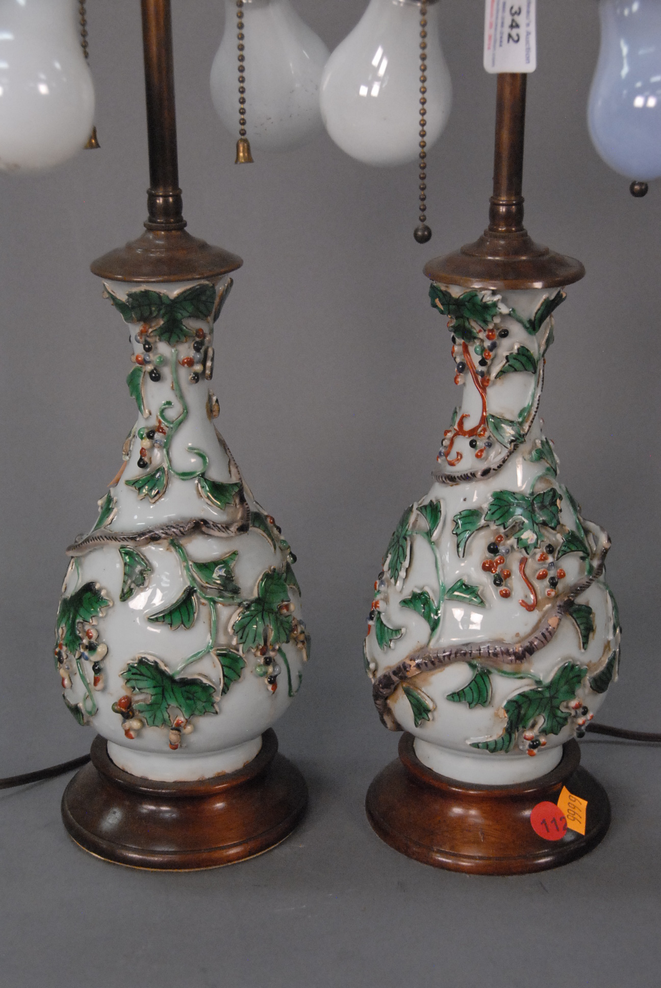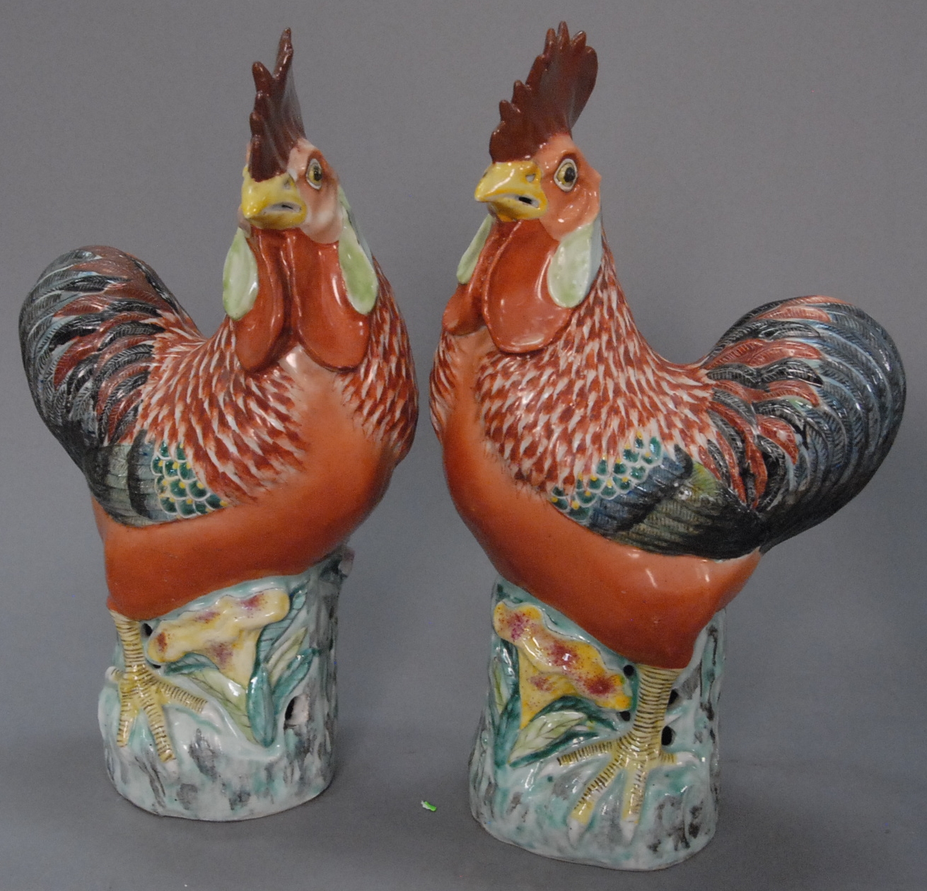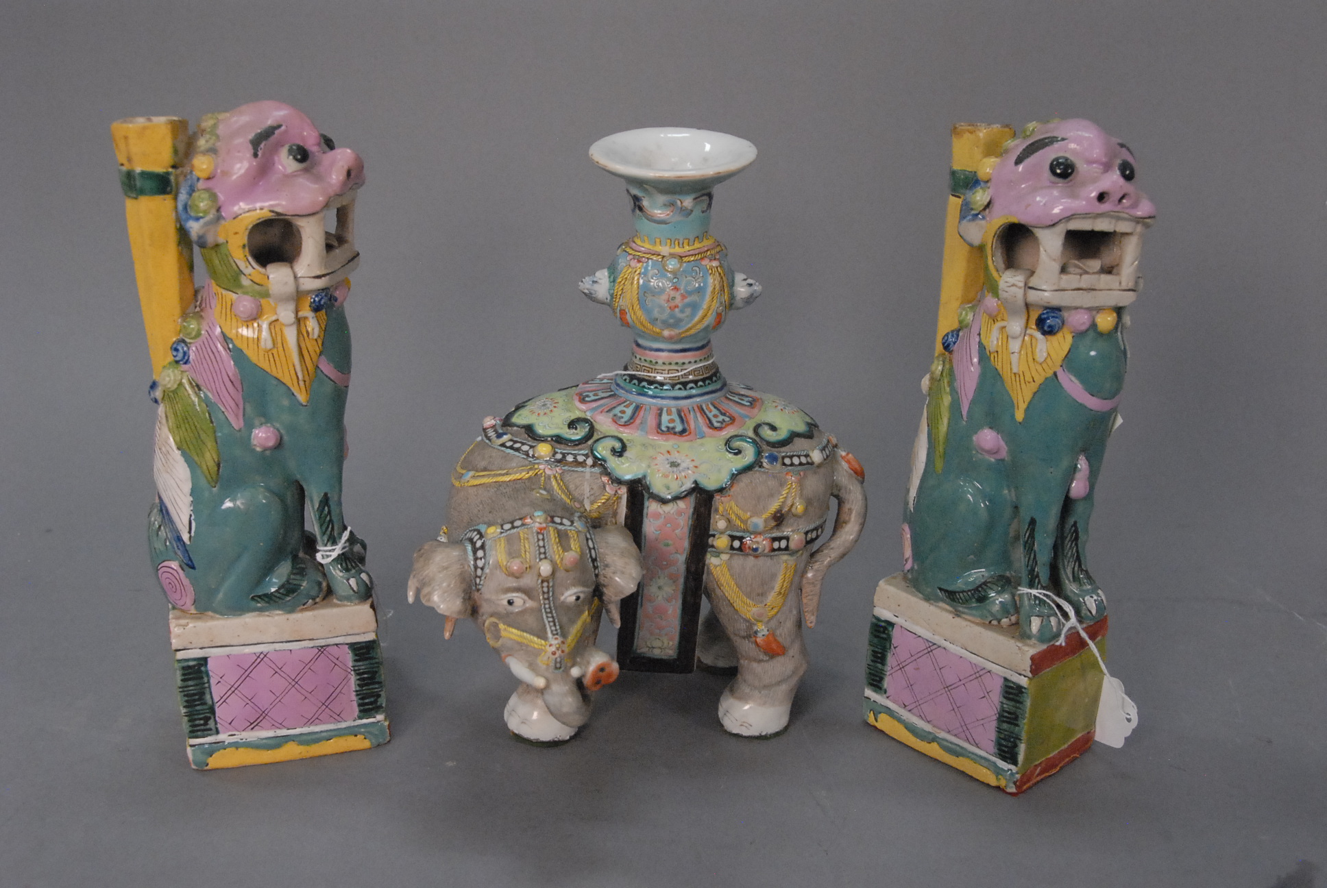 Three piece lot to include a pair of Chinese Export porcelain famille rose foo lion form spill vases, each stylized lion bearing their teeth and seated on rectangular base, in tones of rose, turquoise, chartreuse, iron-red, and black, early 20th century. ht. 10in. lg. 3in. along with a Chinese Export porcelain famille rose elephant form jos stick holder modeled as a stylized elephant, his mid-back issuing a shaped candlestick, in tones of gray, pink, chartreuse, turquoise, and yellow, early 20th century. ht. 9in. lg. 8 3/4in.