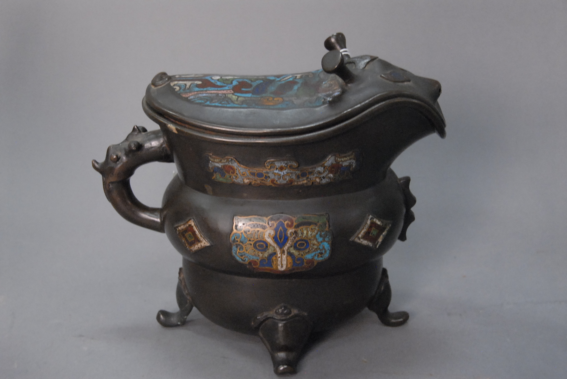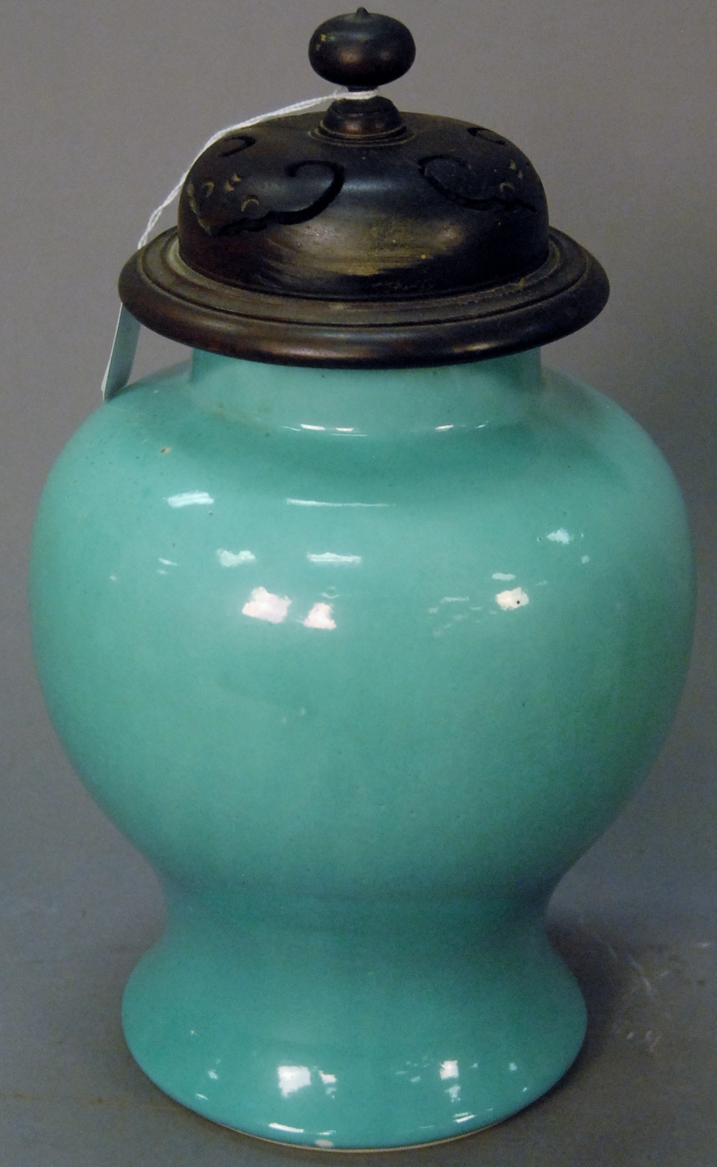 Two piece lot to include monochrome green covered baluster jar marked with underglaze blue double rings, wooden cover, China, 19th century. ht. 12in. and small Round Hirado Vase dragon, Japan, 19th century damage to mouth. ht. 5in.
