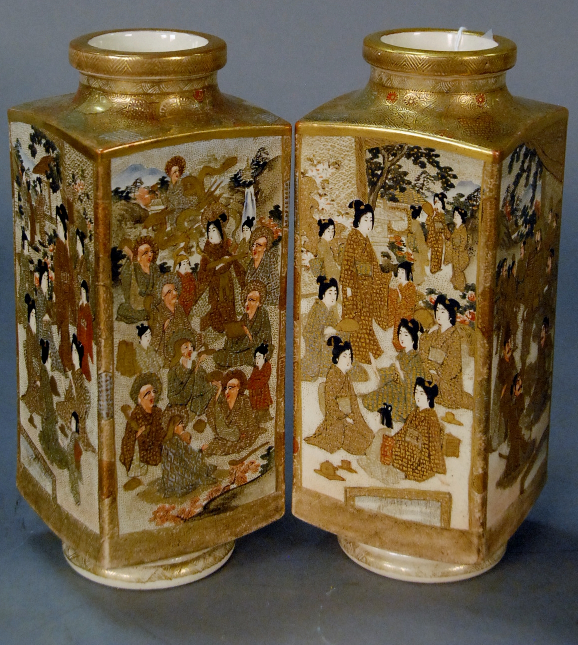 Fine pair of Satsuma quadrangular vases decorated with panels of women, samurai and Rakhans/apostles in autumnal setting, marked Satsu Ma and possibly of the Kinkozan workshop, Japan, 19th century. ht. 10in.