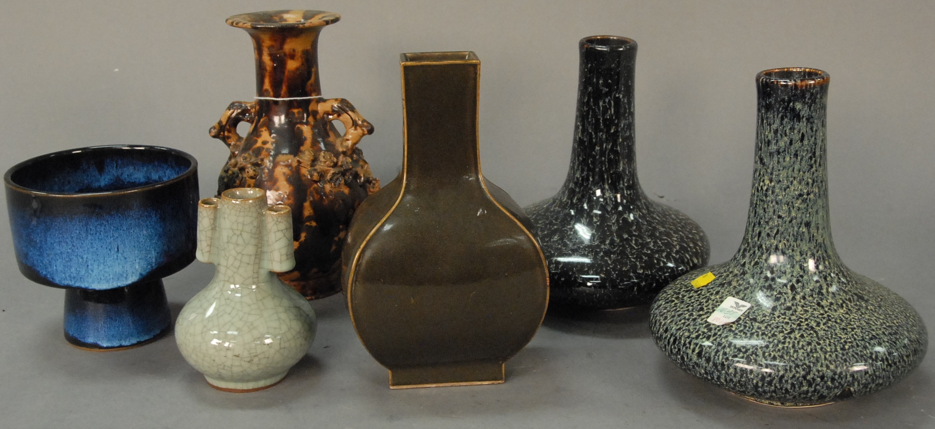 Five piece lot to include small globular vase with tubular handles and celadon crackle glaze ht. 5 1/2in., flower vase of squared globular shape with dark teadust glaze drilled and plugged 9 1/4in., footed bowl with blue flamb glaze and impressed mark ht. 5 1/4, earthenware vase of globular shape with prunus handles and applied blossoms in brown splashed faux bois glaze portion of one petal missing ht. 9in., Earthenware vase of compressed globular shape with overall brown splashed glaze on black ground, impressed stamp, China, 20th century ht. 9in. along with an Eartenware vase.