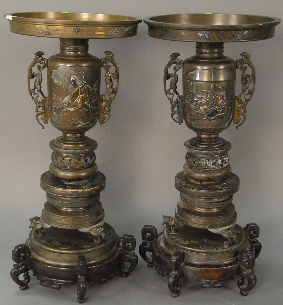 Pair of Japanese bronze floor vases, each with multi-metal, gold, silver, and copper highlighted scenes and samurai warriors, each in three parts plus wood stands. ht. 24 1/2in. dia. 13 1/4in.