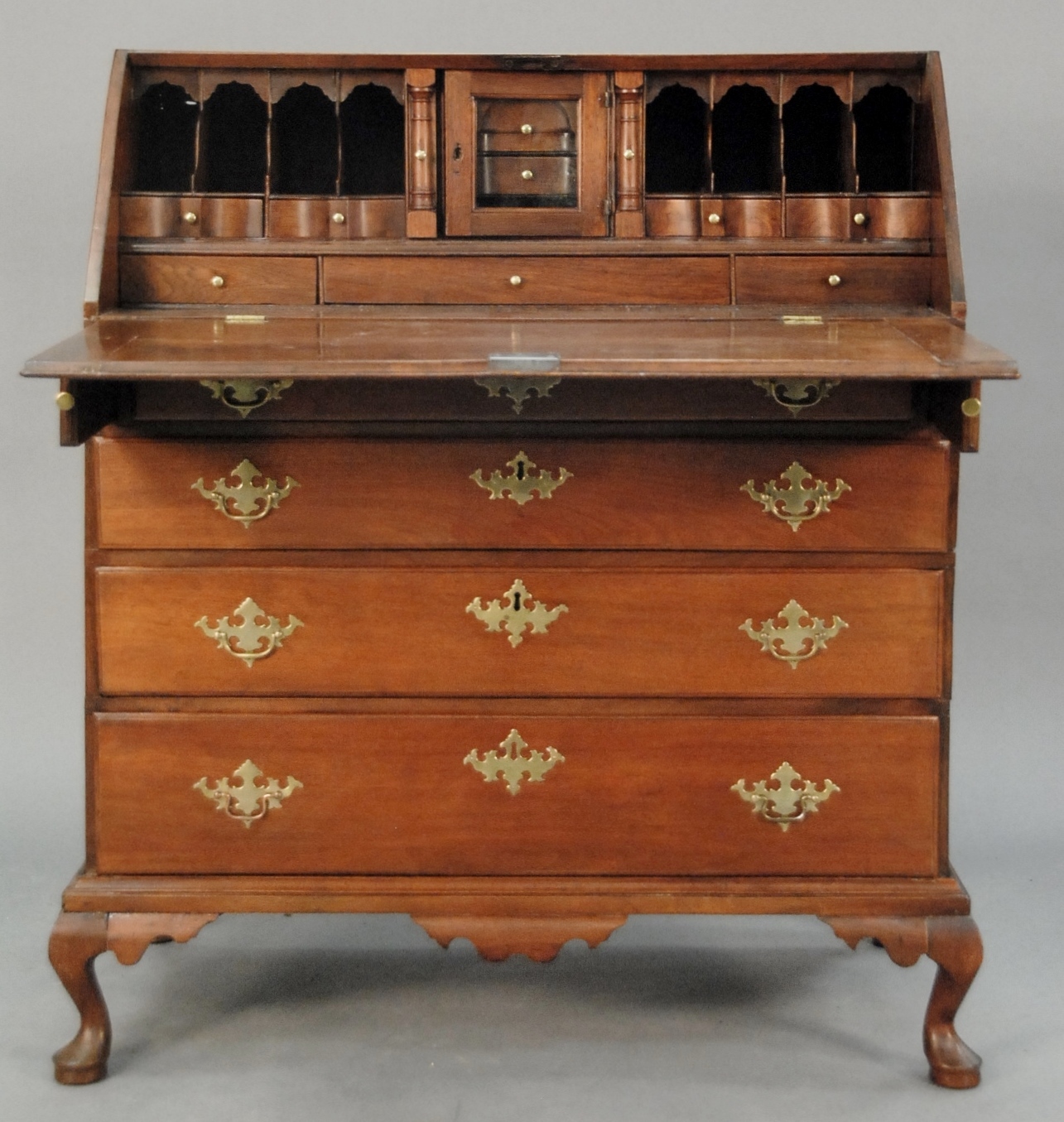 Rare Queen Anne walnut desk having slant front over four graduated drawers all set on short cabriole legs, interior with row of short drawers over three long drawers, two pillar drawers and two block drawers behind door with glass panel, original hardware, Connecticut circa 1750. case ht. 43in. wd. 35 3/4in. dp. 18 3/4in.