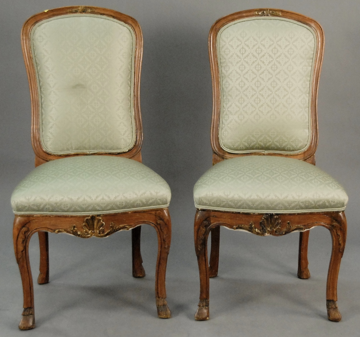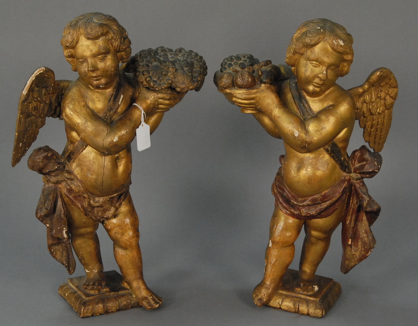 Continental Baroque style carved and giltwood mirror, pitch pediment surmounted by reclining figures, flanking a cherubim, the outset base with applied rosettes, 18th century. ht. 45in. wd. 29in.