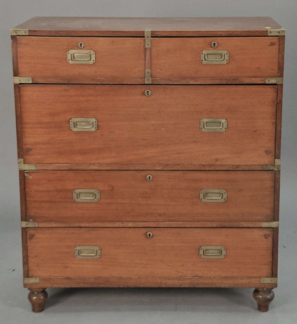 Campaign chest in two parts, upper section with two drawers over lower section with two long drawers all set on turnip feet with brass mounts and brass pulls.