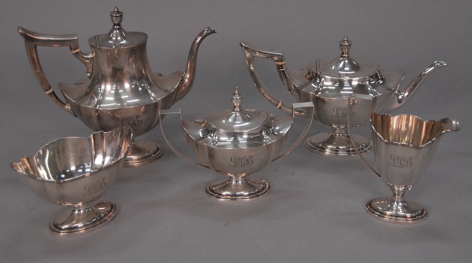Sterling silver flatware set, setting for twelve including 12 dinner forks, 11 luncheon forks, 12 soup spoons, 19 teaspoons, 12 butter knives, 12 dinner knives. 98.2 t oz. plus 12 handles. total approximate 106 t oz.