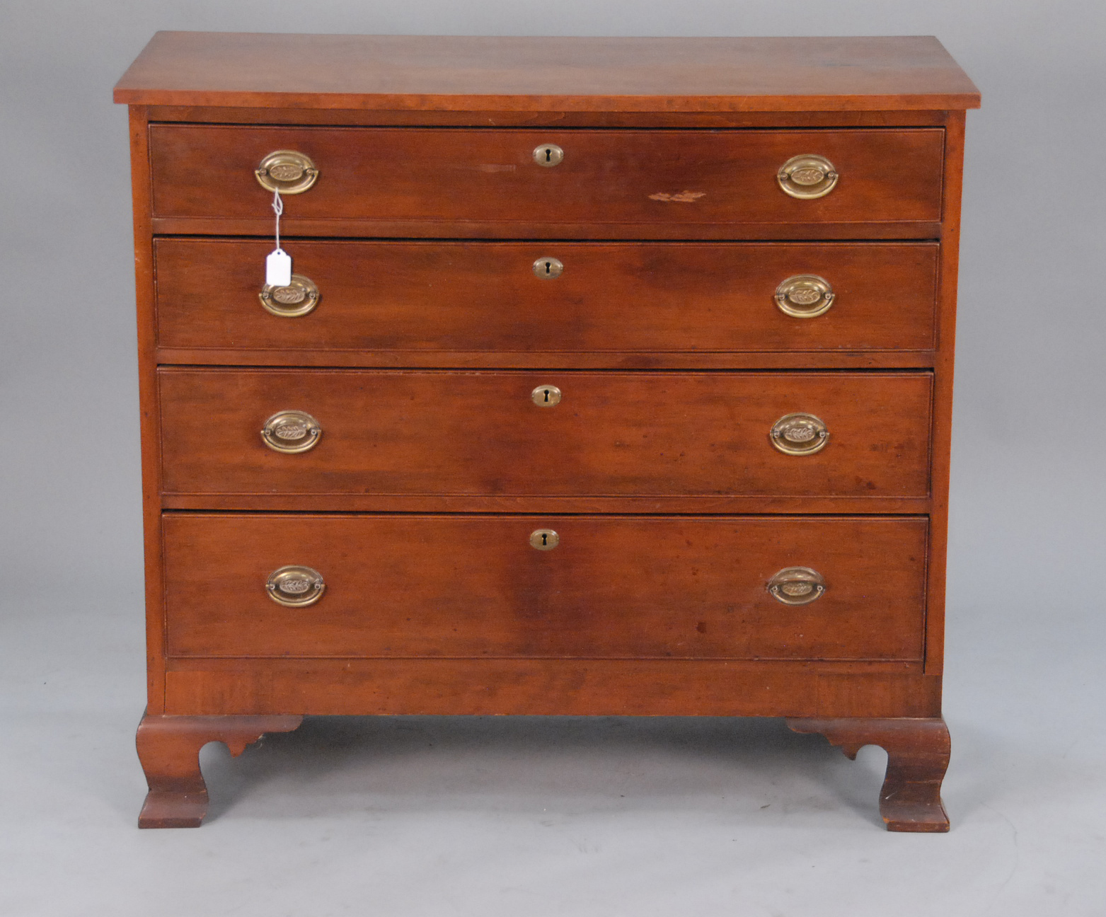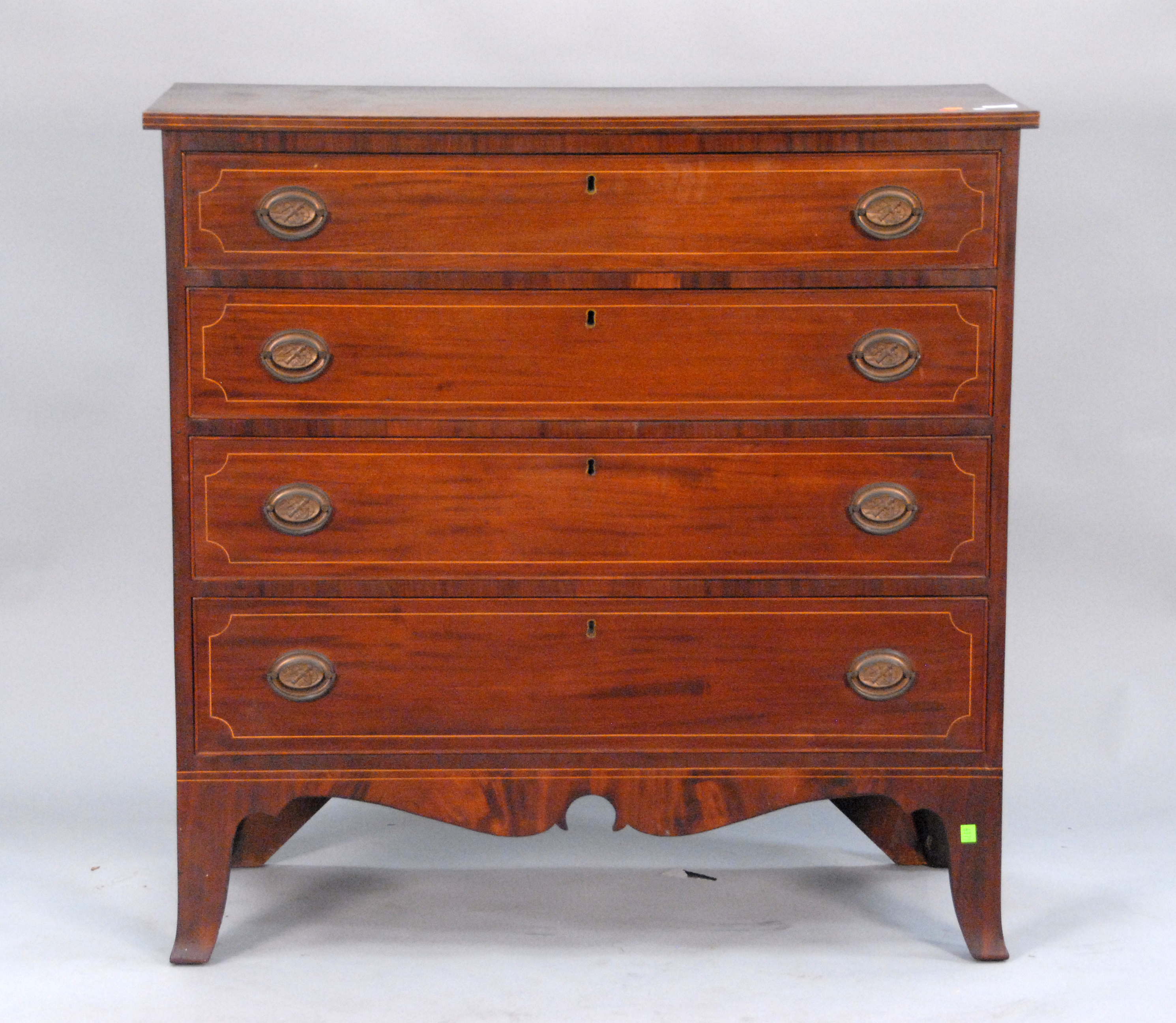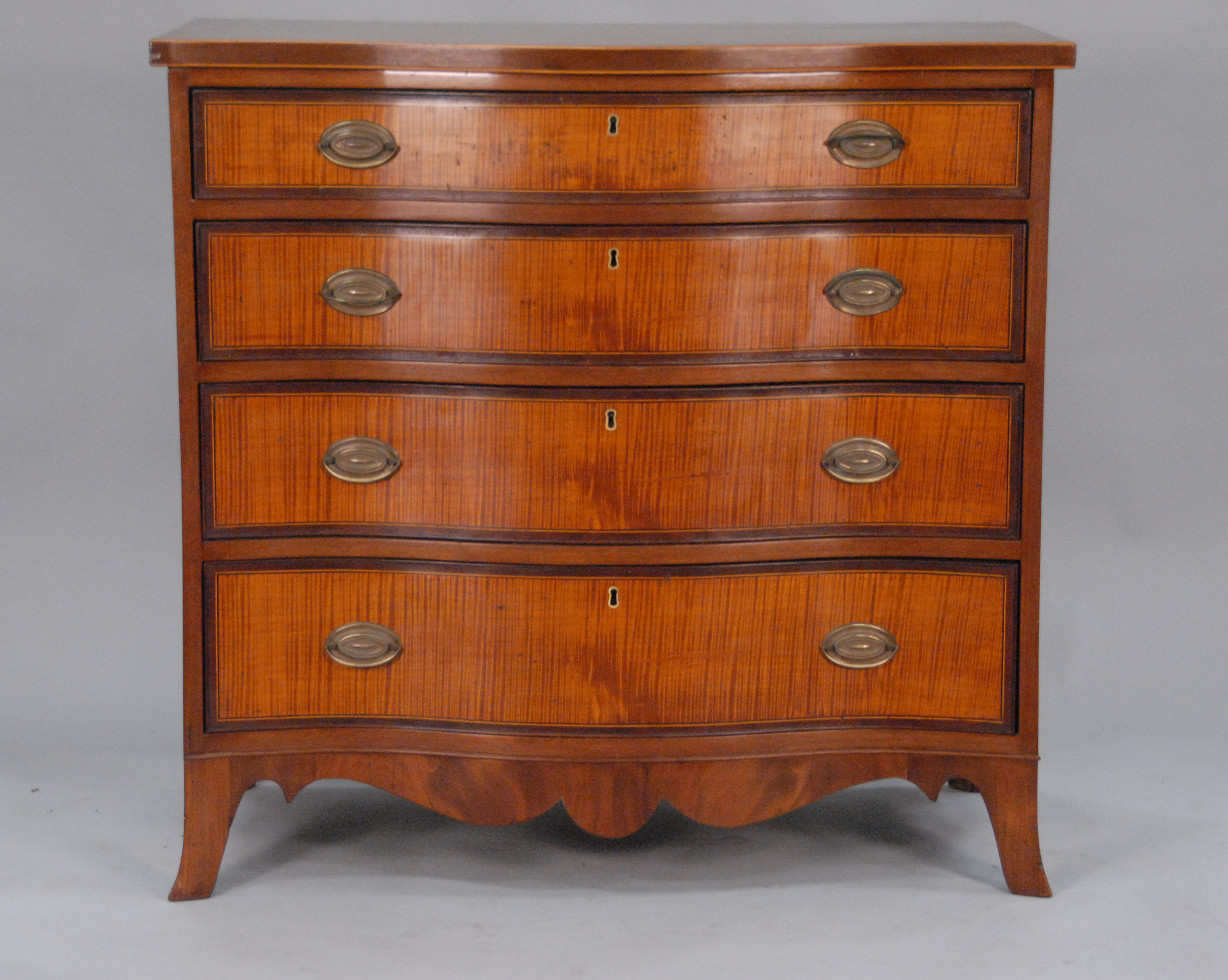 Federal mahogany four drawer chest with serpentine top over conforming case all set on French feet, drawers with tiger maple drawer fronts. ht. 38in., wd. 37 1/2in., dp. 21 1/2in.