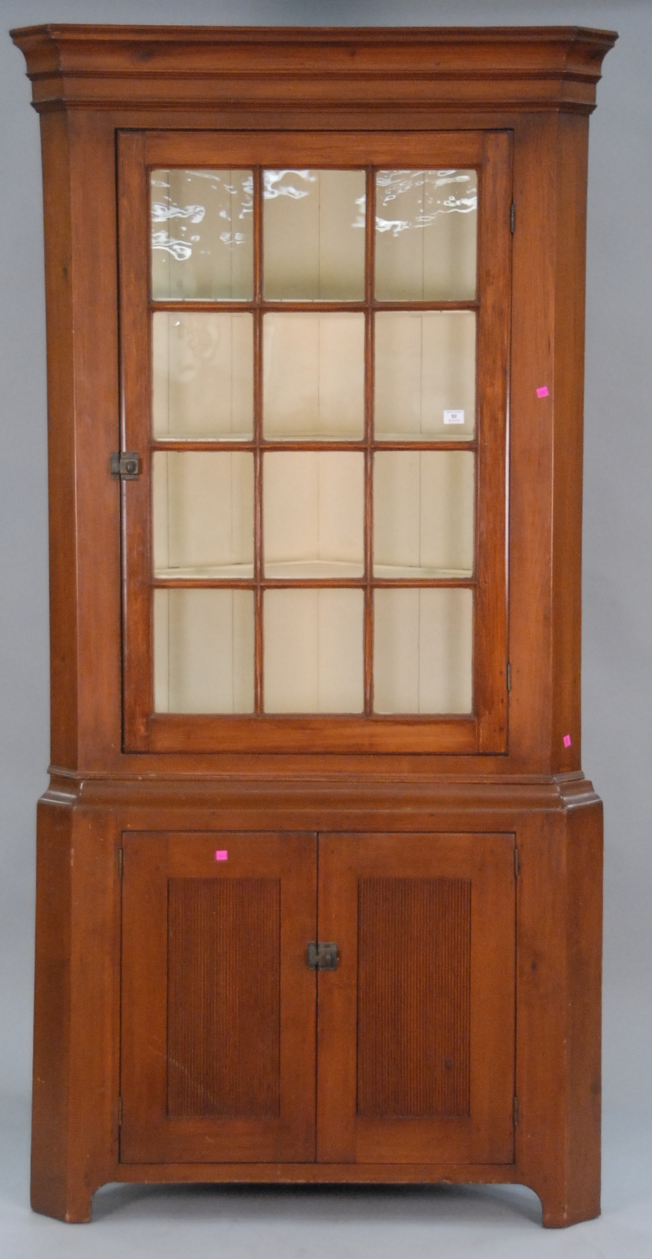 Corner cupboard in two parts, upper section with large cornice molding and one glazed door with twelve glass panels on lower section with two blind doors carved in tambour style. ht. 89in. wd. 42in. dp. 29in.