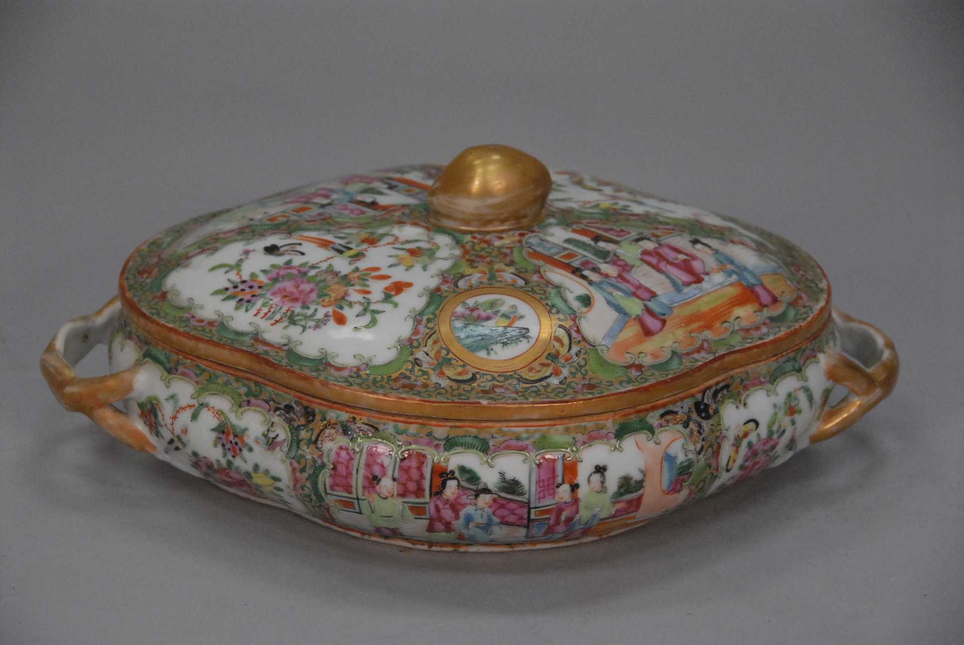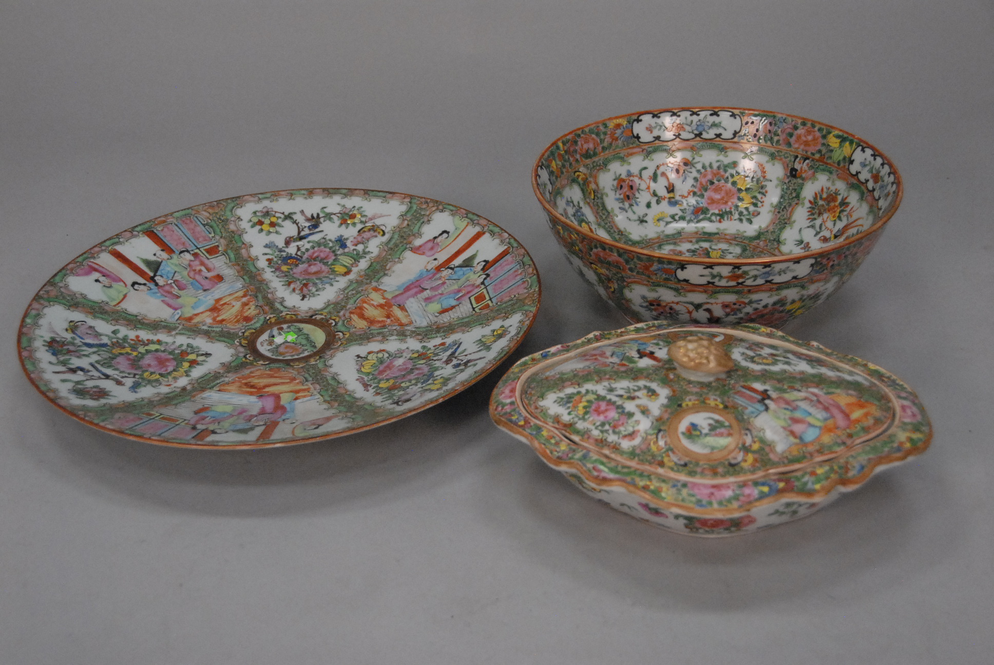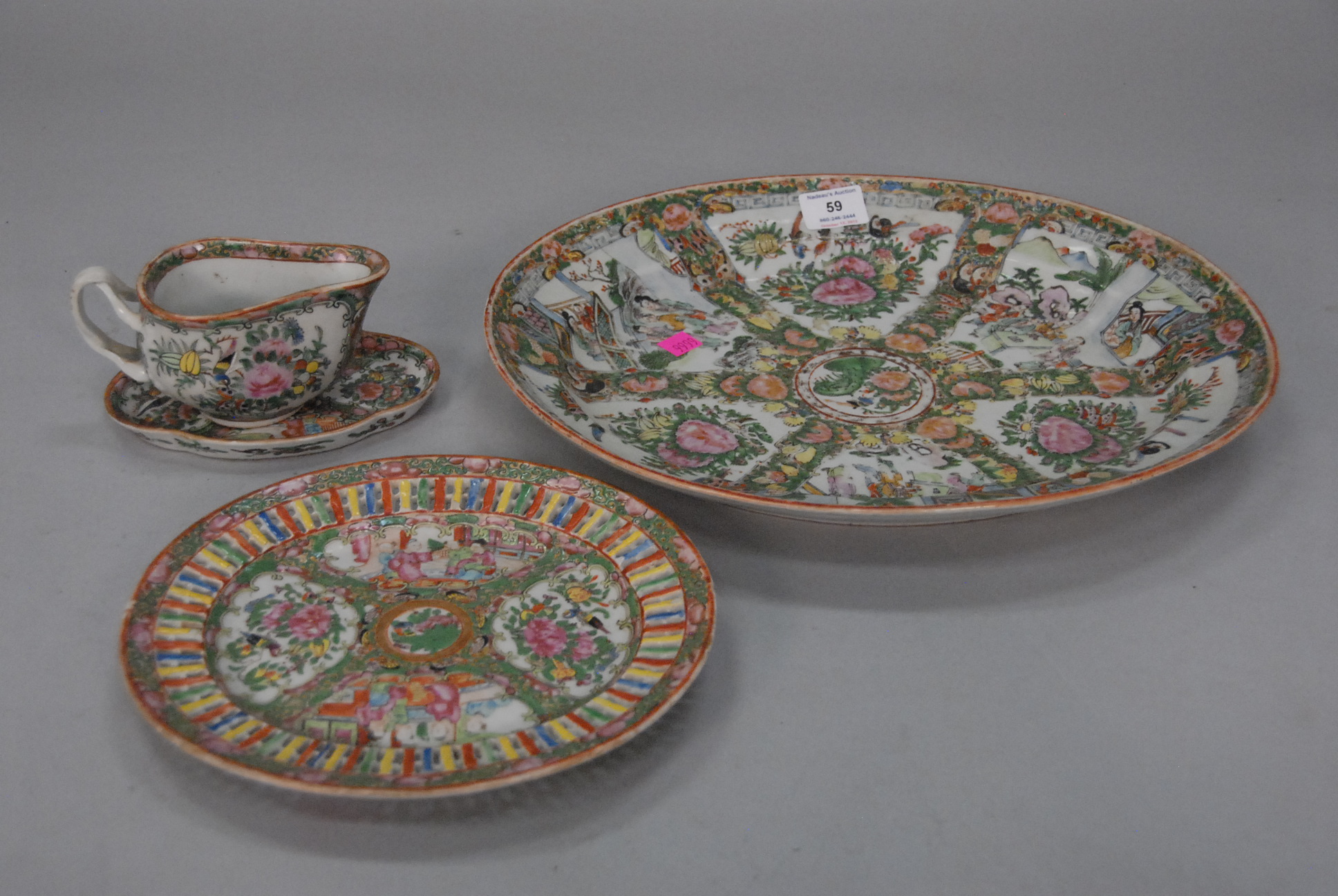 Four piece Rose Famille lot with large oval deep platter, reticulated oval platter, gravy boat, and underplate, late 19th century. large platter: 13 x 16 small platter: 8 3/4 x 10