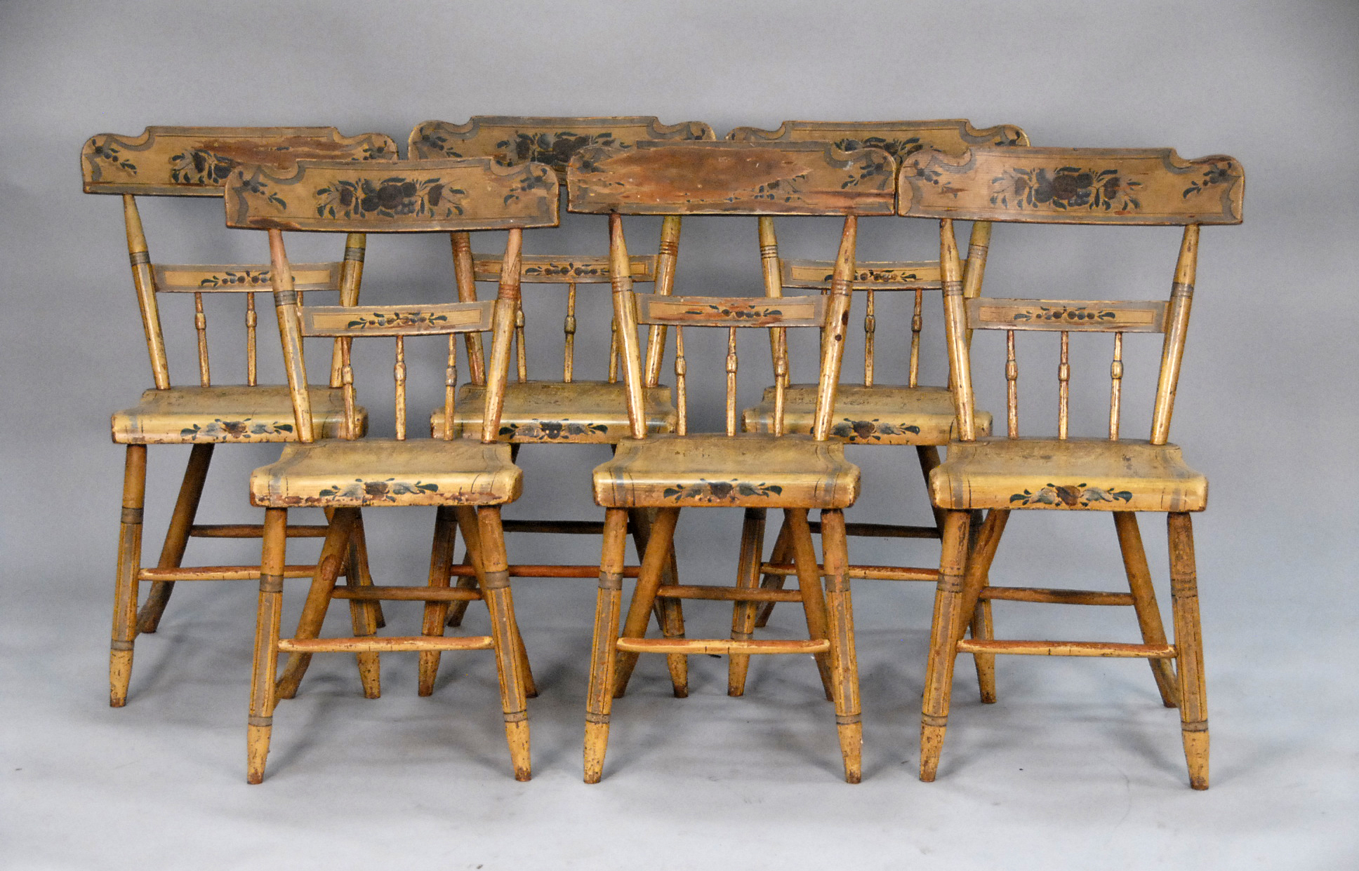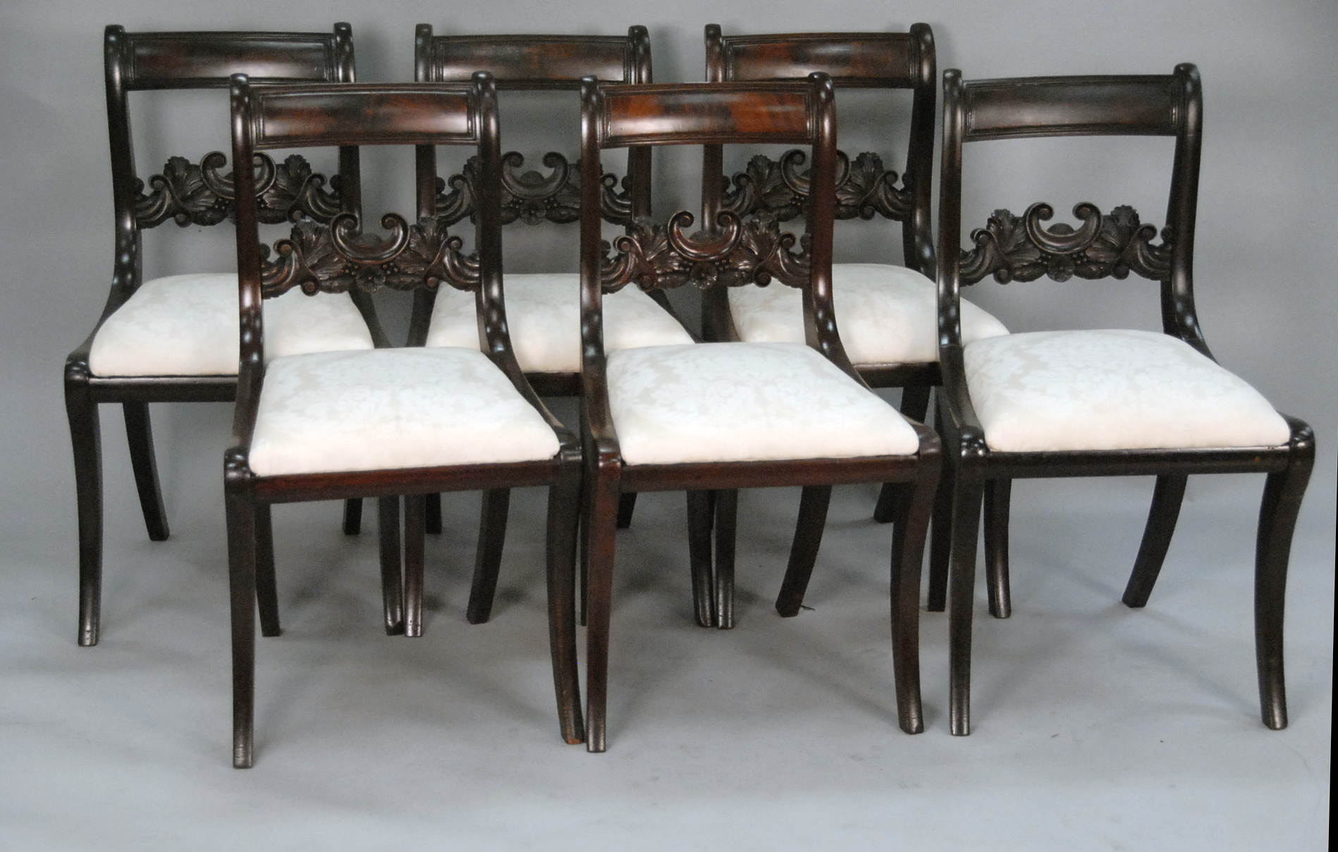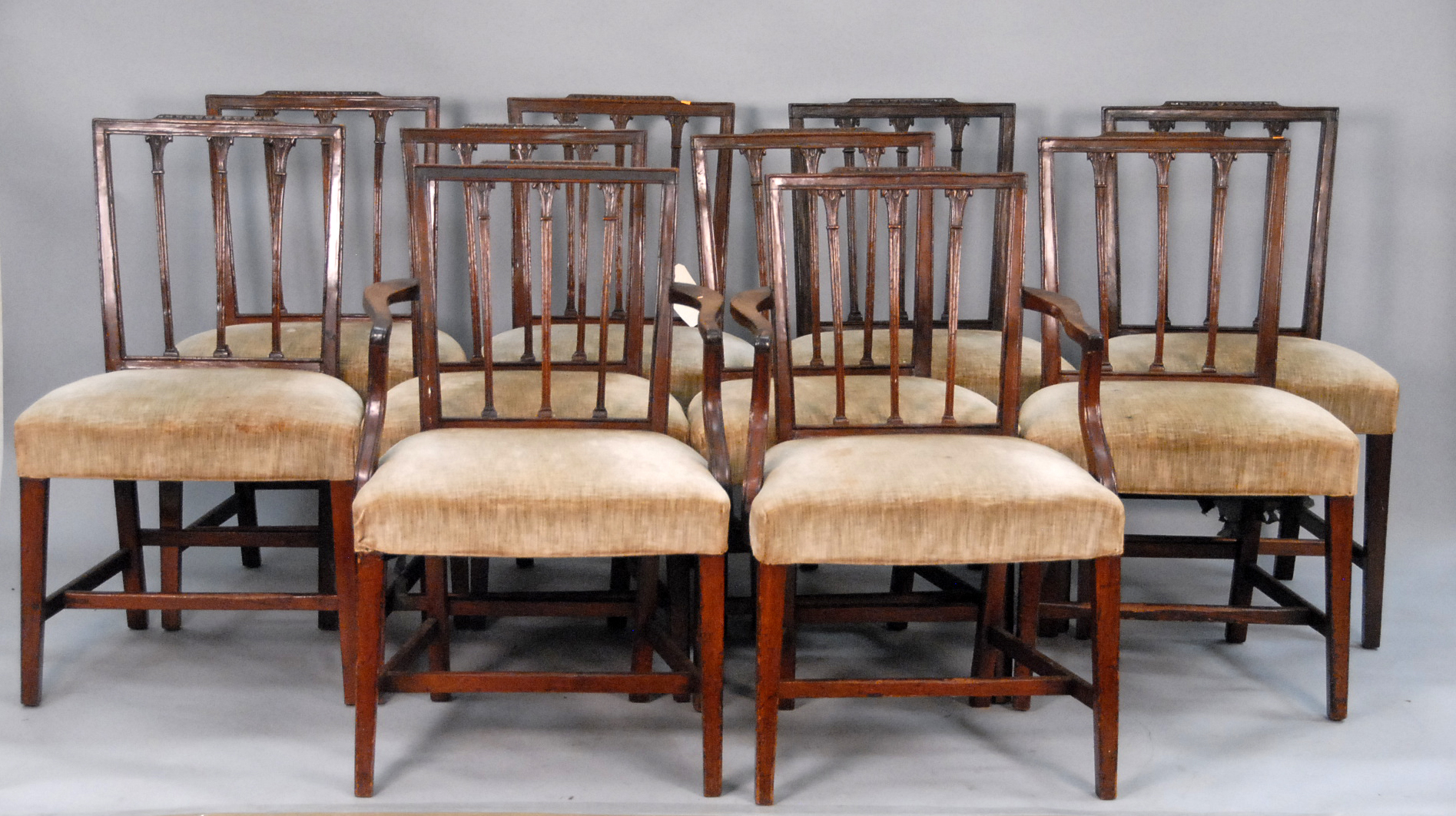 Set of ten George III mahogany dining chairs having square backs on fully upholstered seats on square legs, circa 1780-1810, two armchairs and eight side chairs.