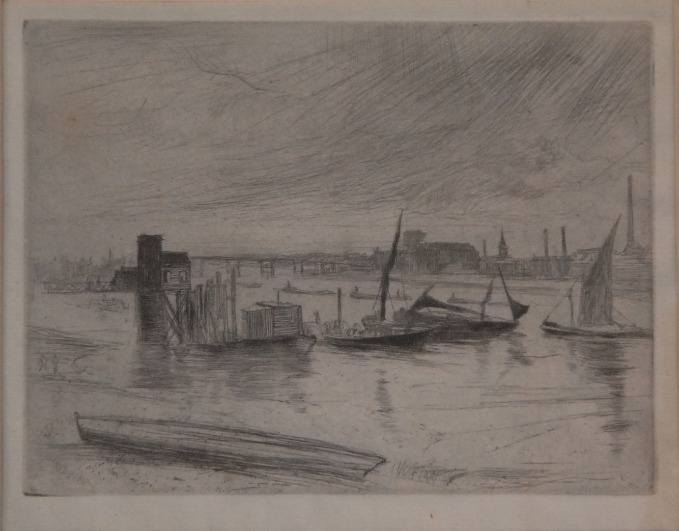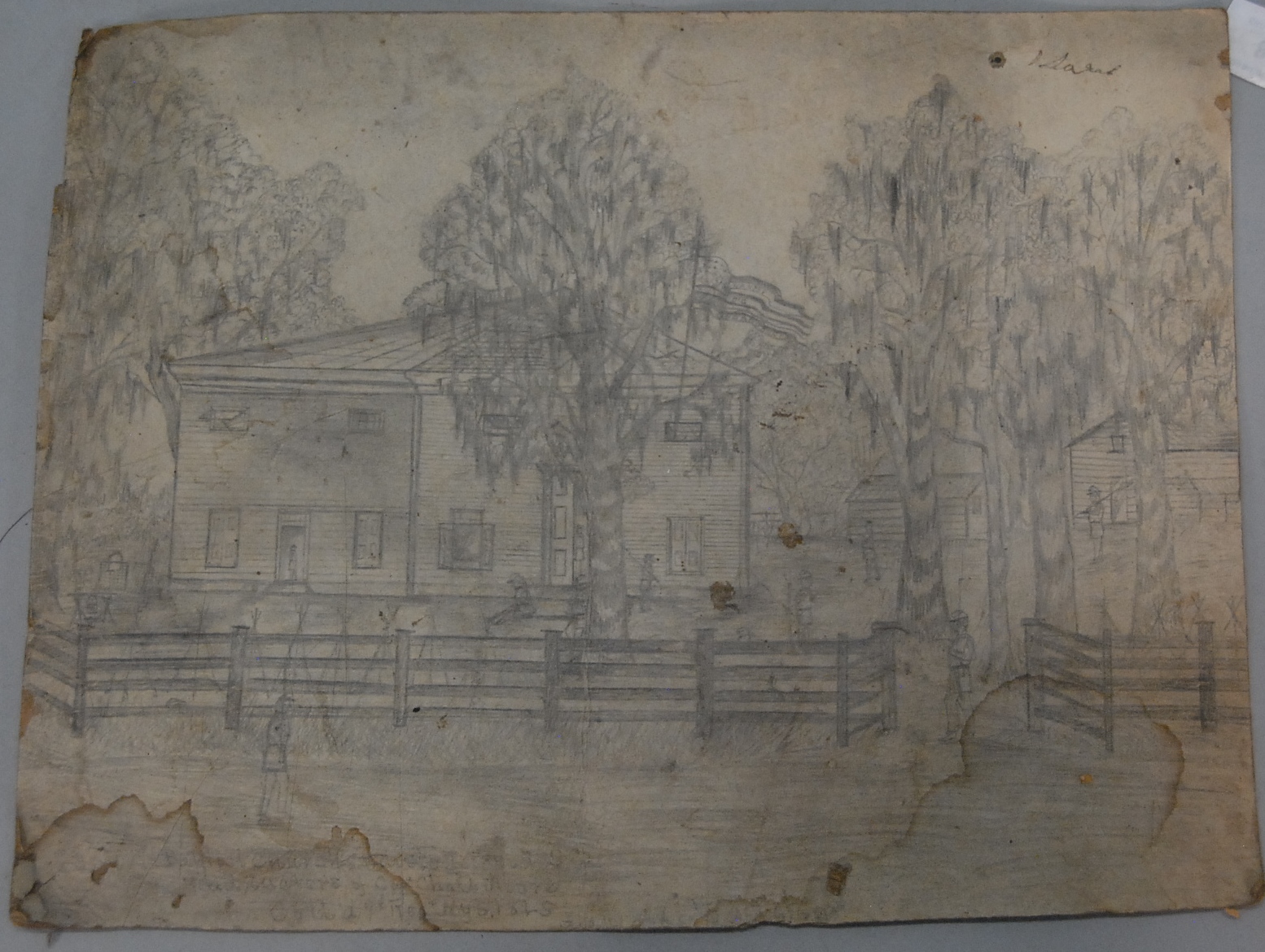 Hand sketched pencil drawing of headquarters of Captain Charles A. Moore with six armed guards and American Flag, found amongst the belongings of Captain Charles A. Moore. 11 3/4 x 14 3/4.