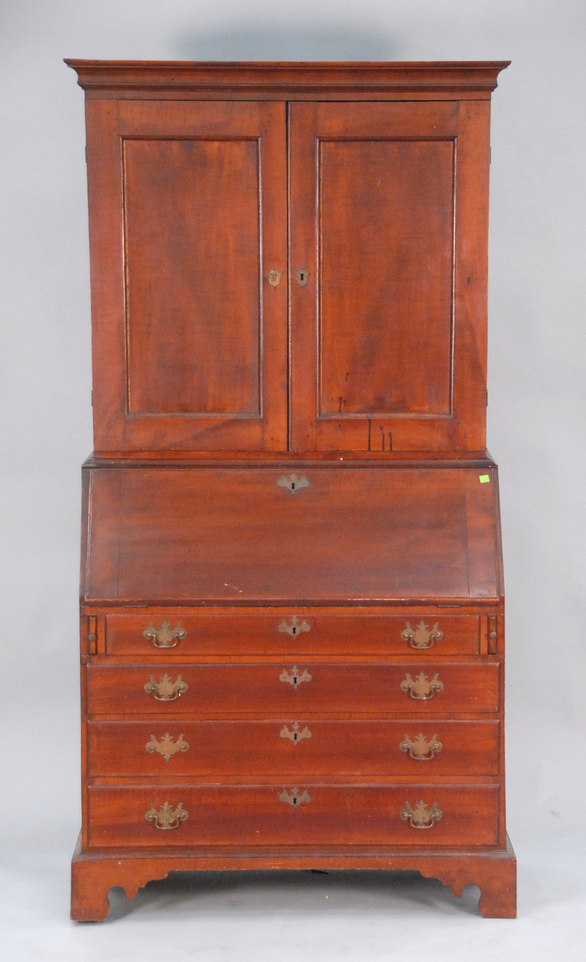 Cherry Chippendale secretary desk in two parts, upper section with cornice molding over two blind doors on lower section with slant lid desk over four drawers all set on bracket feet, 18th century. ht. 76in. wd. 35 3/4in.