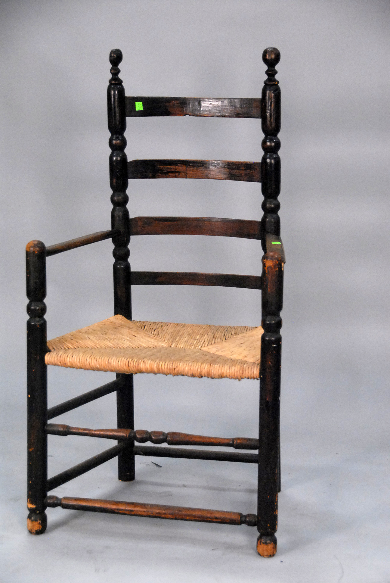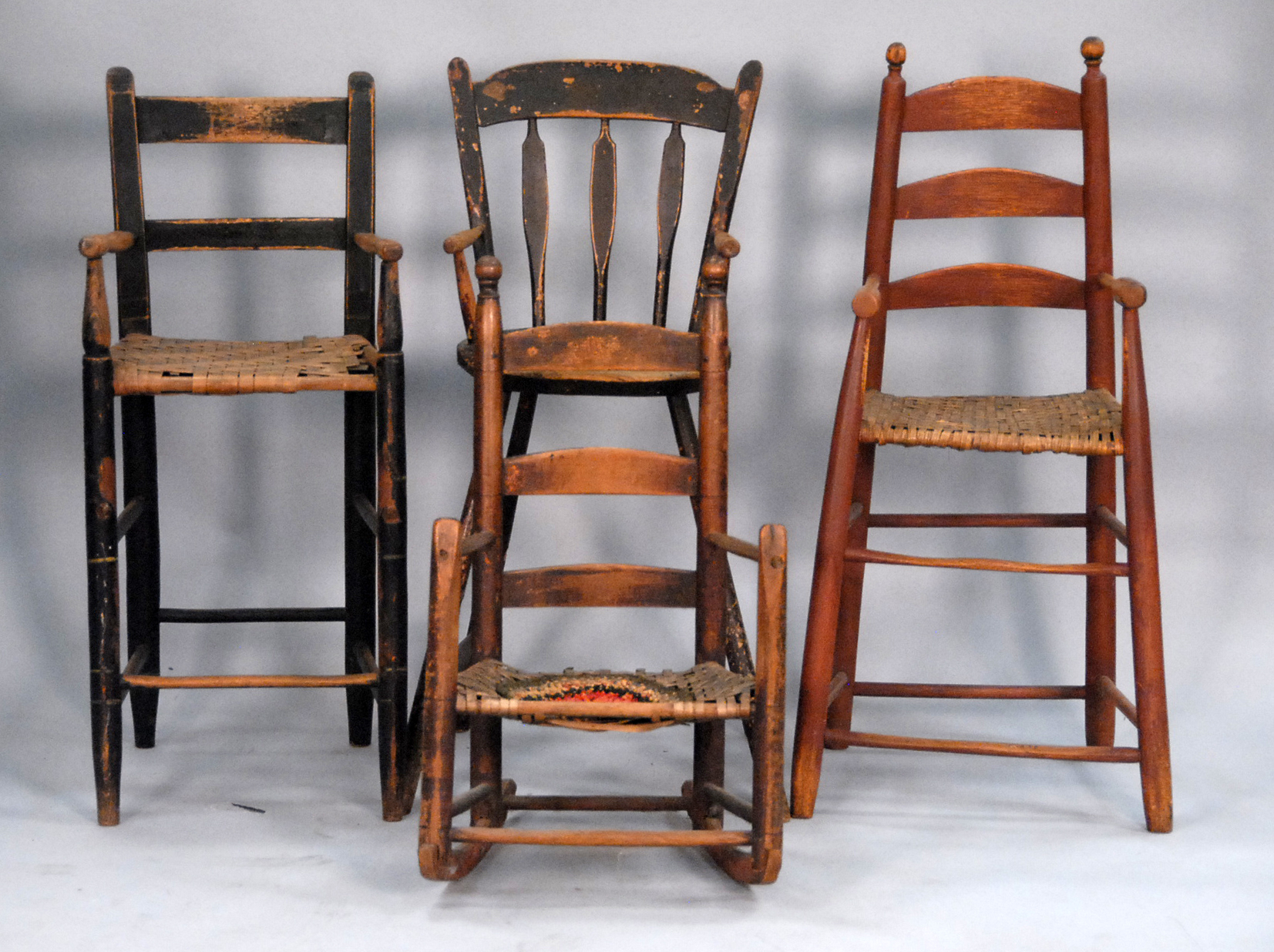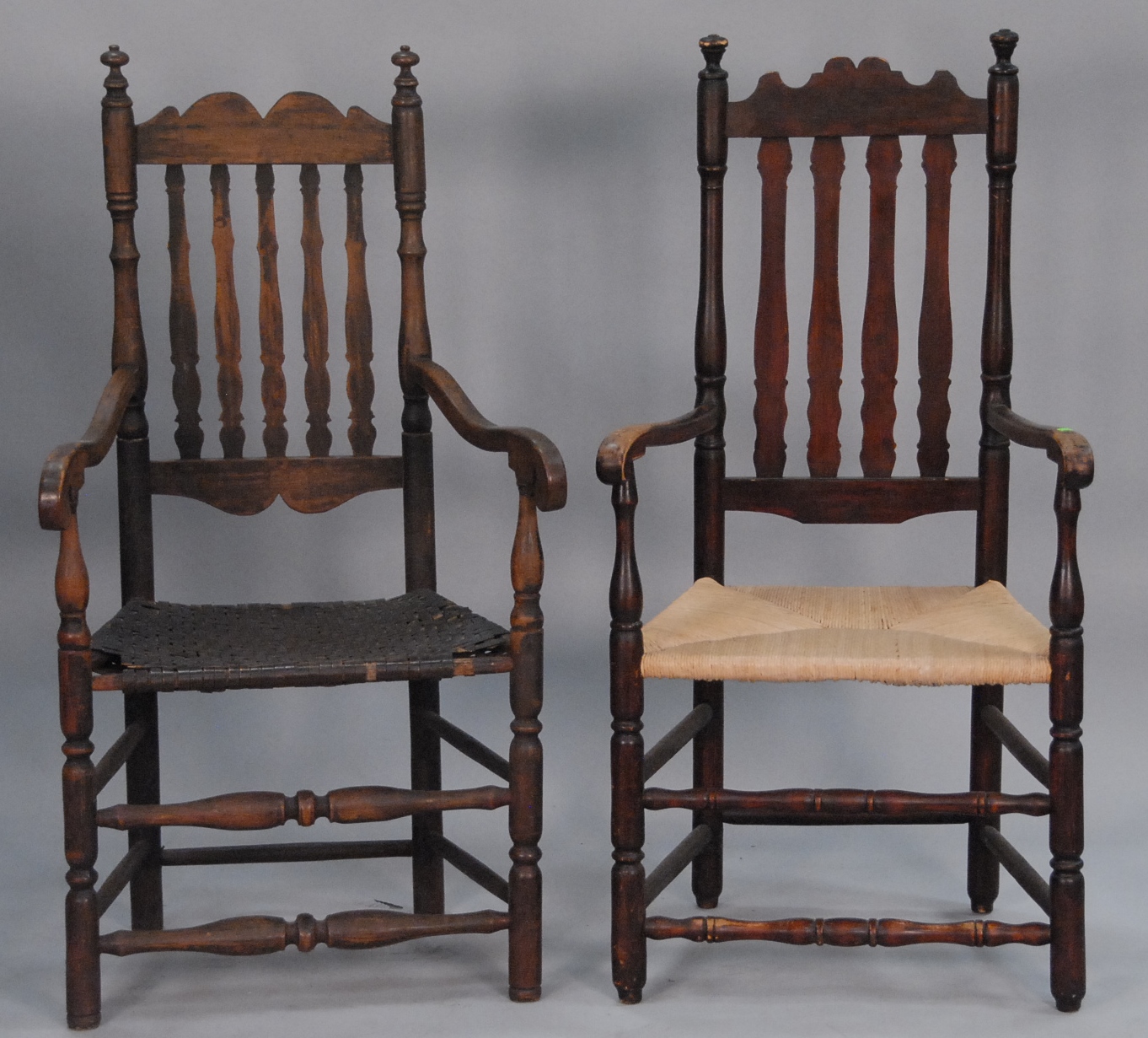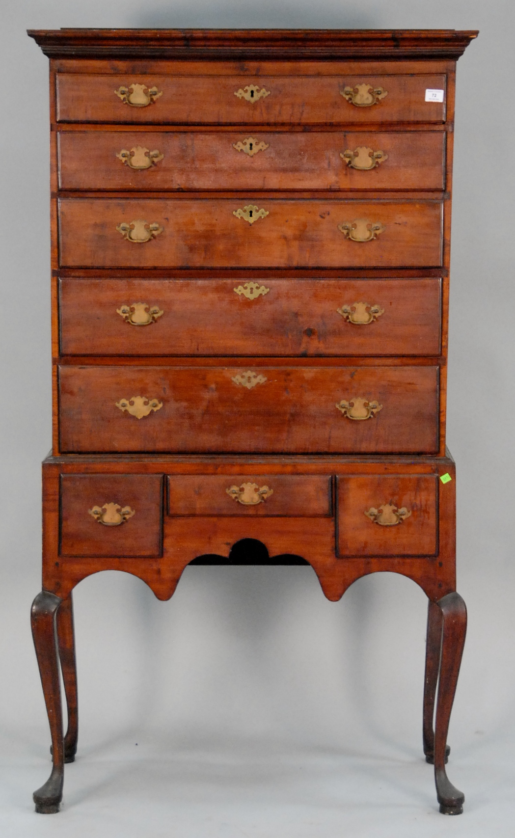Queen Anne high chest in two parts, upper section with cornice molding over five drawers on base with three short drawers all set on cabriole legs ending in pad feet brasses replaced ht. 69in., wd. 35.5in.