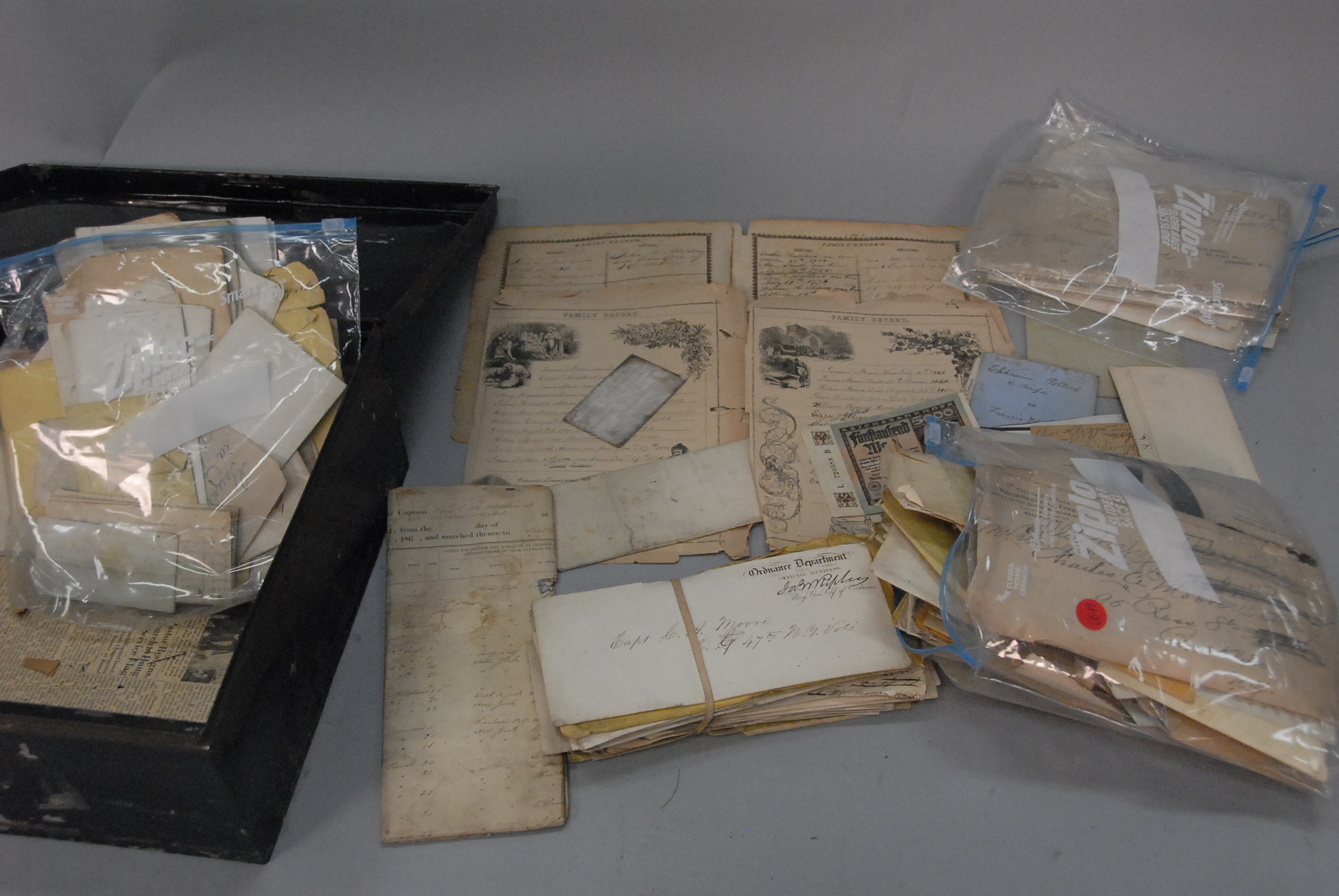 Civil War ephemera large lot to include correspondence to and from Captain then Colonel Charles Moore of 47th New York Vol., muster payrolls for Captain and Colonel Charles Moore NY and family tree, mid 1860’s. Charles Moore born 1828, died 1918, buried in Greenwood Cemetery.