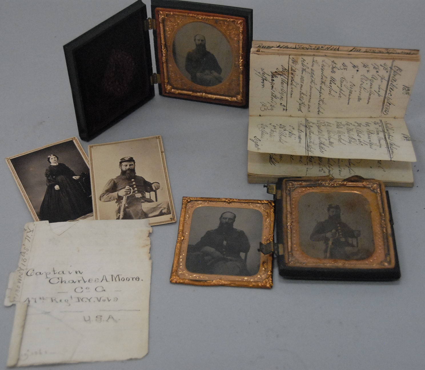 Photo lot of Captain Charles Moore including three Ambrotypes in uniform, two cabinet card, some of Charles Moore in Uniform and one of his wife Josephine Adams Moore, one ambrotype with his gloves in hand along with hand written receipt book of Charles Moore with hand penned American Sailing Ship dated 1845, marked Drugs & Medicine.