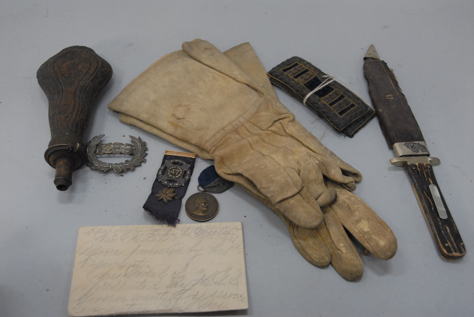 Edward Barnes and Sons, Sheffield bowie knife with sheath marked US along with Civil War possessions of Captain Charles A. Moore to include pair of leather gloves, 47th Reg. N.Y. S.V. medal, Captain’s bars, brass powder horn, and Civil War medal 1861-1865.