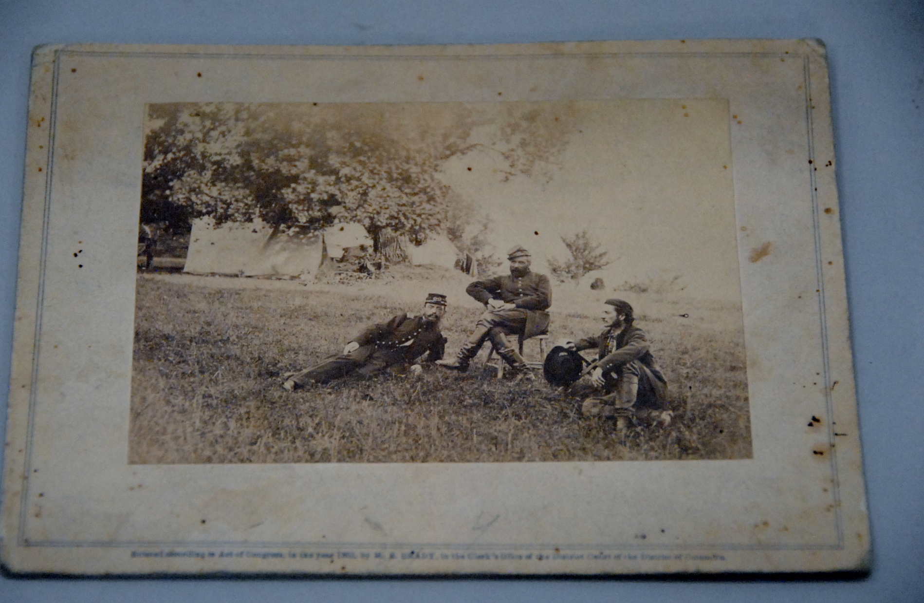 Brady photo of three soldiers in uniform near encampment headquarters of General Fitz John Porter at Westover, Westover Landing, VA 1862, found amongst Captain Charles A. Moore’s belongings. photo 3 x 4 3/8.