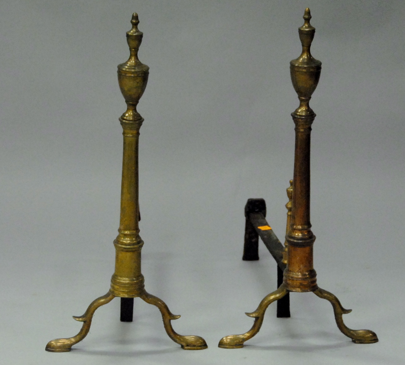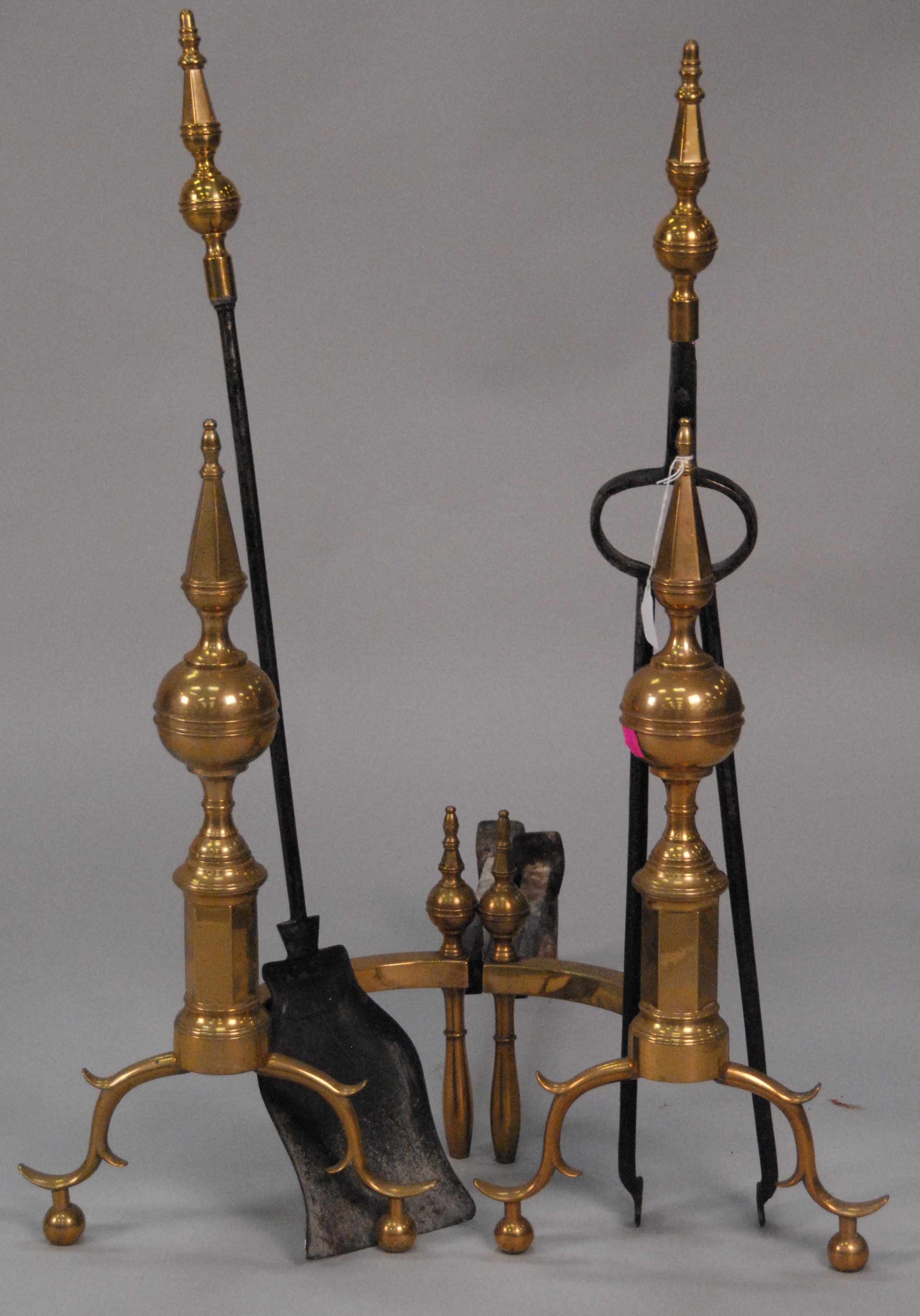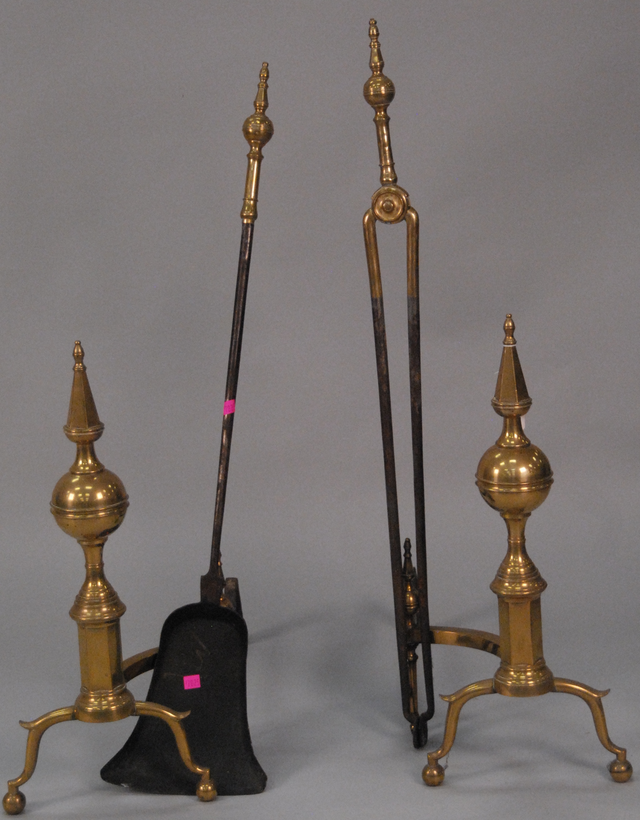 Four piece lot to include pair of Federal brass steeple top andirons with bead decoration and ball feet along with two brass top tools. ht. of andirons 22 1/2in.