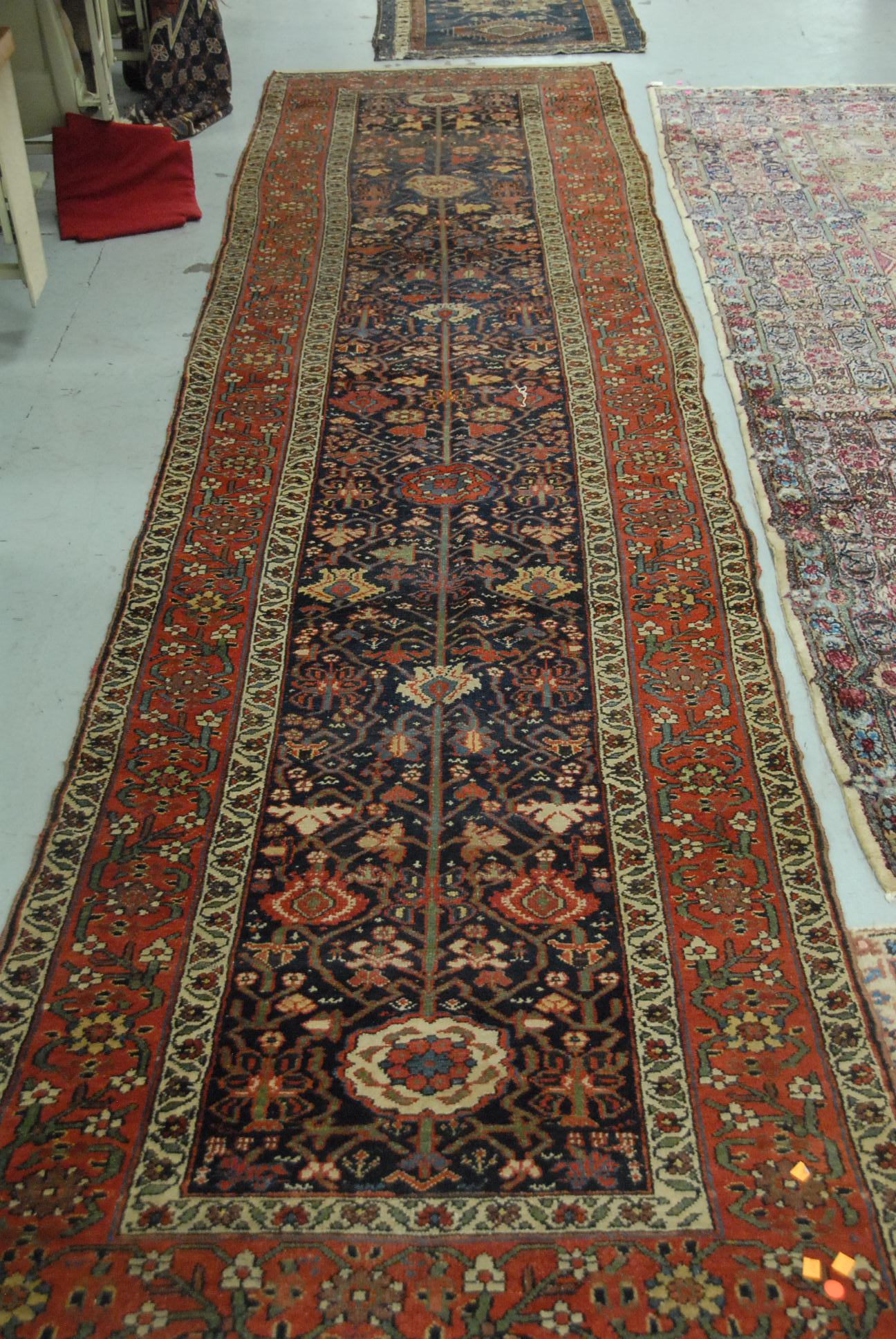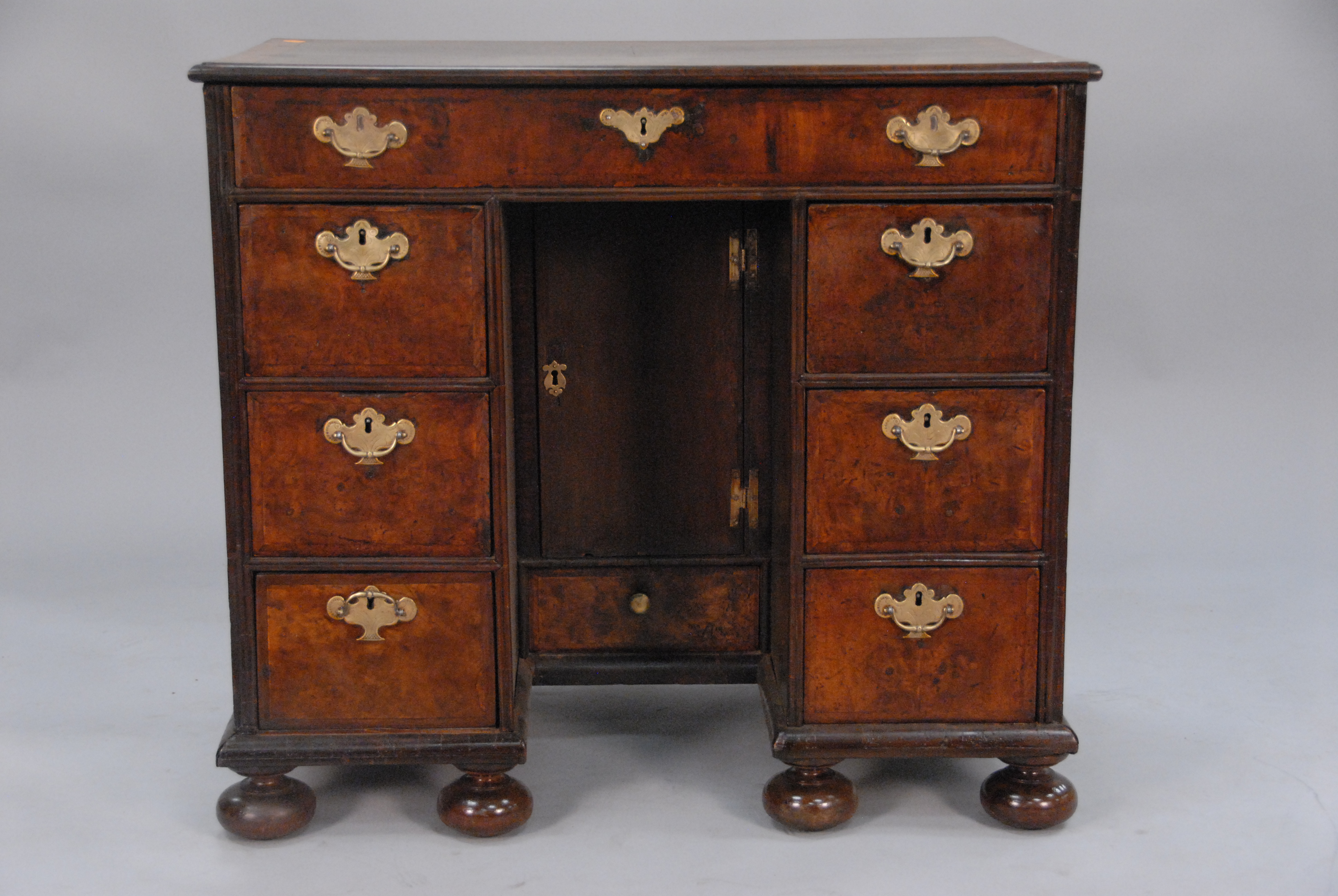 William and Mary walnut and burl walnut knee hole desk with rectangular top over one long drawer flanked by three drawers on either side and center door and drawer set on suppressed ball feet. ht. 29 1/2in. wd. 37 1/2in.