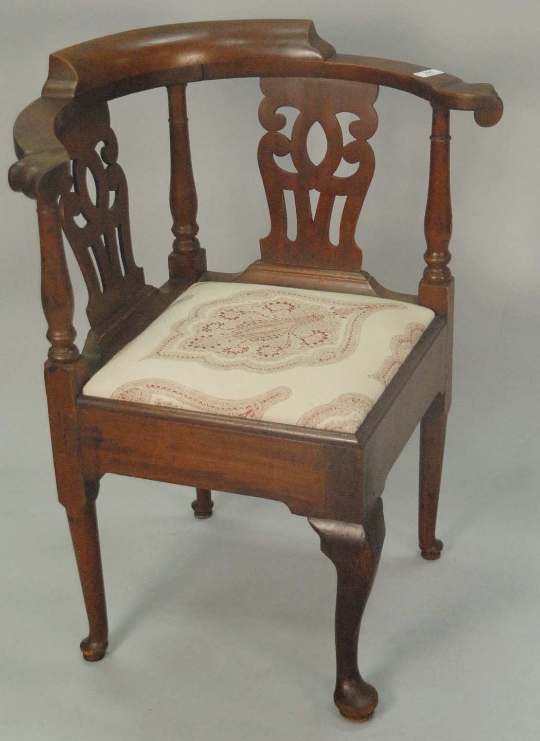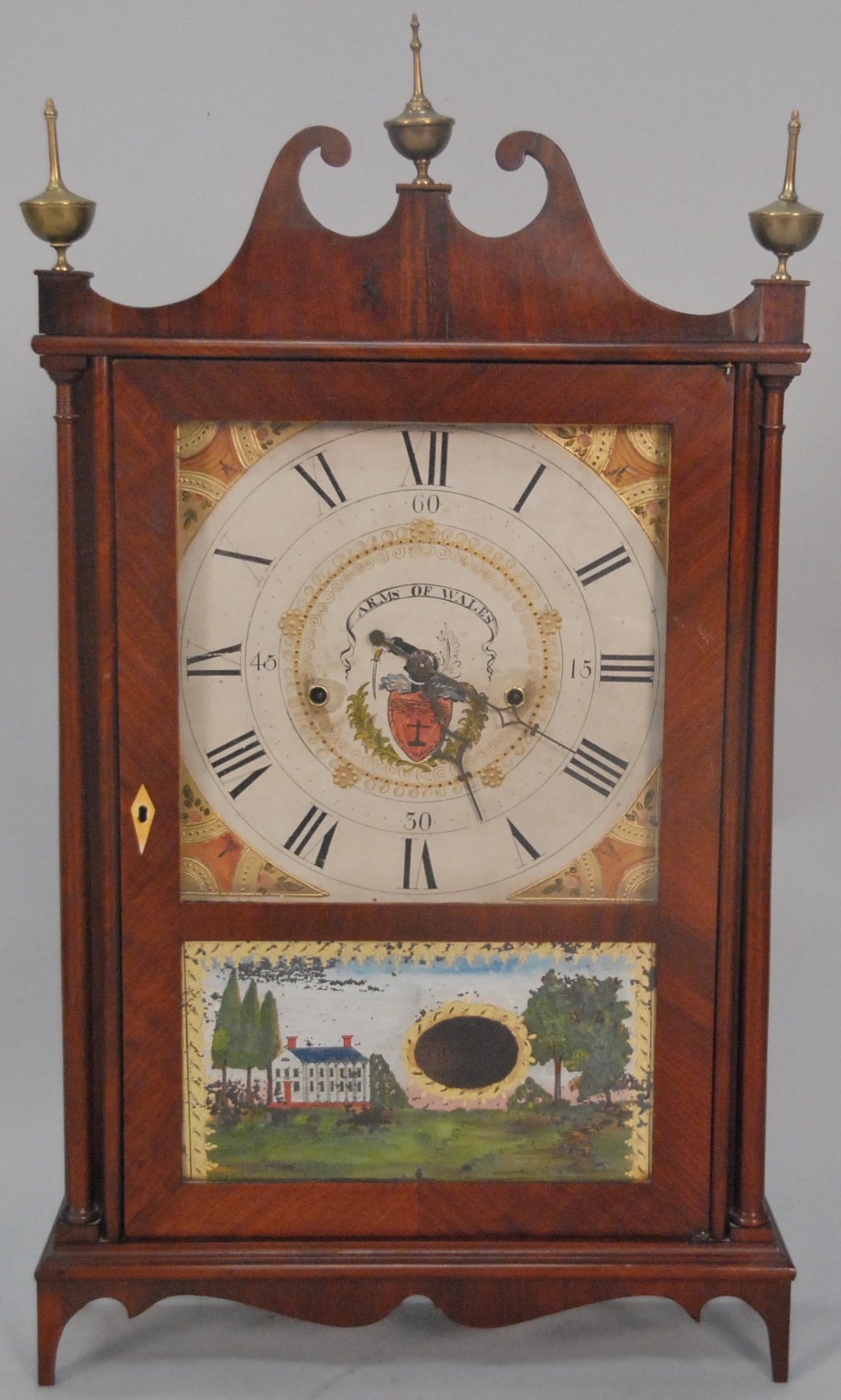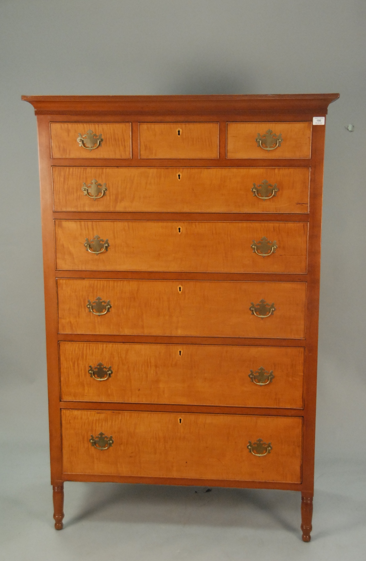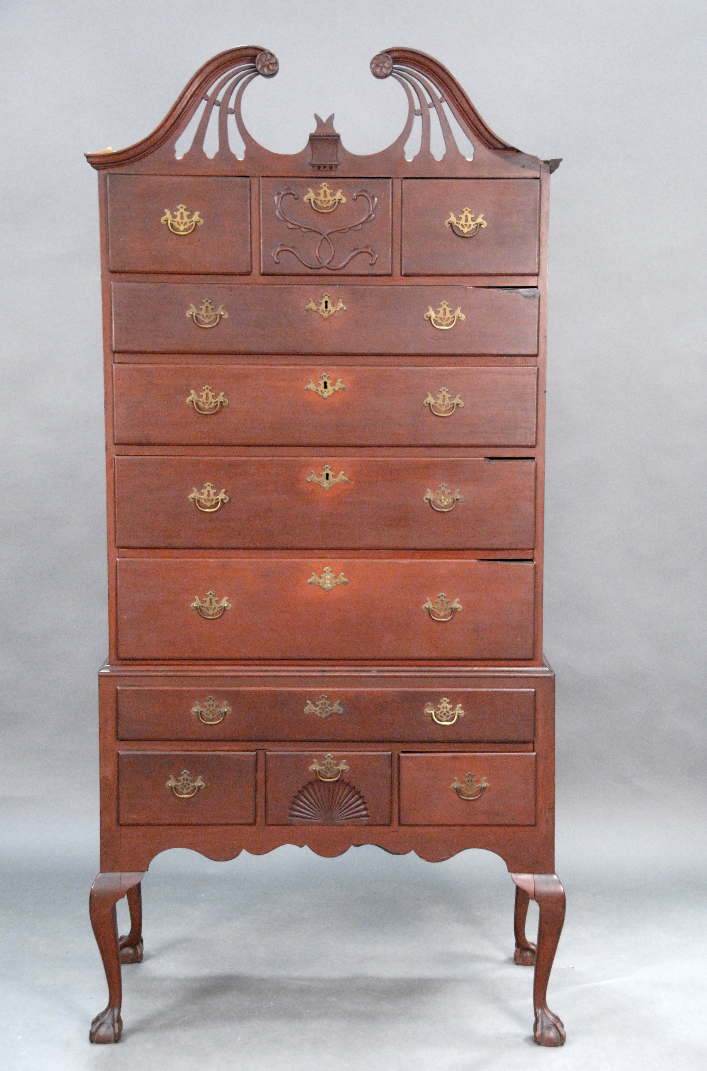 Chapin School high chest of drawers in two parts, upper section having broken pediment, pierced carved top over three short deep drawers over four long drawers on lower section with one long drawer over three short drawers over scalloped apron all set on cabriole legs ending in ball and claw feet, original hardware and old red finish, circa 1790 Connecticut River Valley. Top center drawer has typical vine carving lower center drawer with fan carving. Cherry and Eastern white pine. ht. 80 1/4in. upper case ht. 49 5/8in. wd. 35 3/8in. dp. 18 1/8in. lower case ht. 30 5/8in. wd. 37 3/8in. dp. 19 1/8in. Photographed in Connecticut Valley Furniture by Thomas and Alice Kugelman and Robert Lionetti, Catalog 82, page 187, Windsor, Connecticut Provenance: Timothy Phelps and Ruth Wilson, married 1785 Cyrus Howe and Sally Phelps Edward Thrall and Flavia Howe George Merwin and Leliane Thrall Hubbel Brown and Dorothy Merwin Elizebeth Bowman and Edward Brown born 1932 to present owners