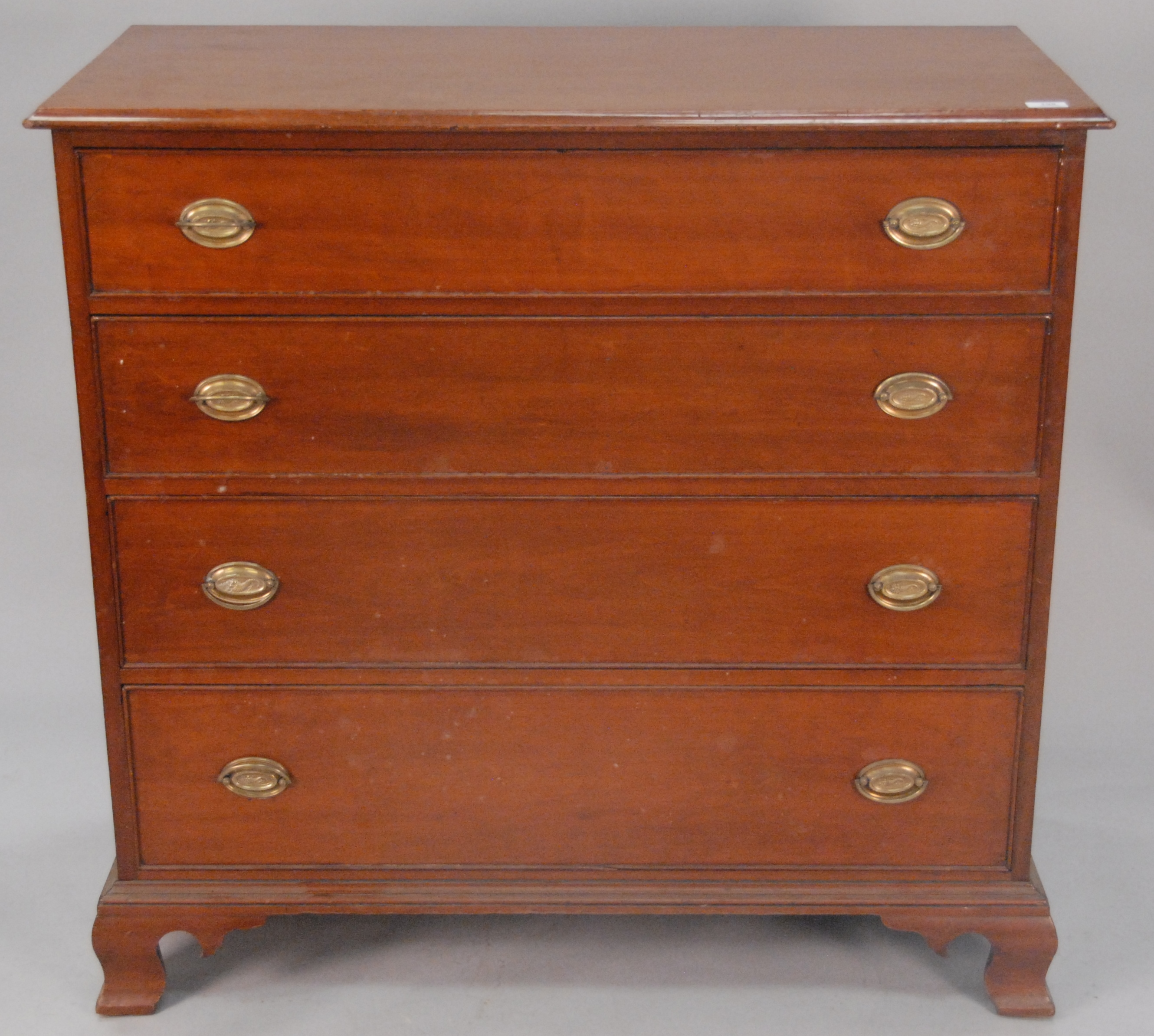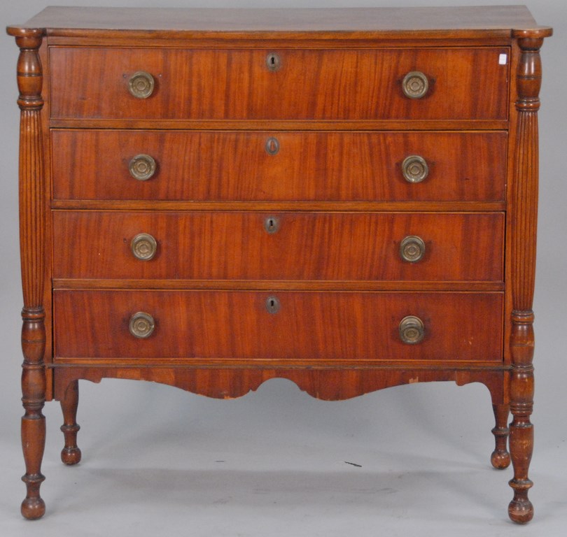 Sheraton four drawer chest, top with turret corners over four drawers flanked by fluted and turned columns on turned legs, circa 1830. ht. 41in. wd. 43 1/2in.
