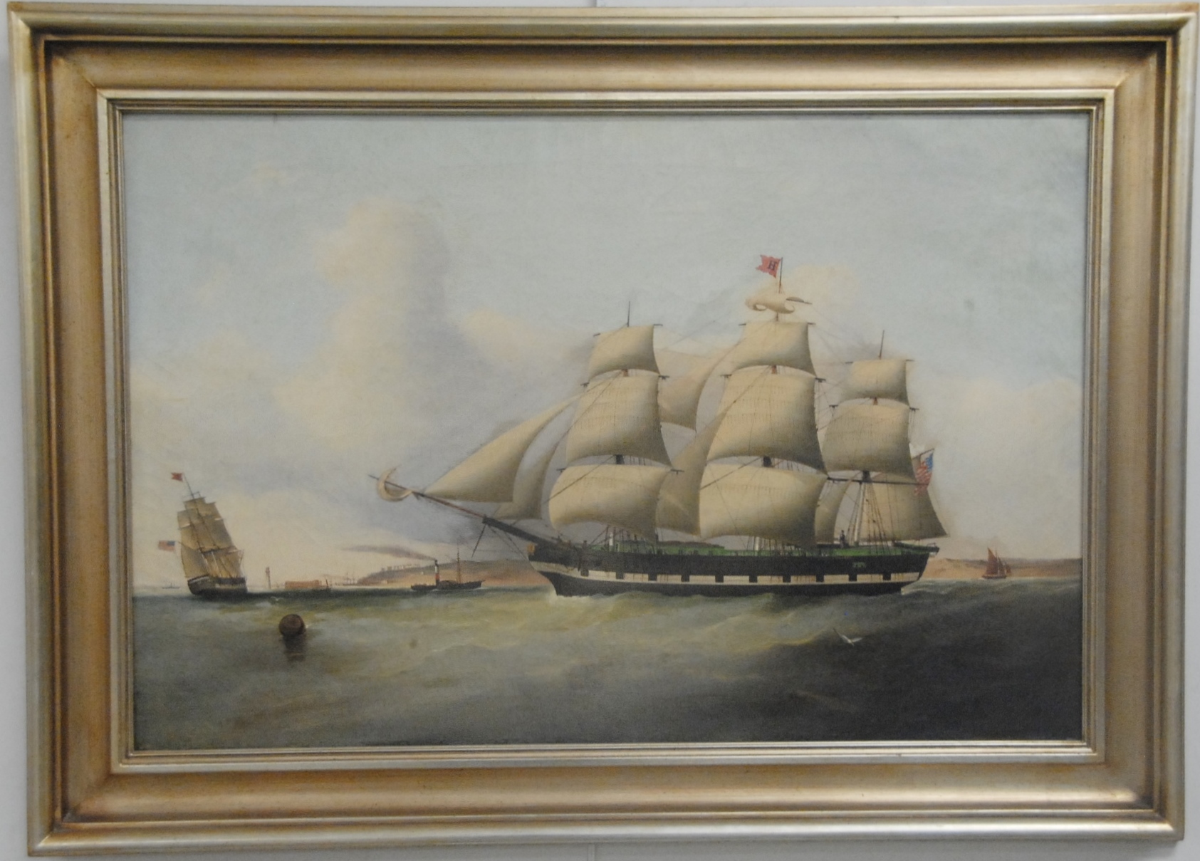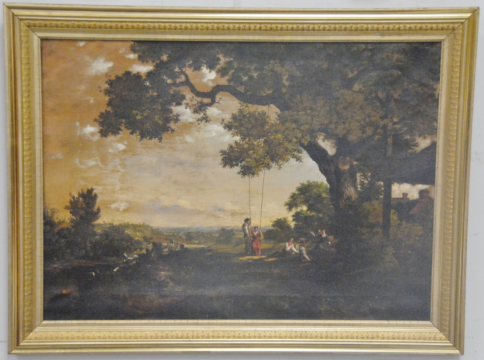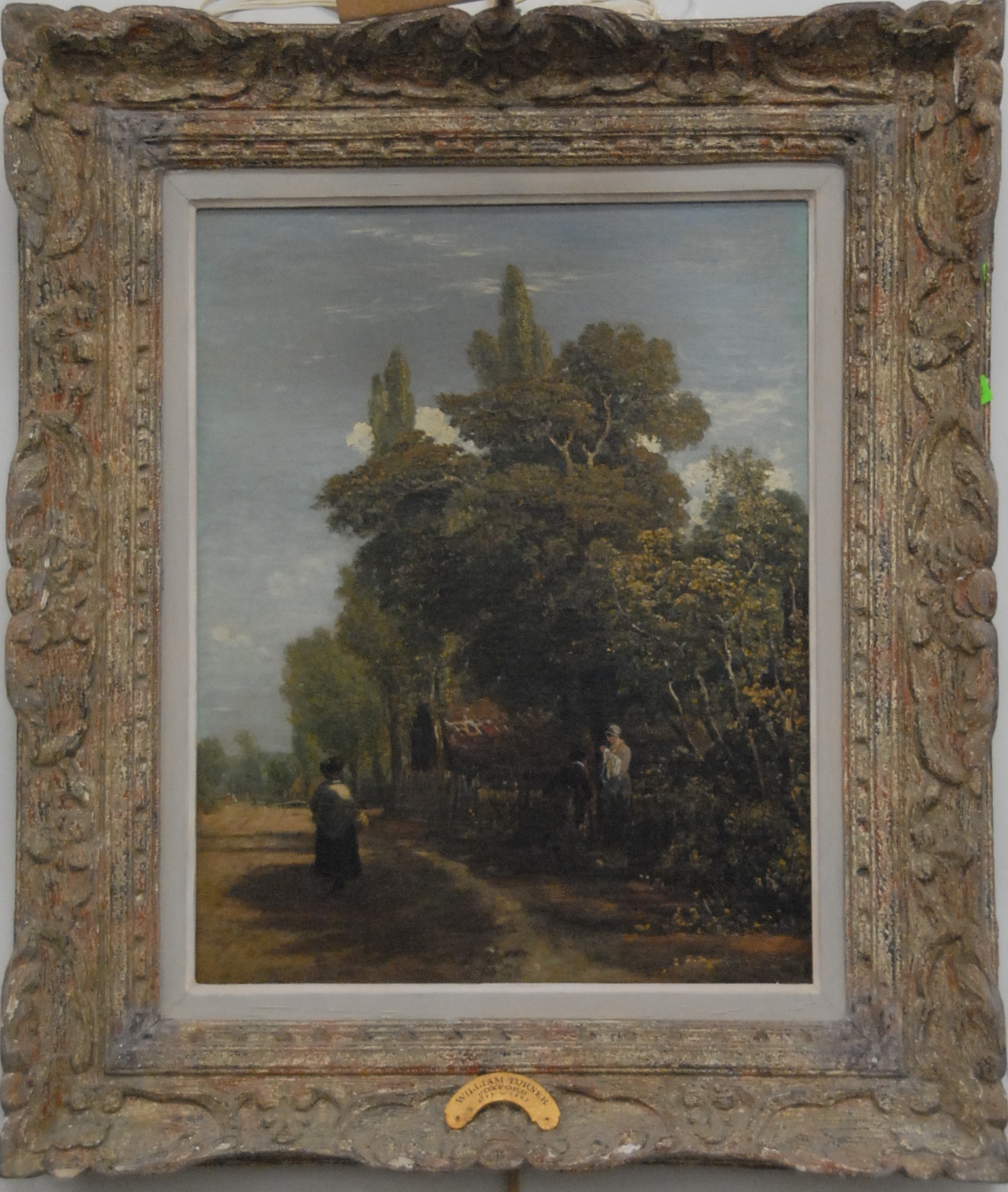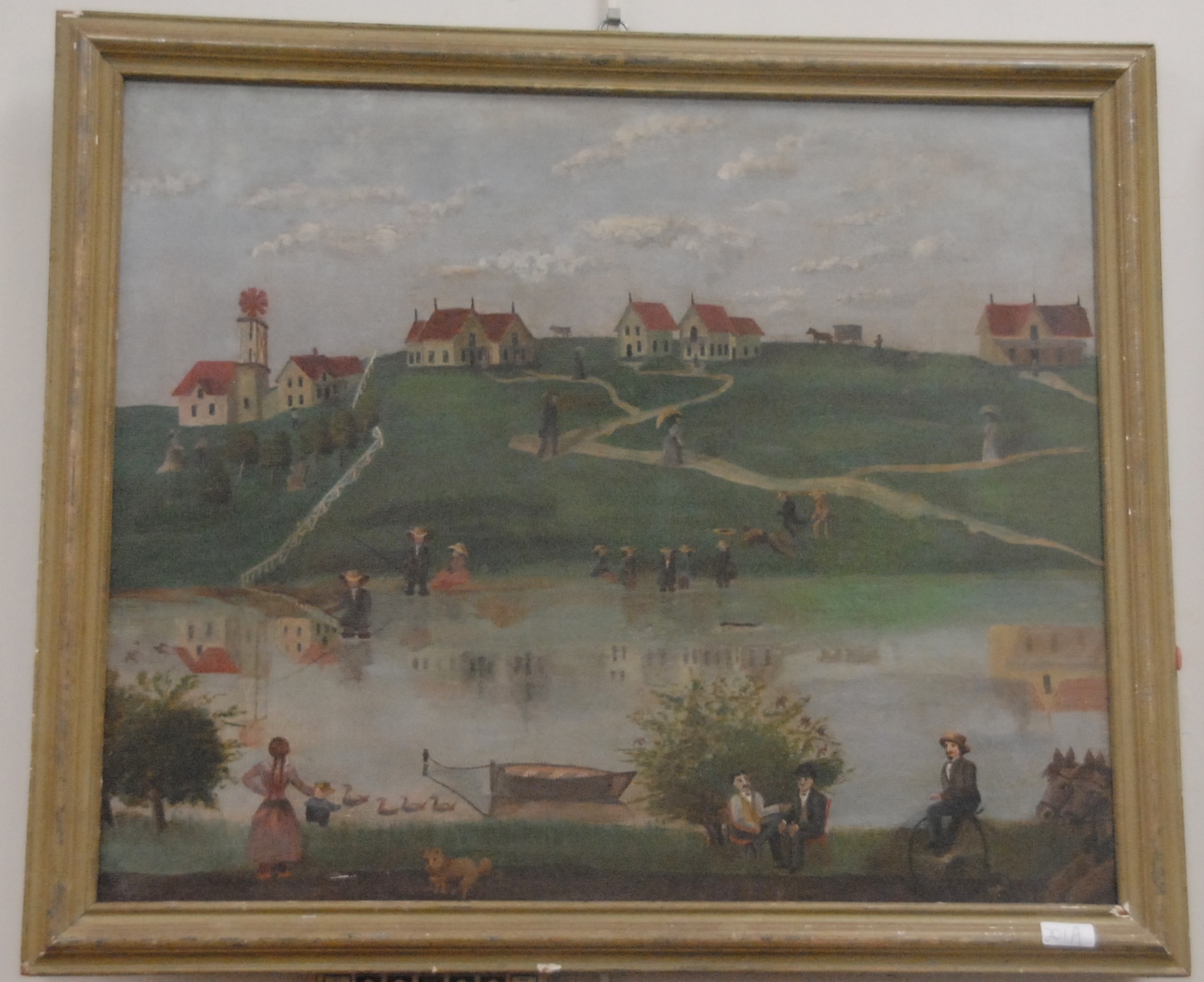 Richard Law Hinsdale PRIMITIVE LANDSCAPE WITH PEOPLE AND TOWN oil on canvas signed lower left R. L. Hinsdale 1854 Paterson N.A. Richard Law Hinsdale born Hartford CT 1826, in 1848 went to NYC where he exhibited at the American Art Union 1853-1854, after which he exhibited in NYC again at the National Academy. Photo attached showing this painting hung in the Butler McCook House Hartford CT 1981 26 x 36