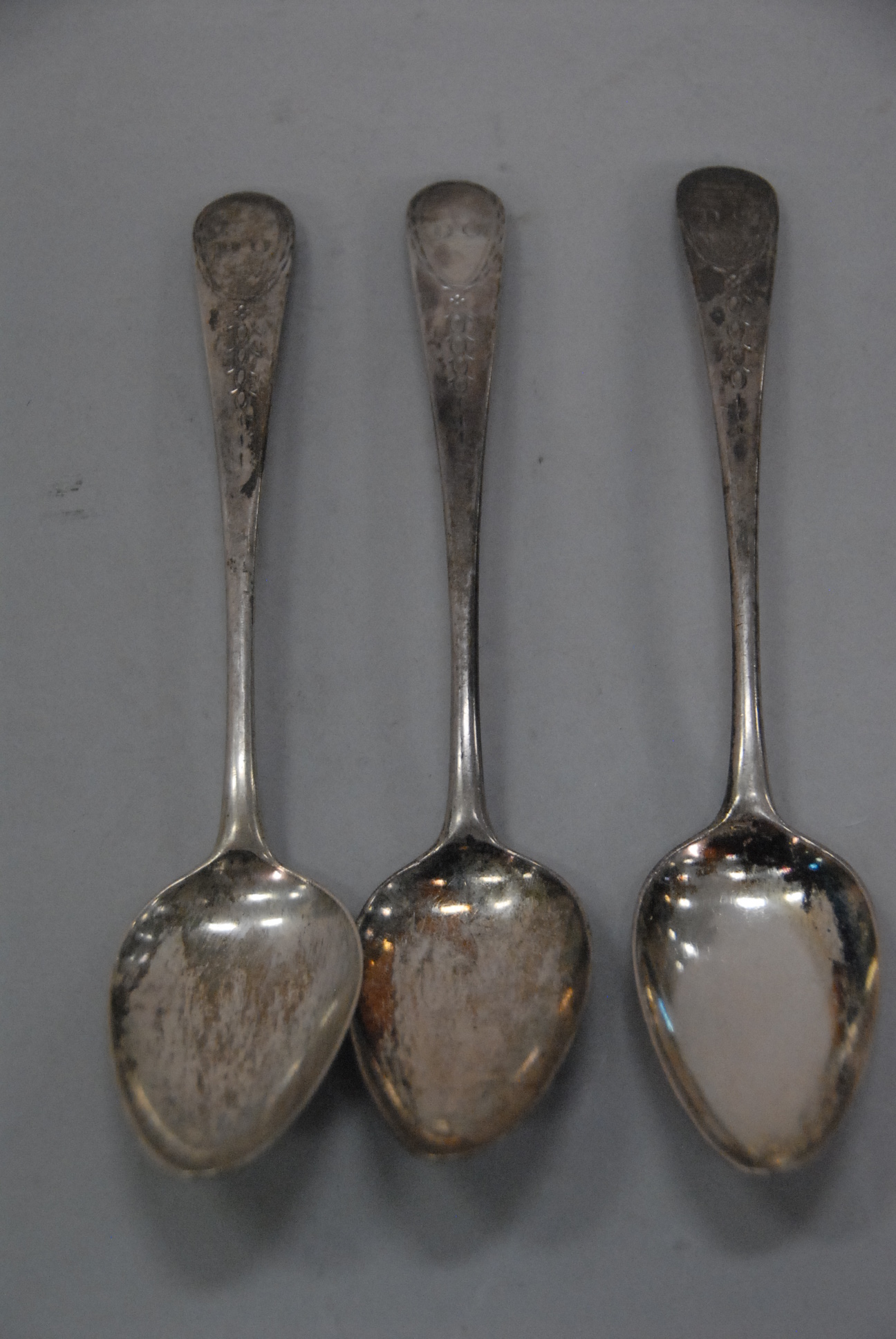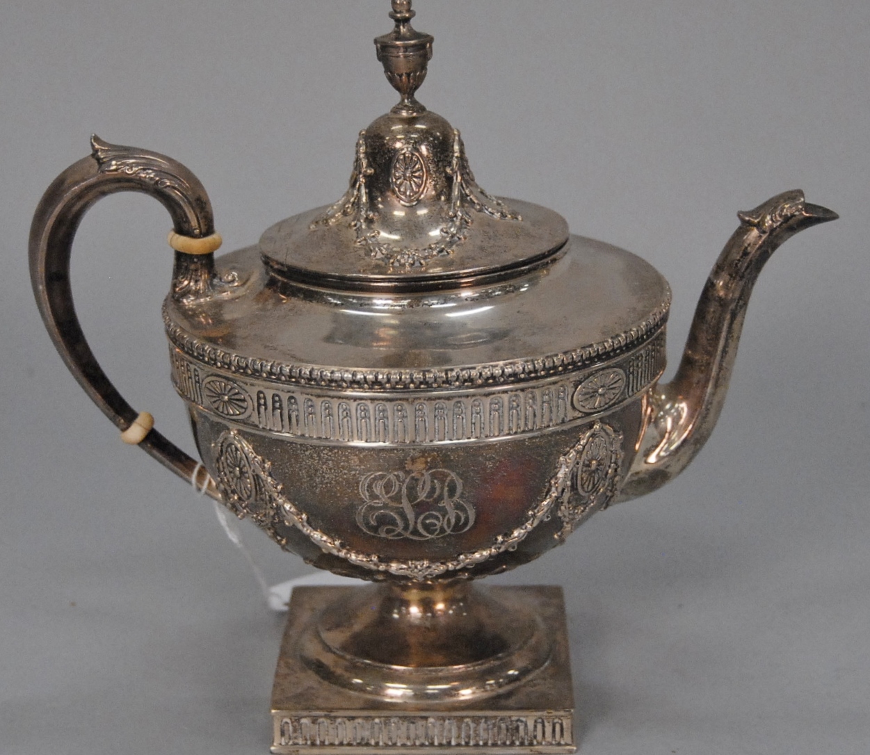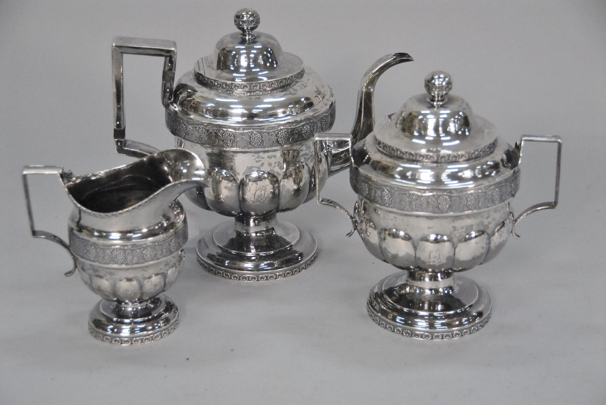 W. Thompson American coin silver three piece tea set to include teapot, covered sugar bowl and creamer, all melon shaped with chased bunches of grapes 56.7 t oz., ht. 6in. – 9 1/2in.