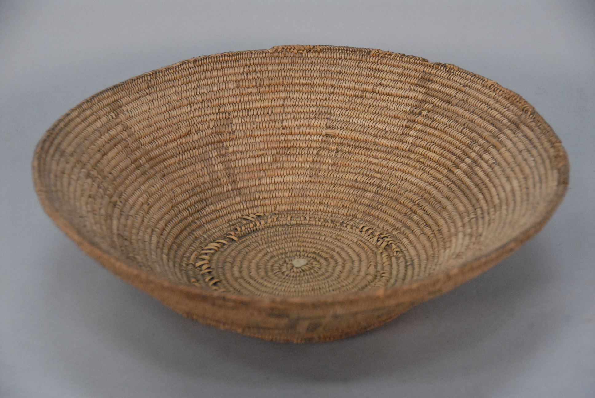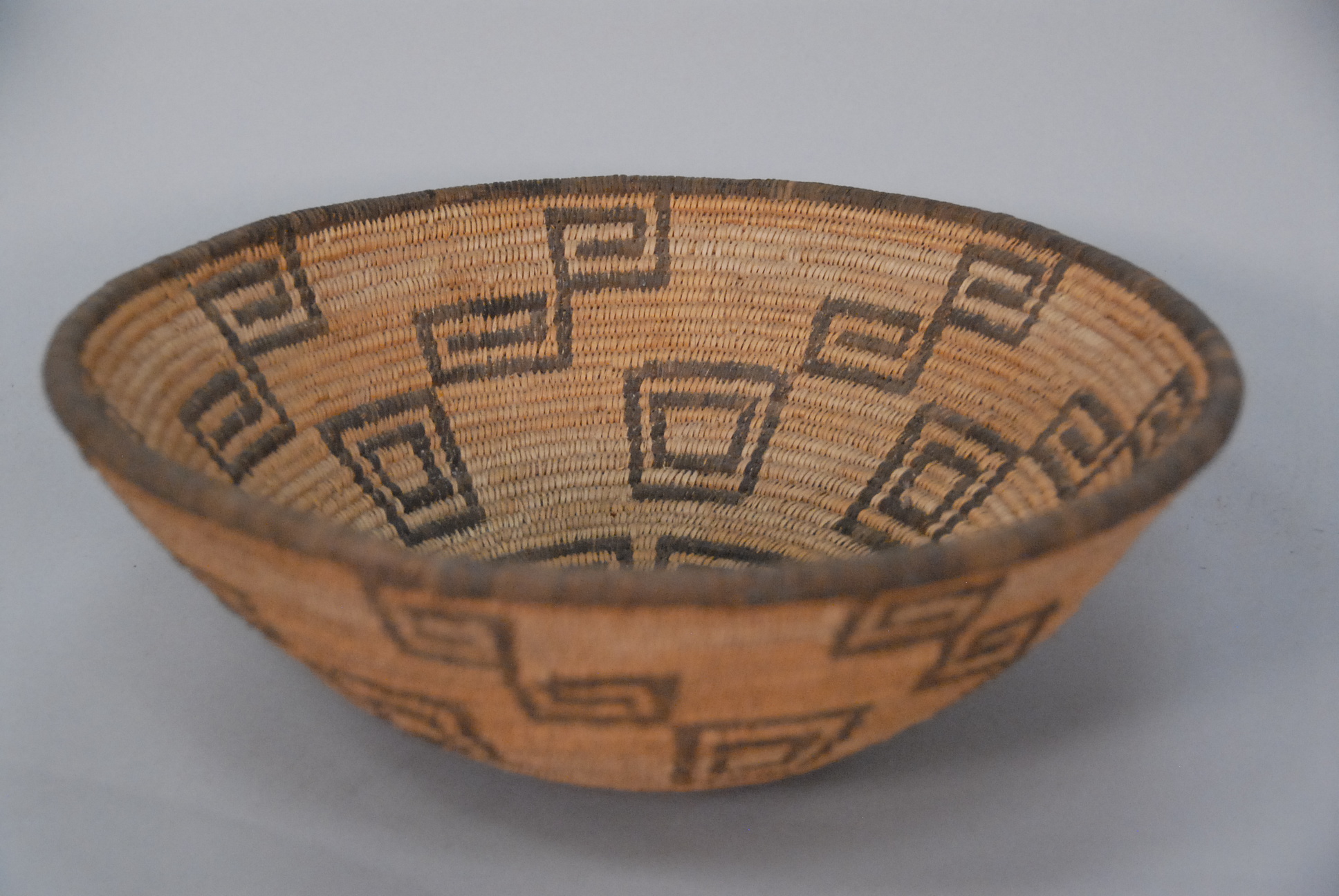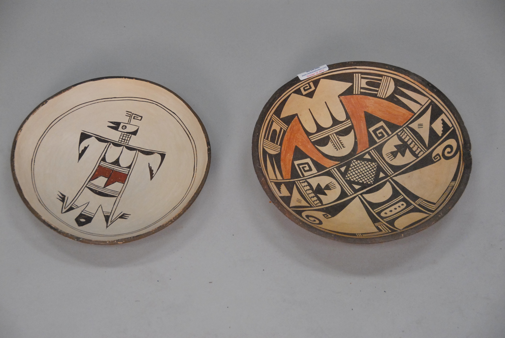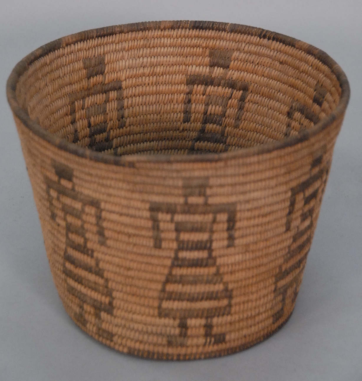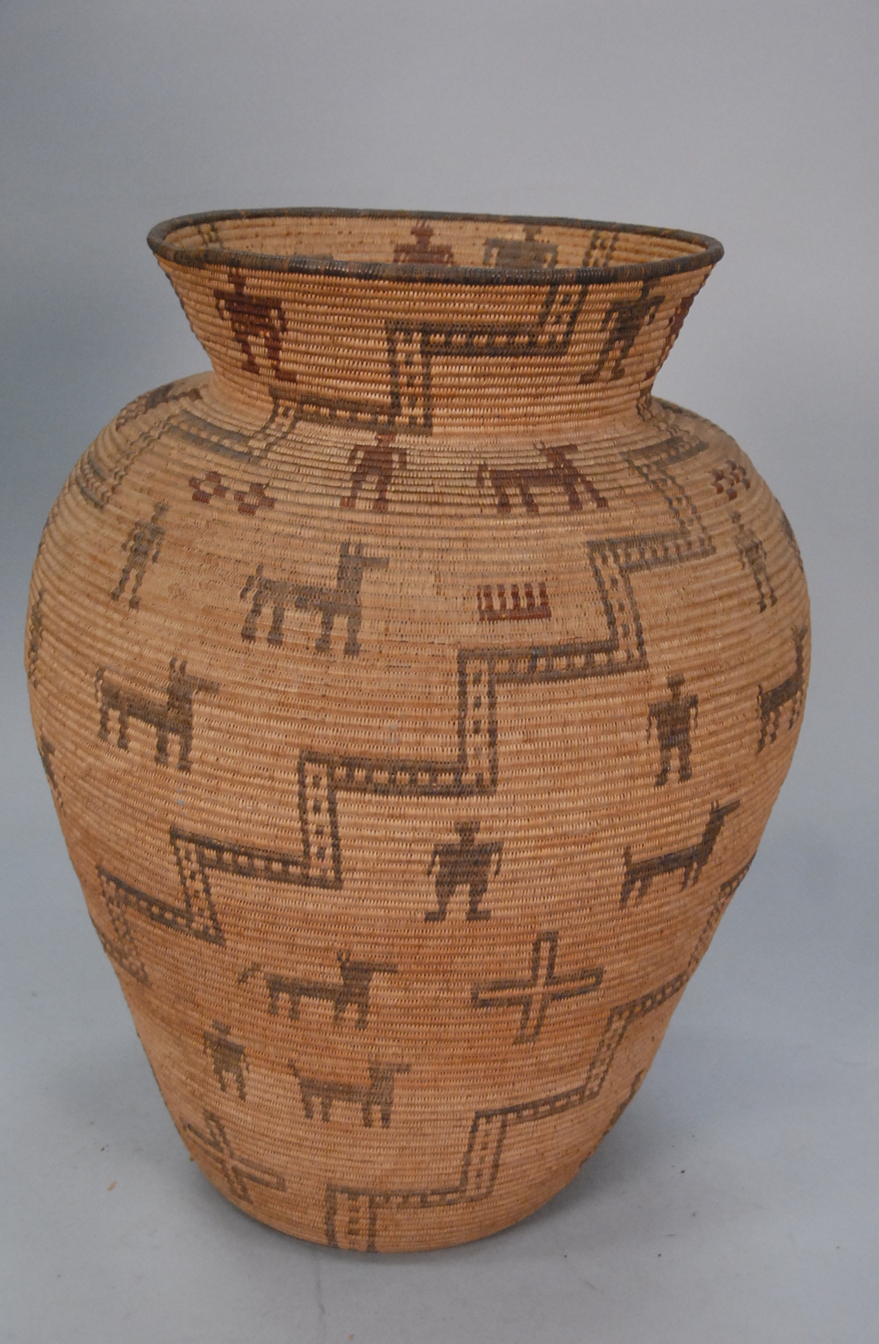 Exceptional Apache figural olla having high shoulder, flared rim, decorated in two color sets with nineteen deer, twenty-six people, six crosses, geometric shapes, and diagonal band, having original bill of sale ht. 21in., dia. 11 1/1in.