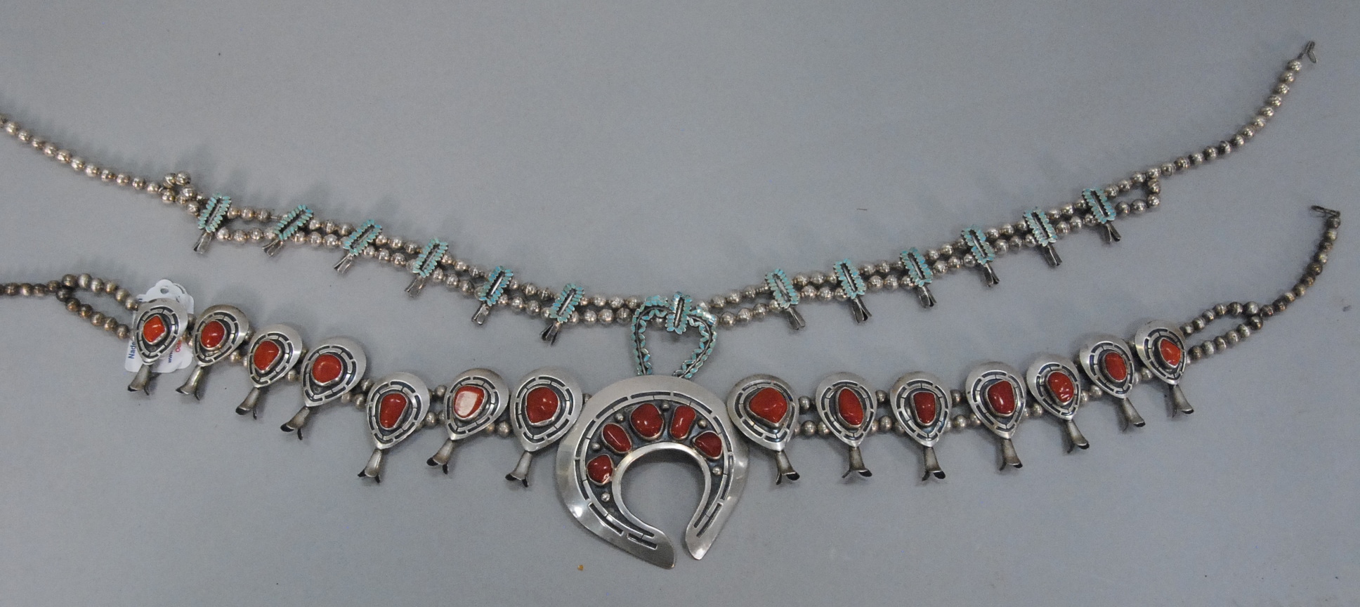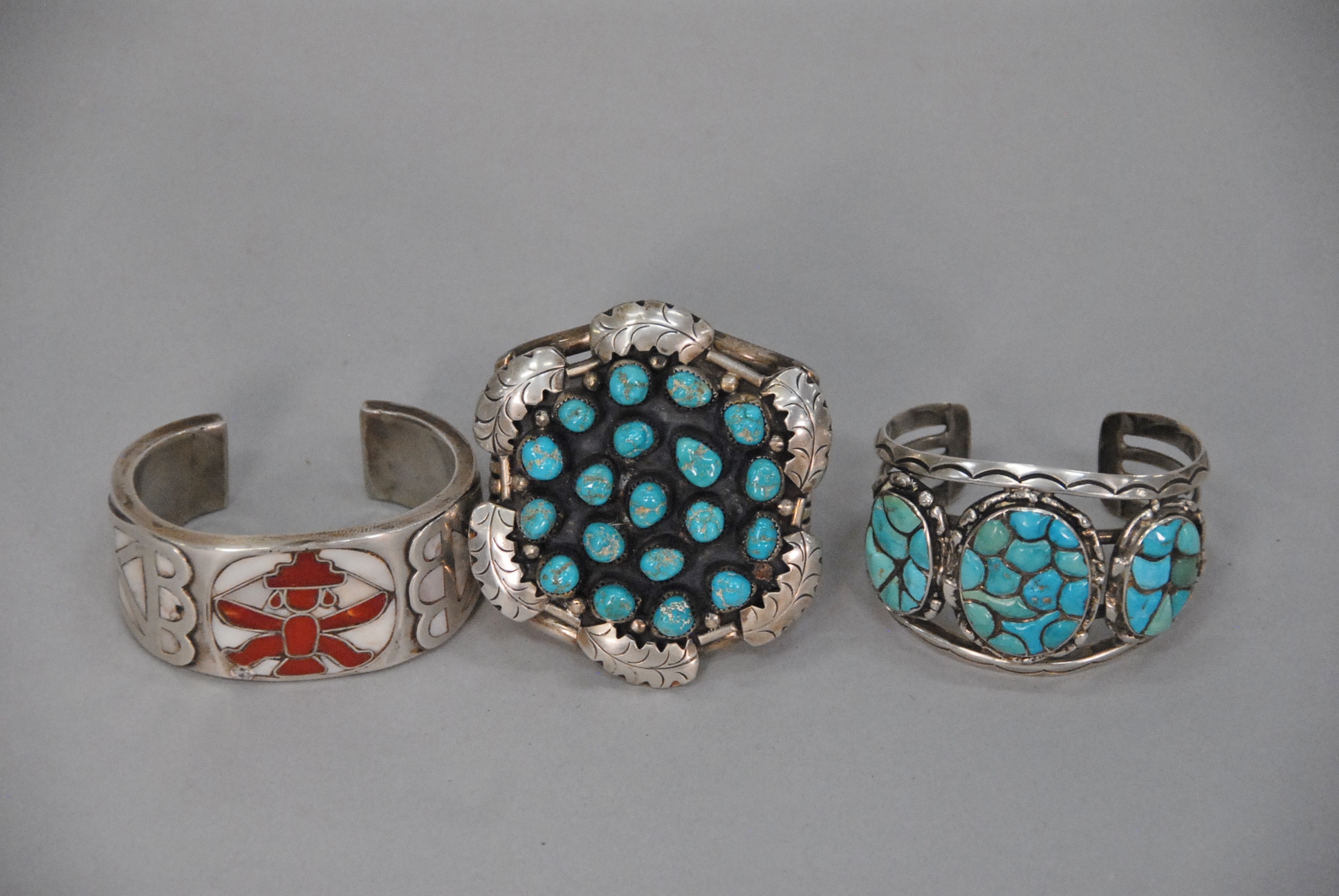 Three Southwest United States silver bracelets mounted with turquois, one inlaid red and white stones, one signed R1HJ and one signed KST1. total weight 9.4 t oz.