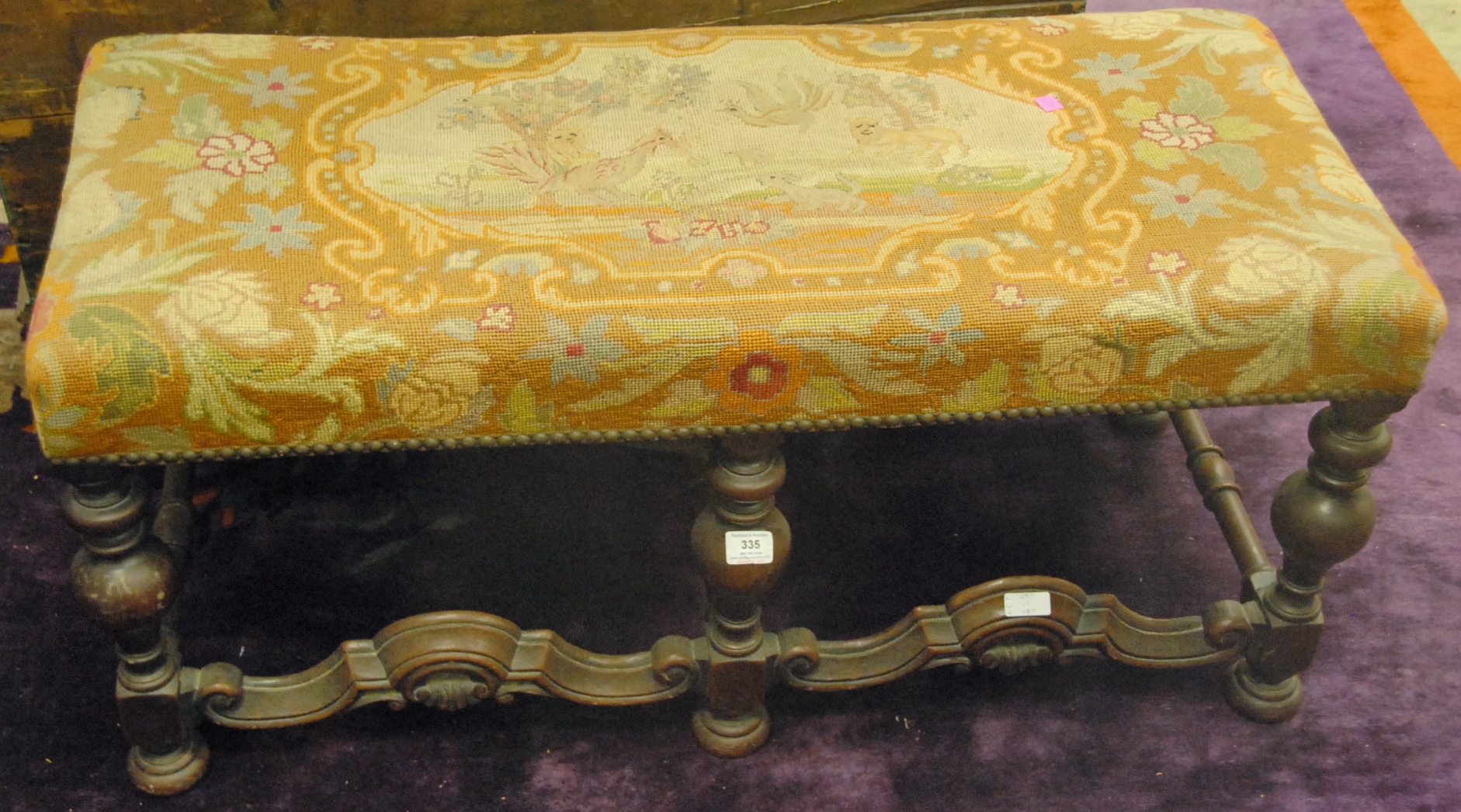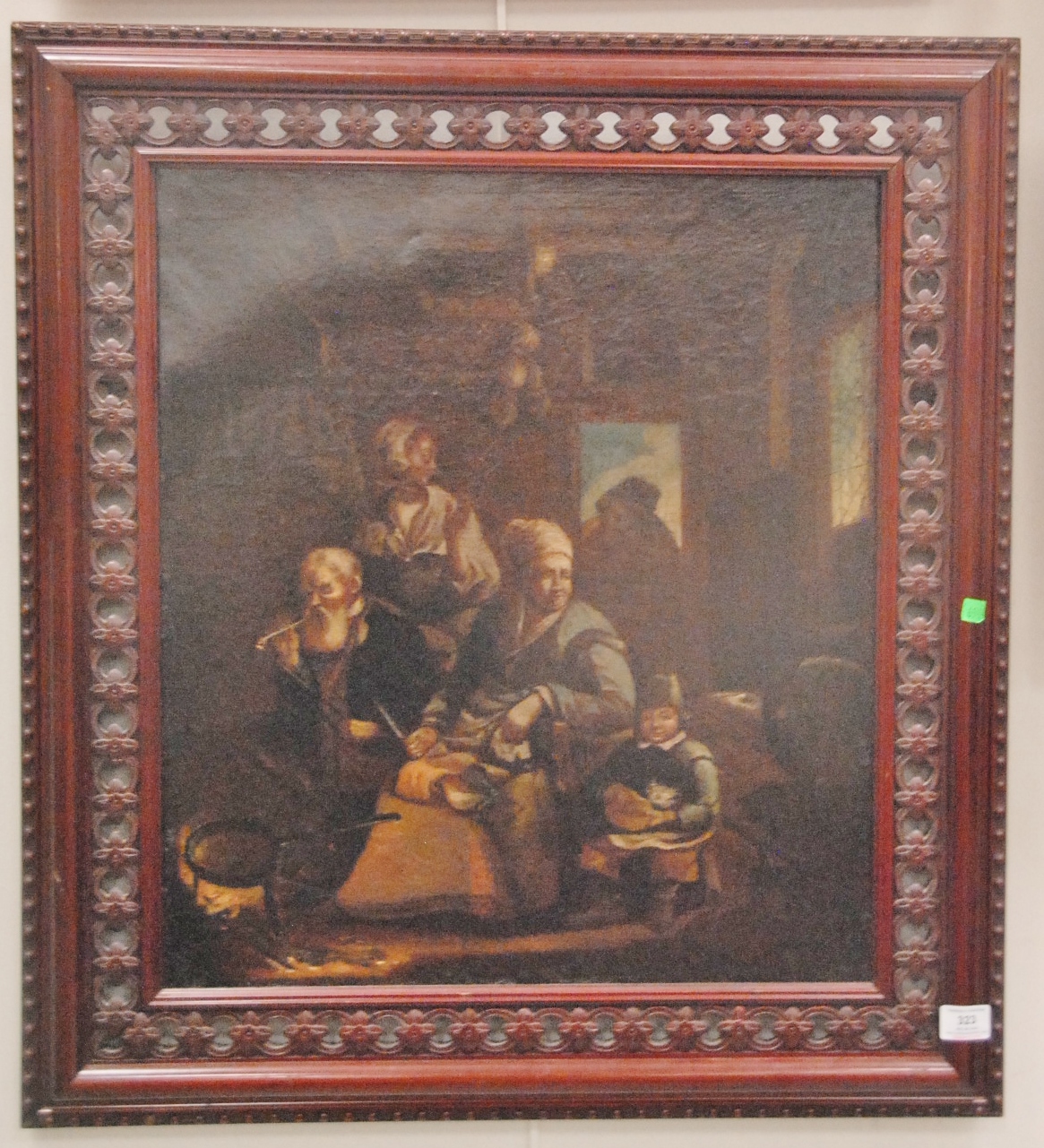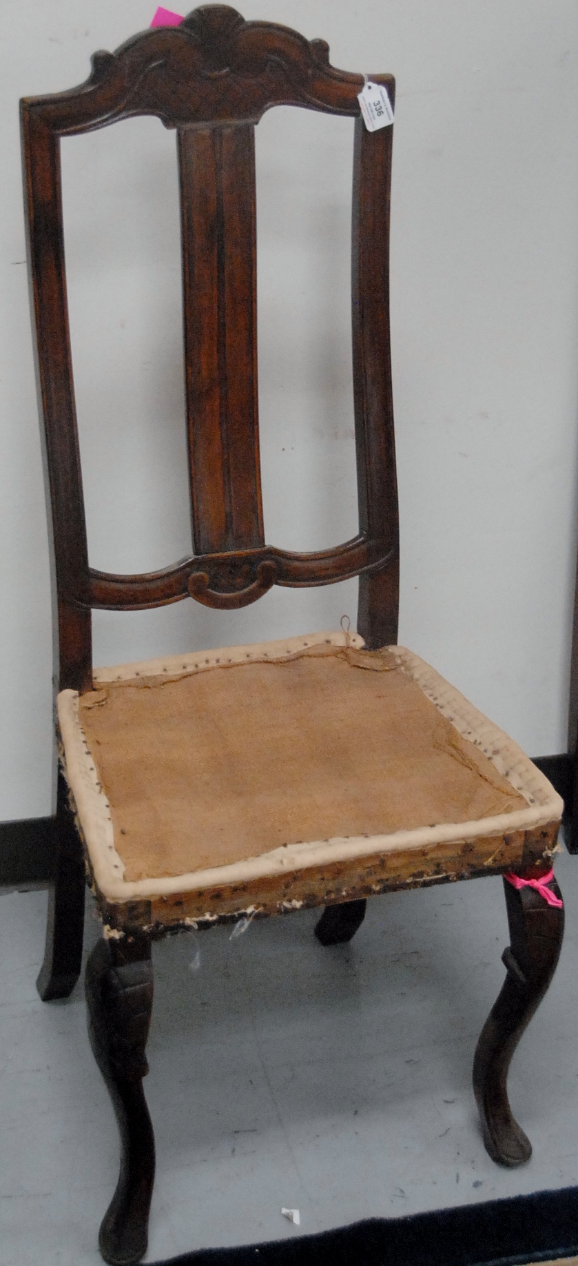 Queen Anne walnut side chair having carved crest rail, un-upholstered plain seat, on cabriole legs ending in pad feet circa 1740 missing two stretchers