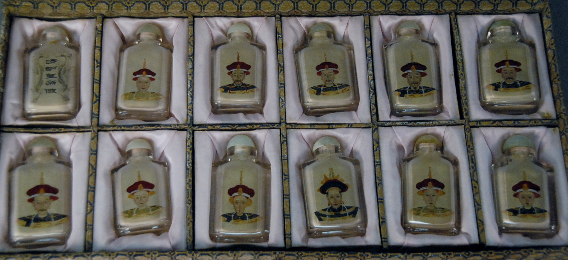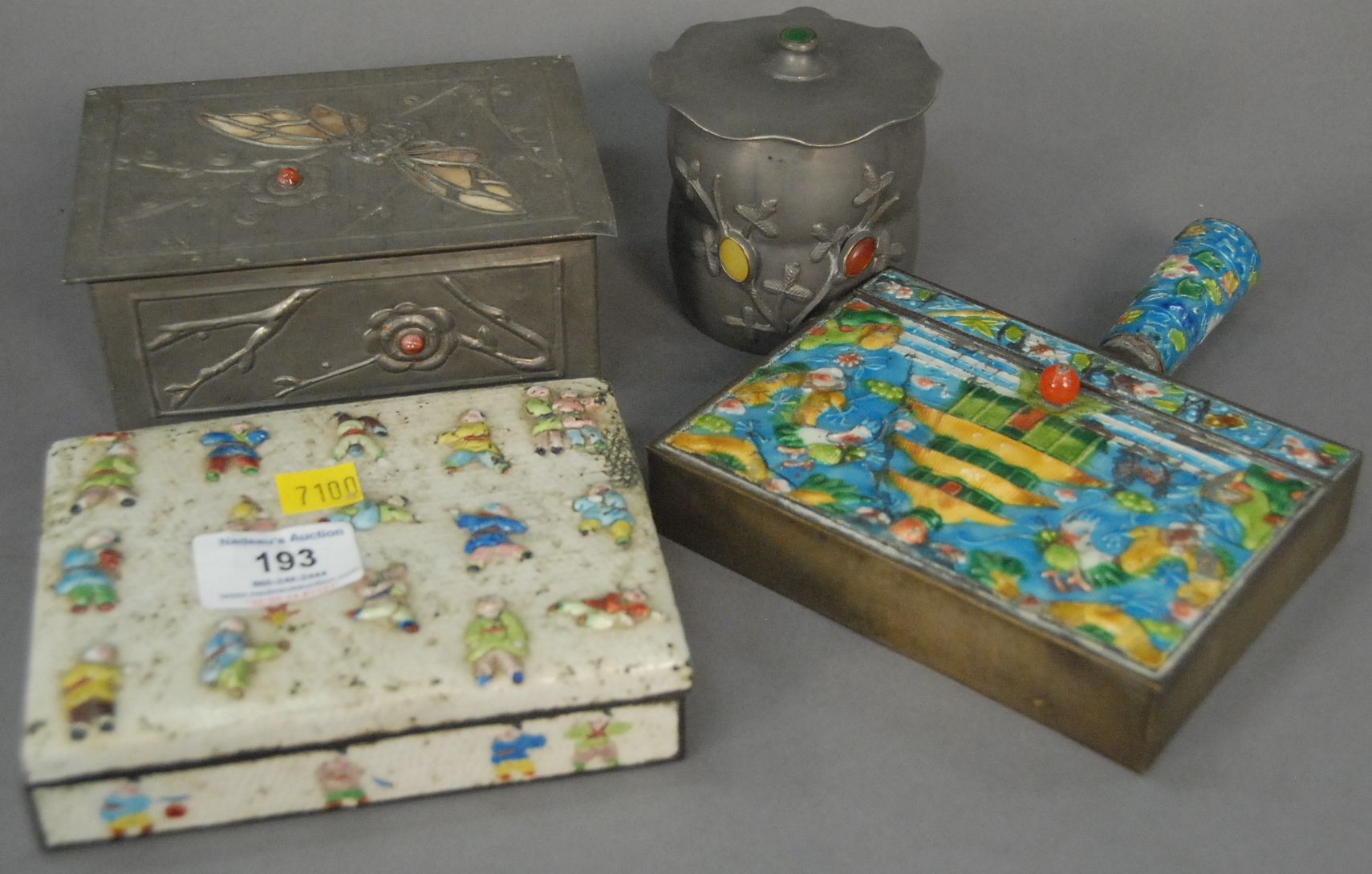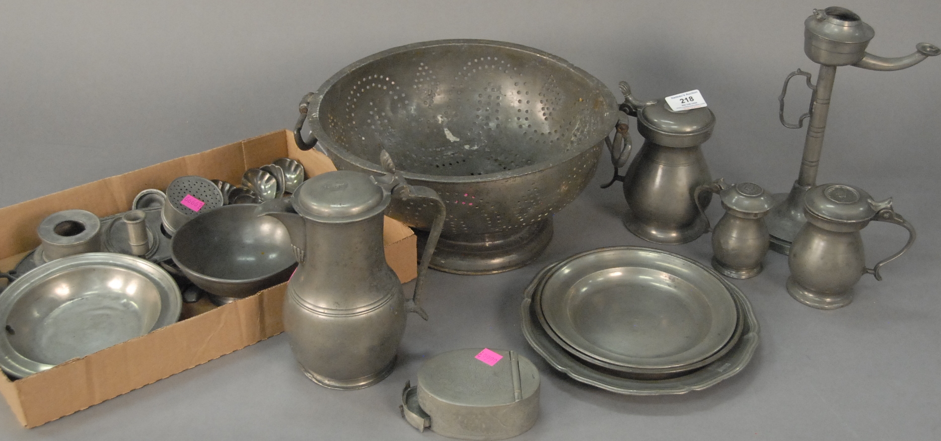 Pewter lot including four graduated mugs, ink desk set, plates, Oriental box with drawer and lift top having interior mirror, and large pewter colander.