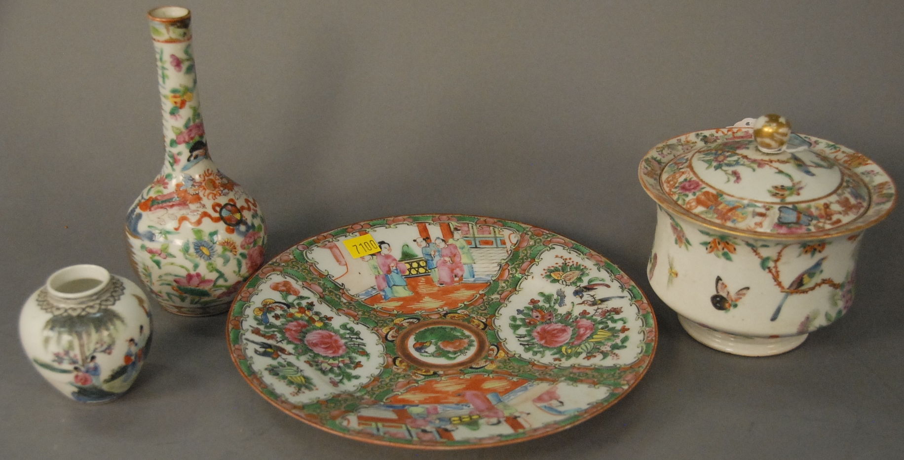 Four Chinese porcelain pieces to include a small bottle vase a Famille Rose covered jar with butterflies, blossoming flowers, and birds small Republic bud vase and Rose Famille plate.