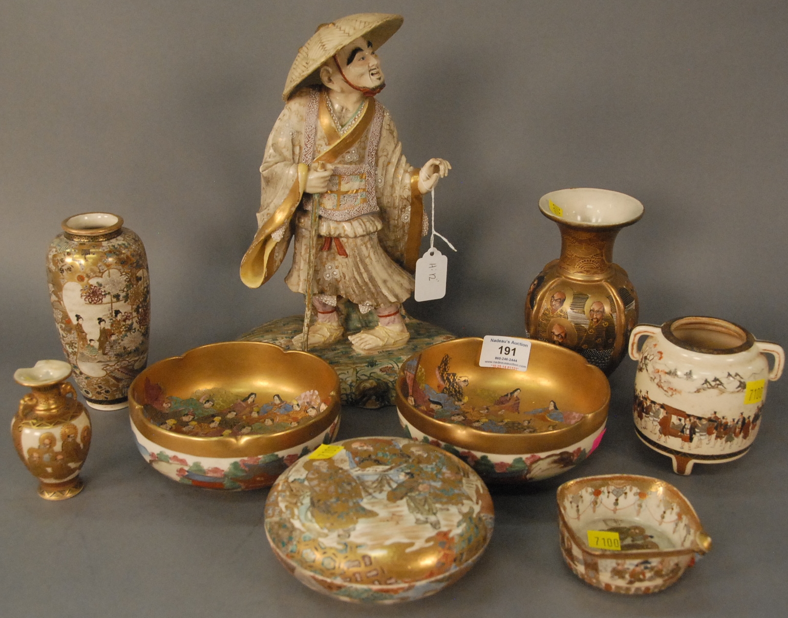 Group of nine Satsuma pieces to include a pair of bowls, scholar vase, round covered box, two small vases, small bowl, jar missing cover, and Satsuma figure of a scholar. bowls: dia. 6 in.