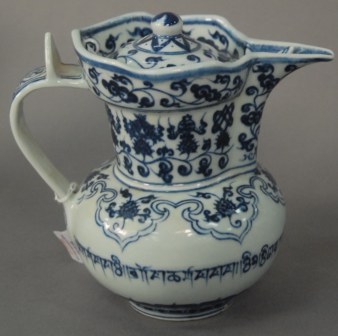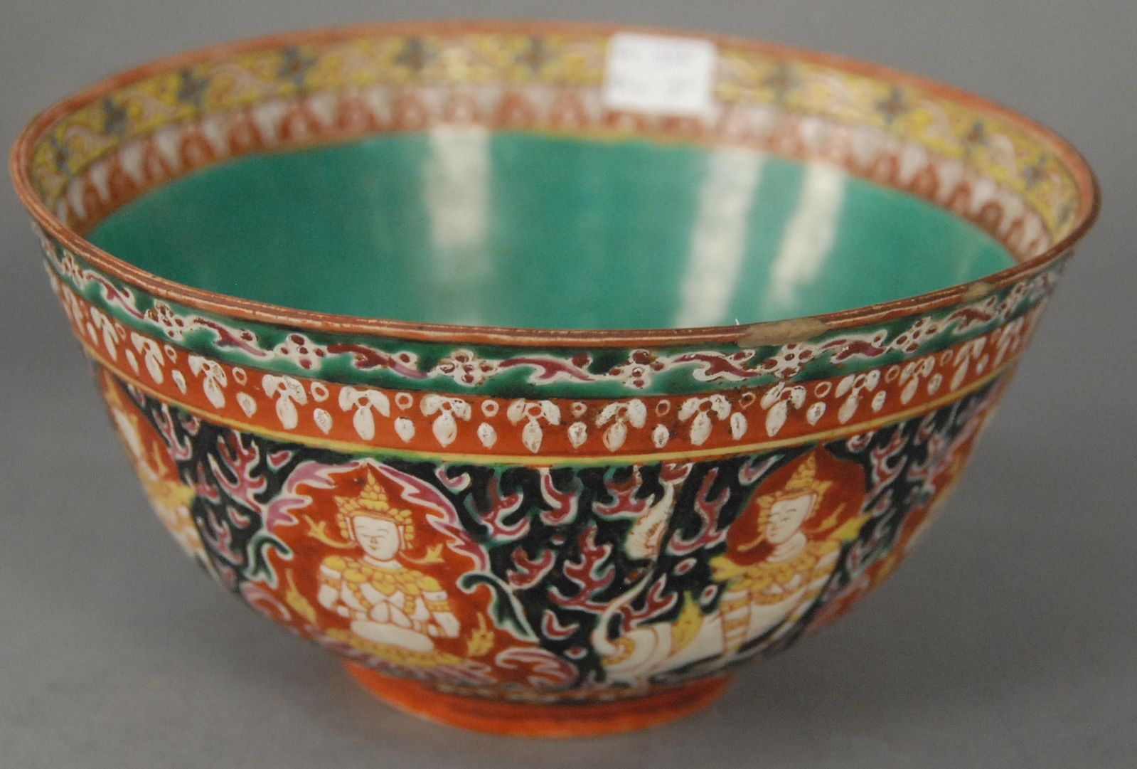 Chinese Benjarong porcelain bowl painted to depict figure of Buddha with turquoise interior with floral bands, made for the Thai Market, 18th to 19th century small hairline crack and small repaired chip. ht. 3 1/2 in. dia. 7 in.