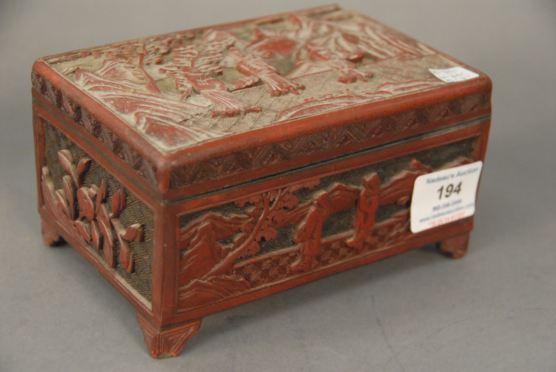 Antique Chinese cinnabar covered box. ht. 31 1/2 in. wd. 6 1/4 in. dp. 4 in. Provenance: Property from The Estate of Margaret Oliphant of Old Lyme, Connecticut