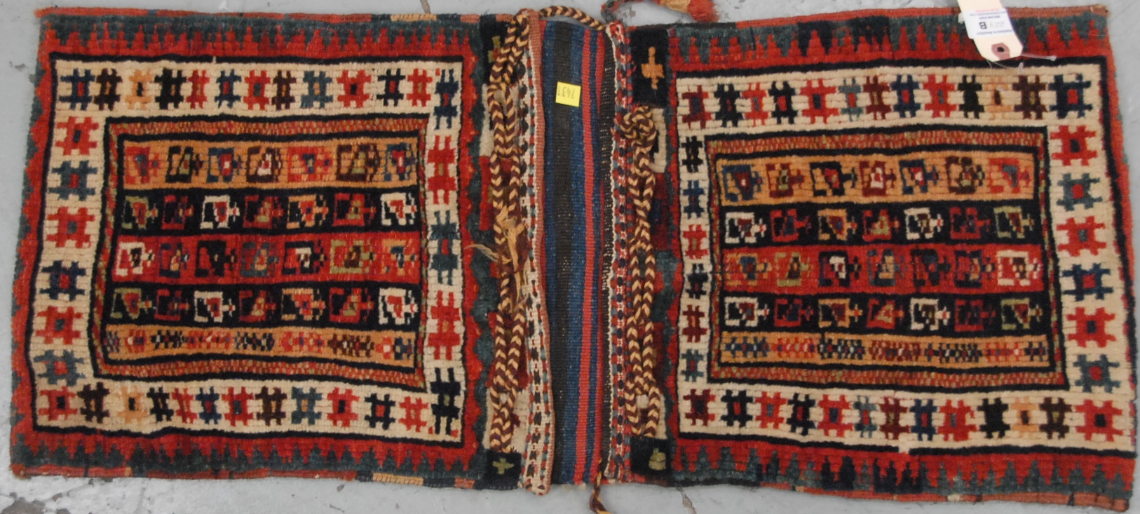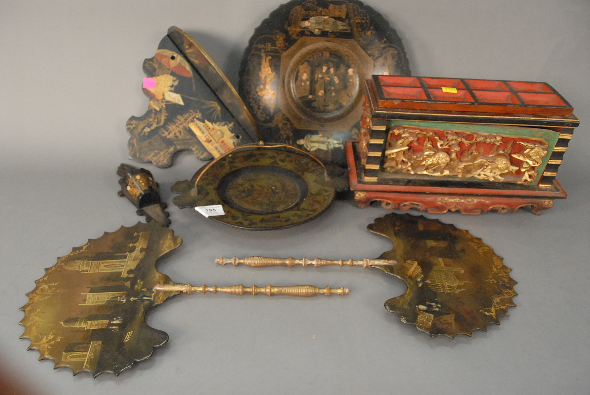 Group of six Chinese lacquered hand painted pieces to include a pair of shell fans, a match holder, two compotes, a shelf, and a painted box with carved panel having scrolling pines and animals.
