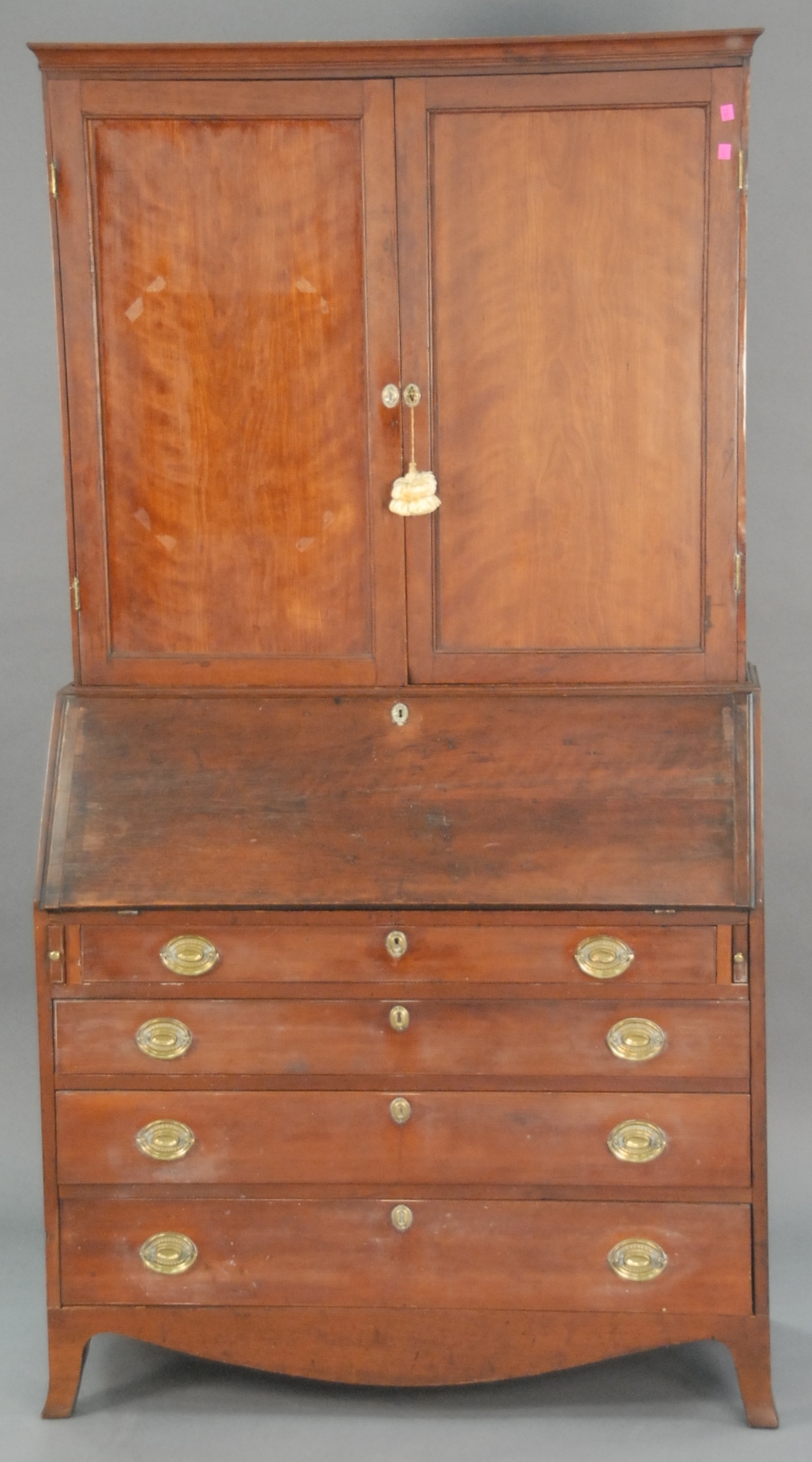 Federal cherry secretary desk in two parts, upper section with two blind doors on lower section with slant lid over four drawers, all set on French feet, circa 1790-1810. ht. 78 in. wd. 41 1/2 in. dp. 18 1/2 in. Provenance: Property from The Estate of W. Scott Van Alstyne of Essex, Connecticut.