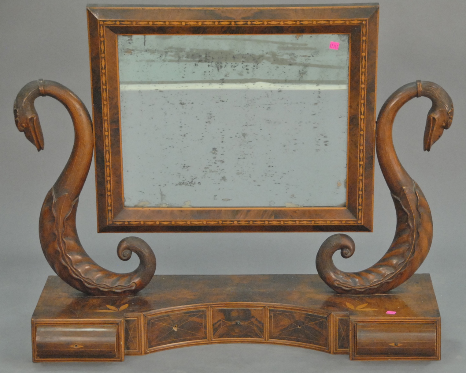 Federal walnut shaving mirror, mirror with diamond, circle, and line inlays supported by intricately carved swans necks with line inlays on base having five drawers with leaf and line inlays. ht. 32 in. wd. 36 in.