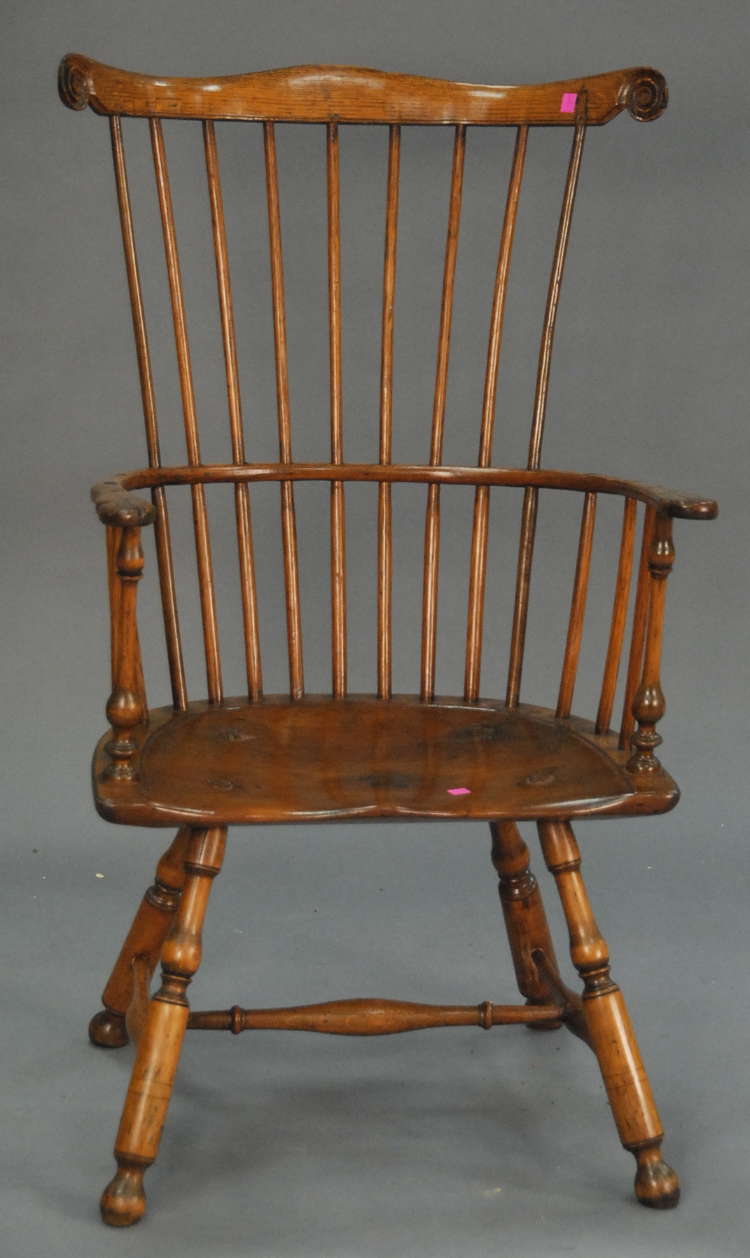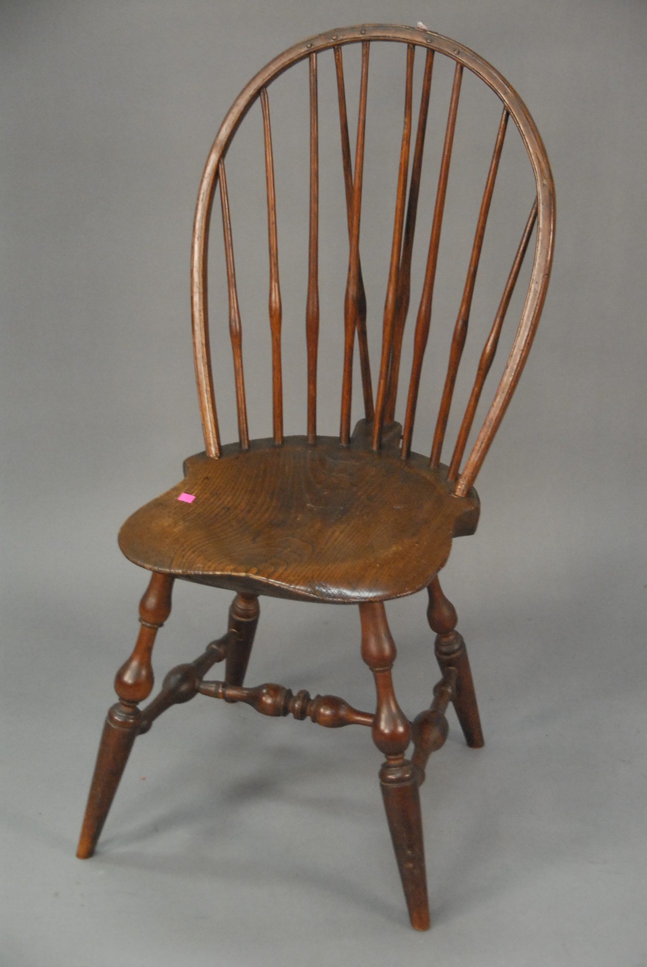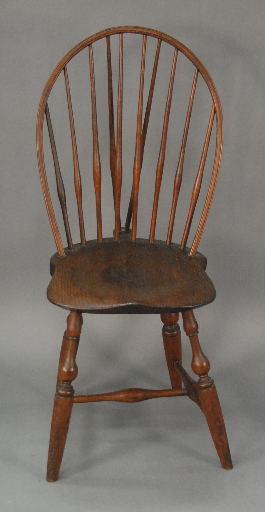 E. B. Tracy Windsor bowback side chair with bracket back and saddle seat, and bold turned legs and stretchers, signed on bottom E. B. Tracy. seat ht. 17 1/4 in. total ht. 37 1/2 in. Provenance: Property from the Estate of Elizabeth and Edward Wallace of The Tracy House in Meriden, Connecticut.