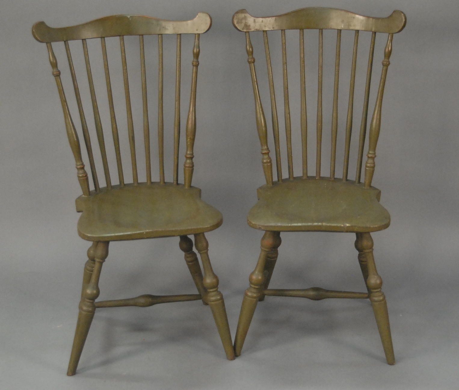 Pair of Windsor fan back side chairs with bold turned legs in newer green paint, signed on bottom E. B. Tracy. seat ht. 17 in. & seat ht. 17 1/4 in. Provenance: Property from the Estate of Elizabeth and Edward Wallace of The Tracy House in Meriden, Connecticut.