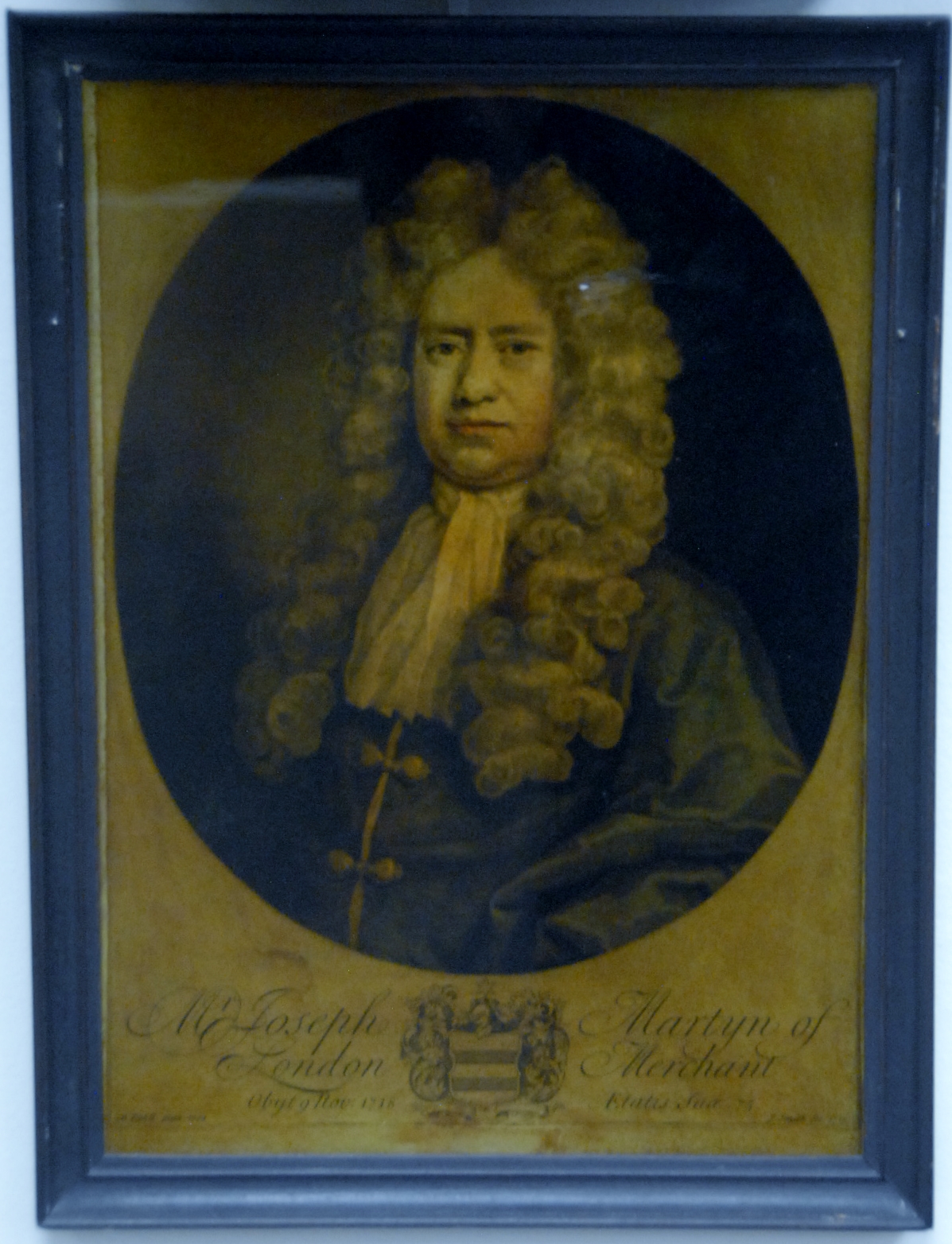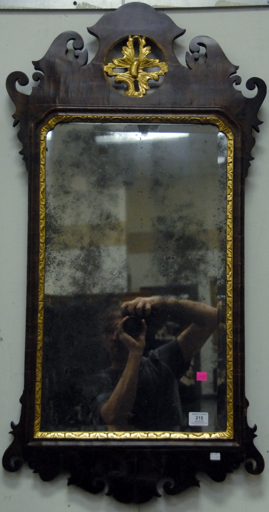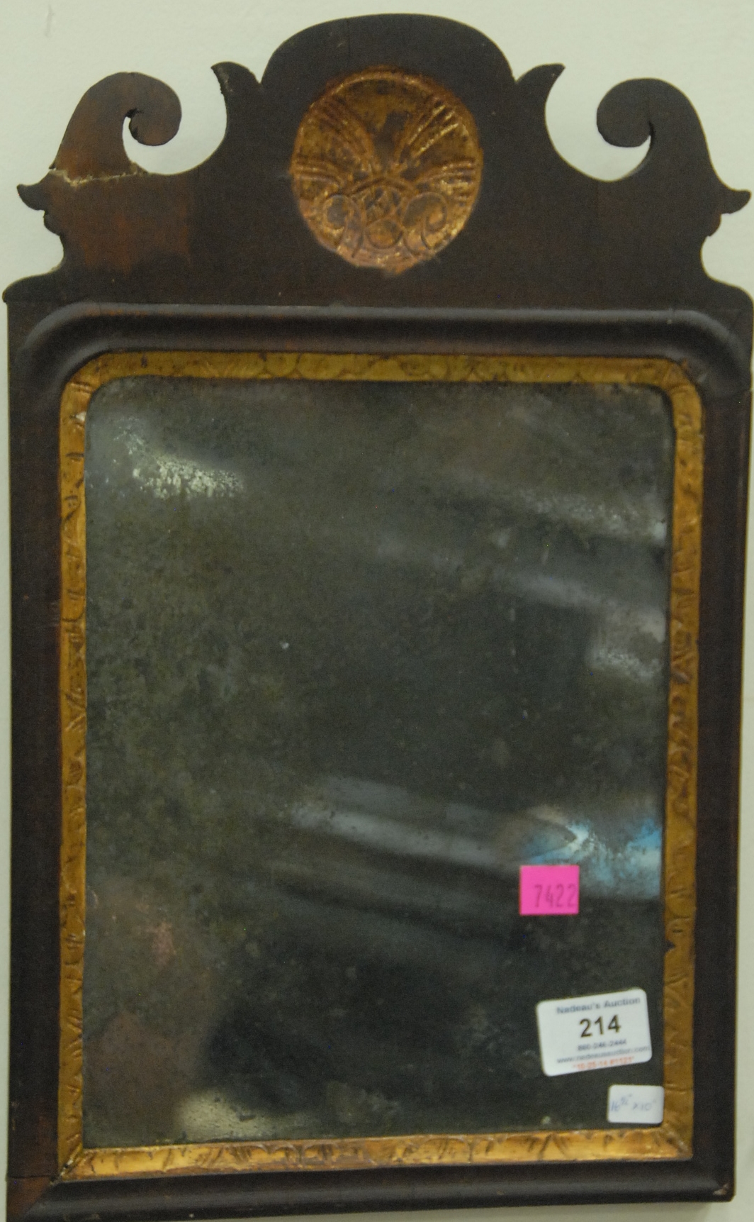 Queen Anne mahogany mirror with gilt shell top and old glass one ear repaired. ht. 16 1/2 in. wd. 10 in. Provenance: Property from the Estate of Elizabeth and Edward Wallace of The Tracy House in Meriden, Connecticut.