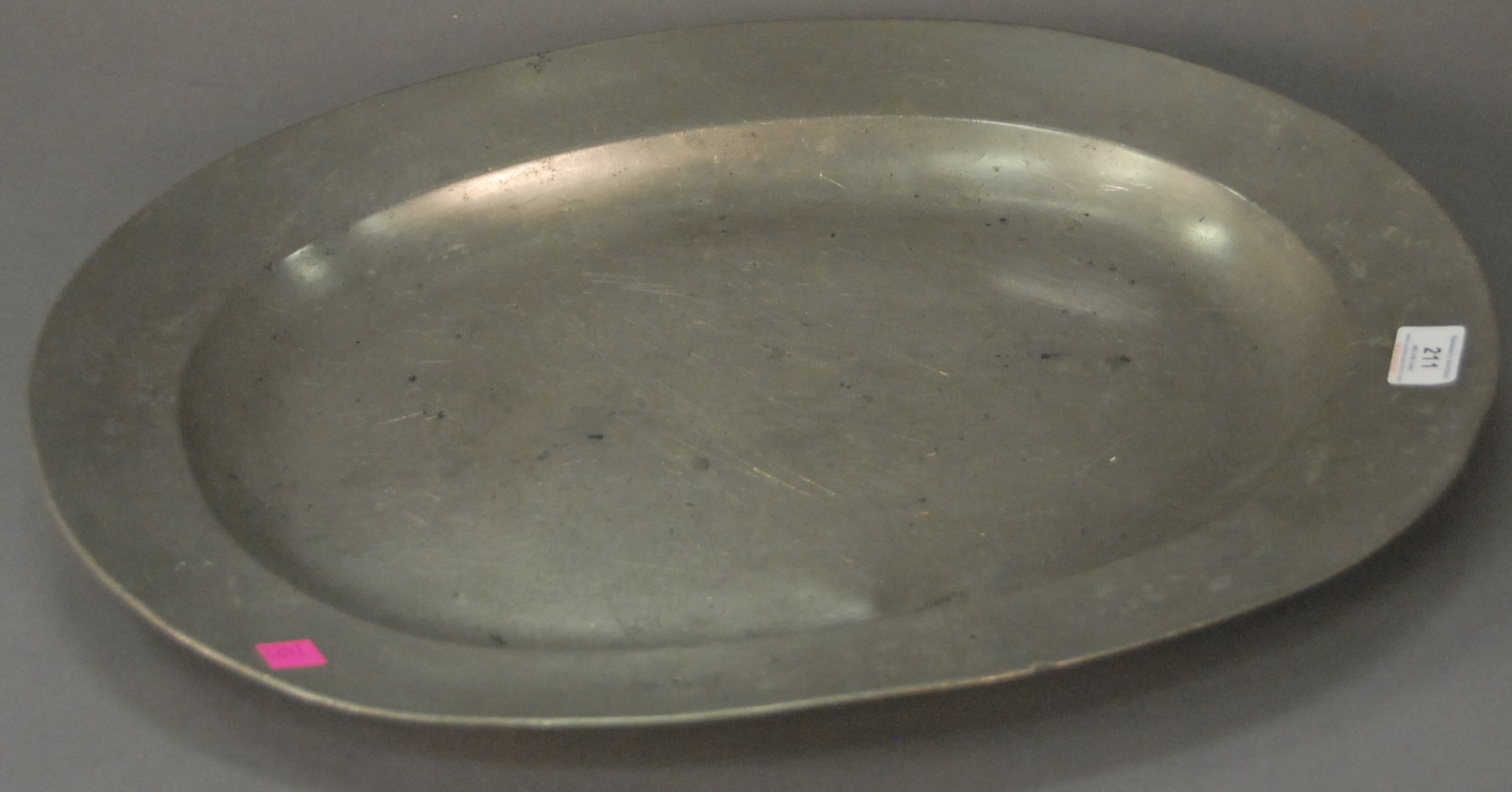 Pewter deep oval platter. 17 1/4 x 22 3/4 Provenance: Property from the Estate of Elizabeth and Edward Wallace of The Tracy House in Meriden, Connecticut.