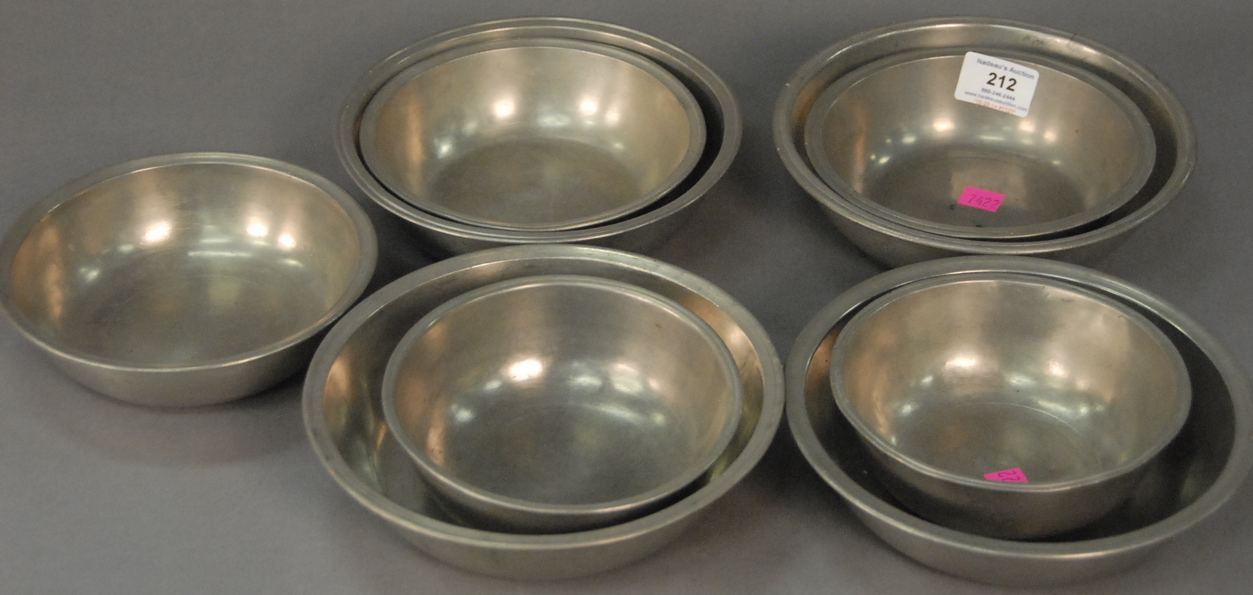 Nine pewter basins, one marked Wm. Kurt another attributed to Theo. Boardman. dia. 6 in., dia. 6 1/2 in., & dia. 8 in. Provenance: Property from the Estate of Elizabeth and Edward Wallace of The Tracy House in Meriden, Connecticut.