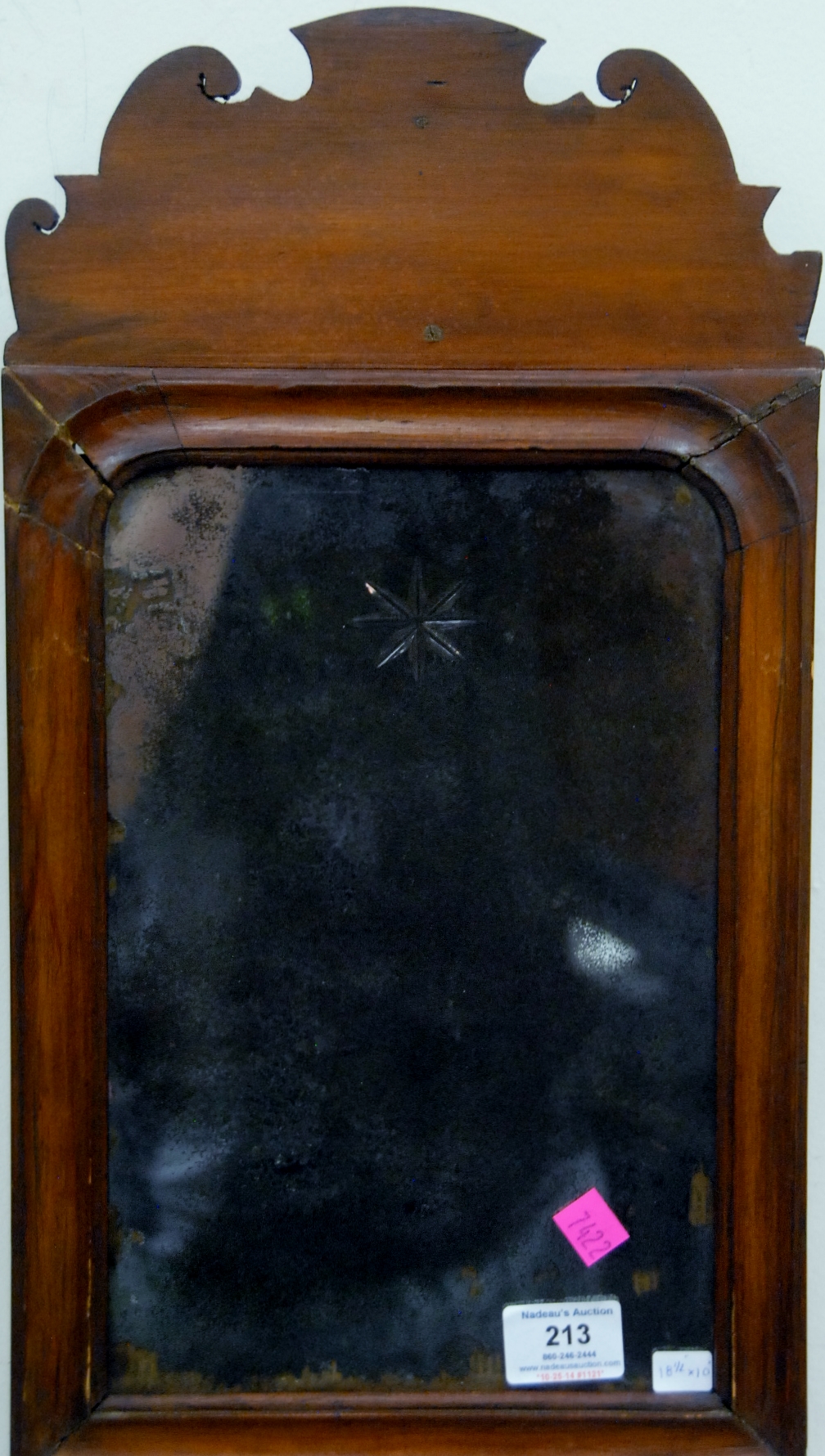 Queen Anne mirror with carved top, old glass with star in top, 18th century. ht. 18 1/2 in. wd. 10 in. Provenance: Property from the Estate of Elizabeth and Edward Wallace of The Tracy House in Meriden, Connecticut.
