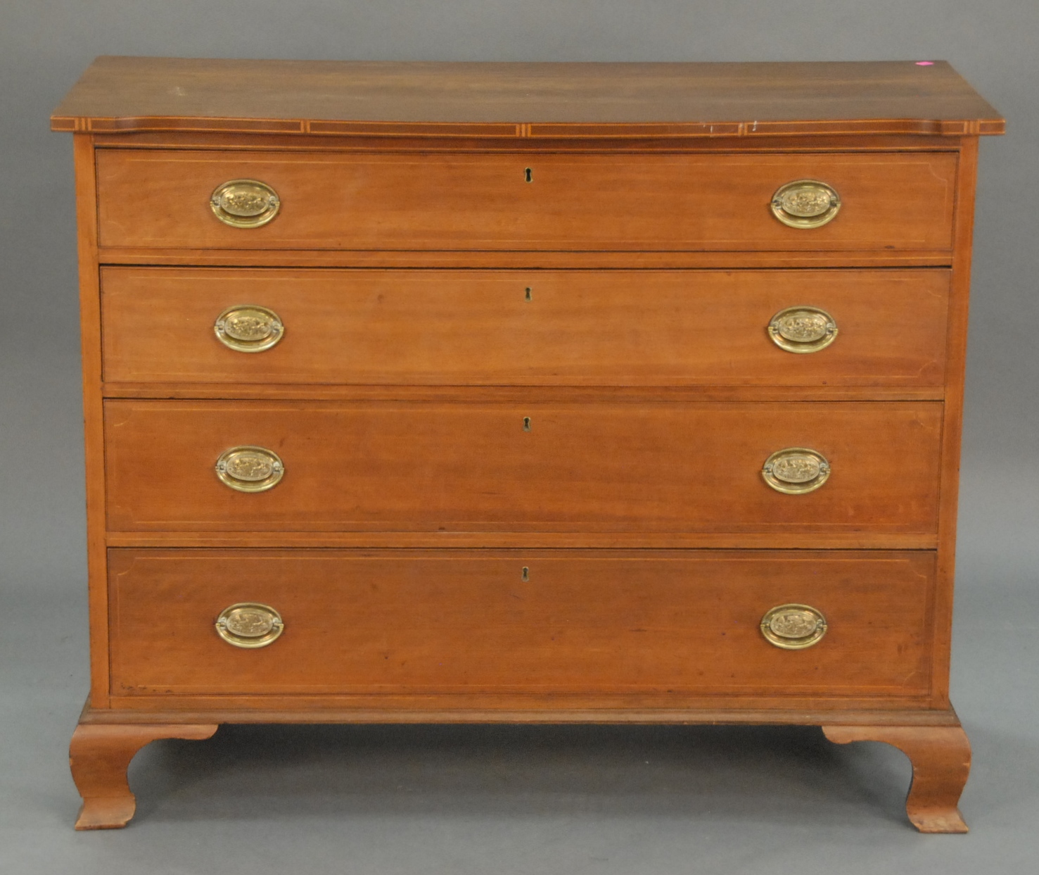 Chippendale chest having shaped top with inlaid edge over four drawers on ogee bracket base, 18th century. ht. 37 in. wd. 44 1/4 in. dp. 18 in. Provenance: Property from The Estate of W. Scott Van Alstyne of Essex, Connecticut.