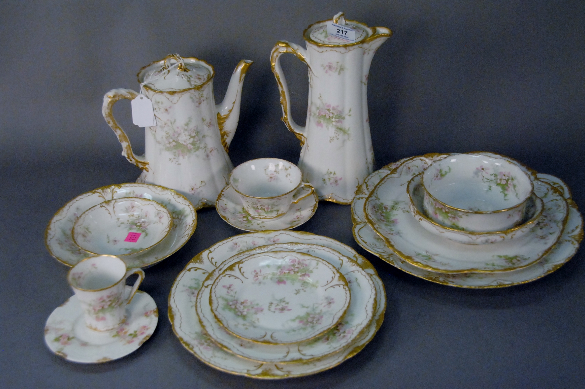 Theodore Haviland Limoges France porcelain dinner set with serving pieces, 127 total pieces including twelve berry bowls, twelve soup bowls, twelve dinner plates, eleven salad plates, twelve bread and butter plates, and other miscellaneous serving pieces.