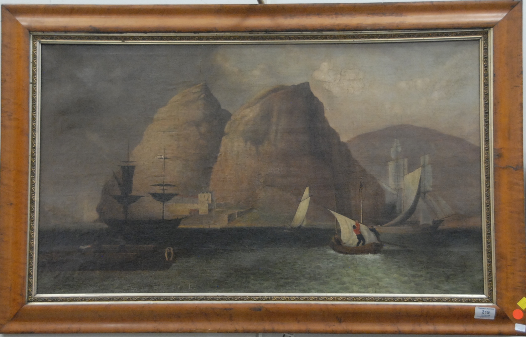 19th Century painting SHIPS OFF COAST WITH CASTLE oil on canvas unsigned label on verso Painted by Joseph Bryan Jr. circa 1854 21 x 36 Provenance: Property from The Estate of Margaret Oliphant of Old Lyme, Connecticut