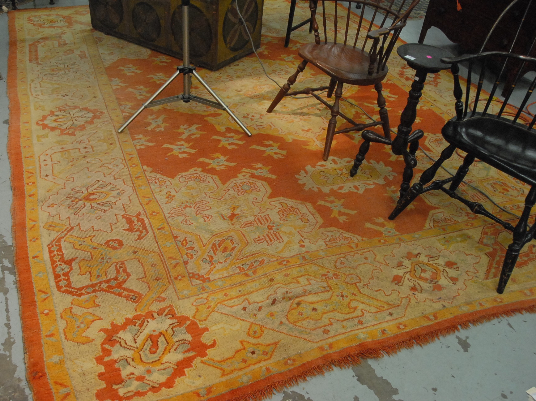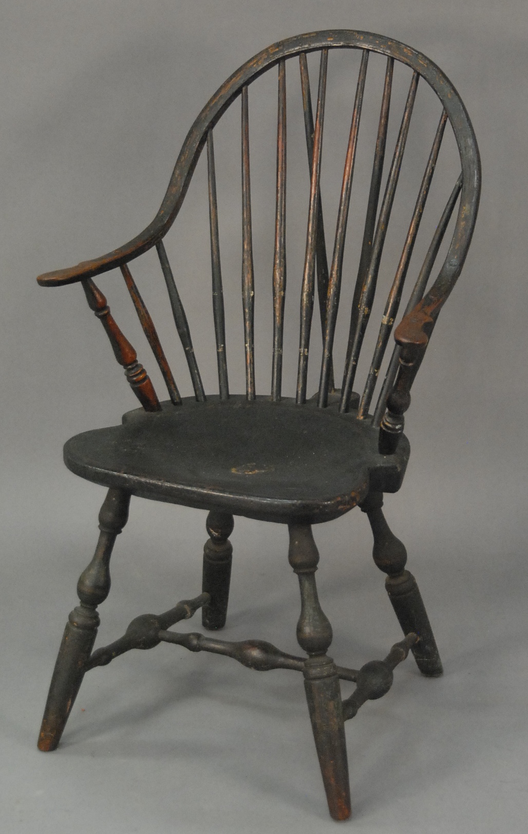 E. B. Tracy continuous arm Windsor chair having brace back with bold turned arm supports, legs, and stretchers, in old black paint and stenciling, signed on bottom E. B. Tracy. seat ht. 16 3/4 in. Provenance: Property from the Estate of Elizabeth and Edward Wallace of The Tracy House in Meriden, Connecticut.