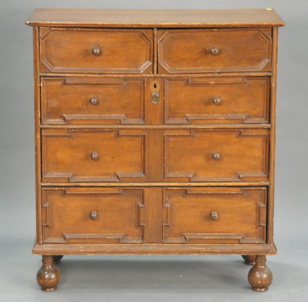 Ball foot chest having two short drawers over three long drawers, all with molded fronts, set on ball feet, late 17th to early 18th century refinished. ht. 40 in. wd. 34 in.