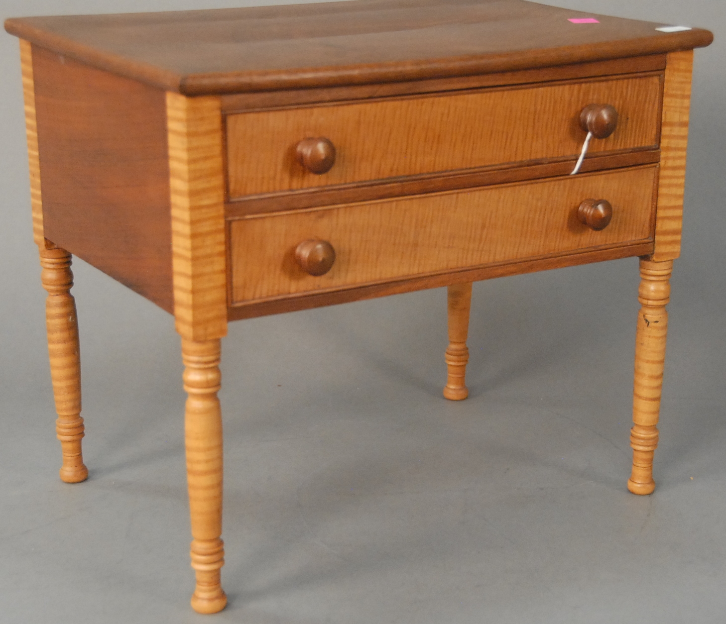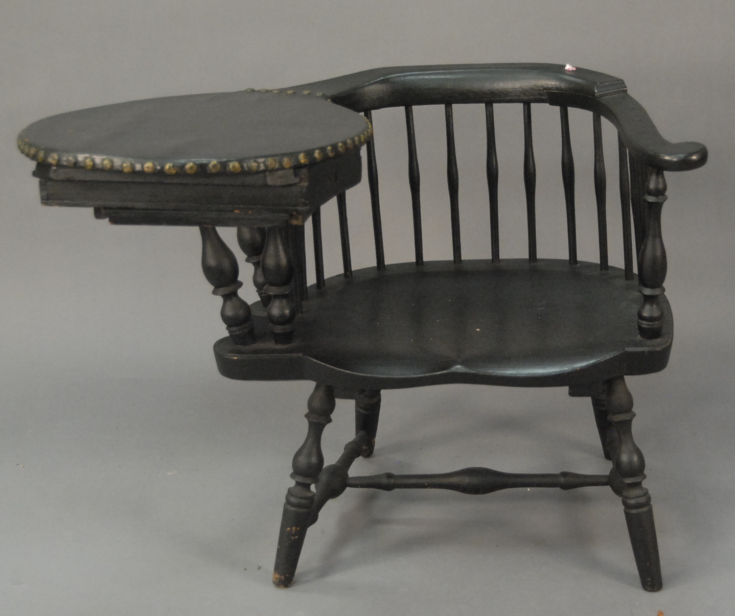 E. B. Tracy writing arm Windsor chair with drawer under writing surface, all with bold turned supports and legs with writing surface covered in leather, signed E. B. Tracy seat drawer missing. back ht. 28 in. seat ht. 15 1/4 in. Provenance: Property from the Estate of Elizabeth and Edward Wallace of The Tracy House in Meriden, Connecticut.